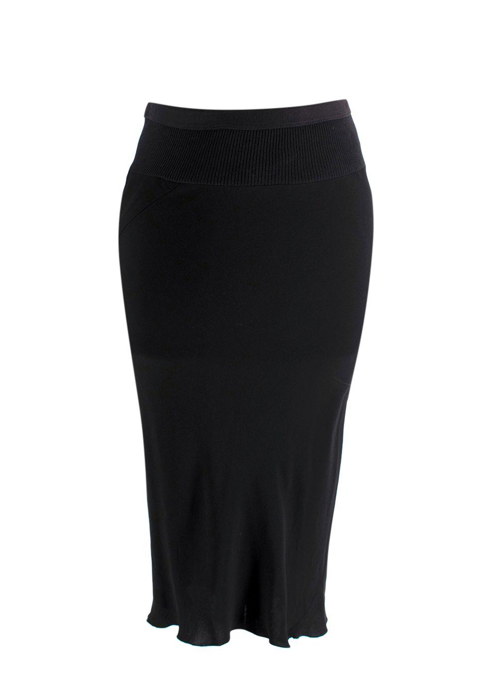 Sleek black midi skirt from Rick Owens’ Vicious Spring/Summer 2014 collection. Features a signature ribbed elastic waistband with a fluid, slightly flared hem that moves beautifully when worn. Minimalist and architectural, this piece reflects Rick Owens’ iconic dark aesthetic and expert tailoring. A timeless wardrobe staple suitable for both casual and elevated styling.