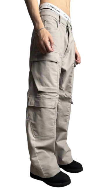 THESE DOUBLE CARGO JEANS ARE FULL LENGTH 5 POCKET JEAN WITH A LOW-RISE AND A LOOSE FIT. THEY HAVE A SILVER BUTTON FLY, BELT LOOPS AND POCKET RIVETS AND THEY FEATURE TWO BEVELED CARGO POCKETS ON THE THIGH, WITH TWO SQUARE CARGO POCKETS BELOW, AND TWO SQUARE BACK POCKETS, ALL HAVE FLAPS AND TOPSTITCHING.