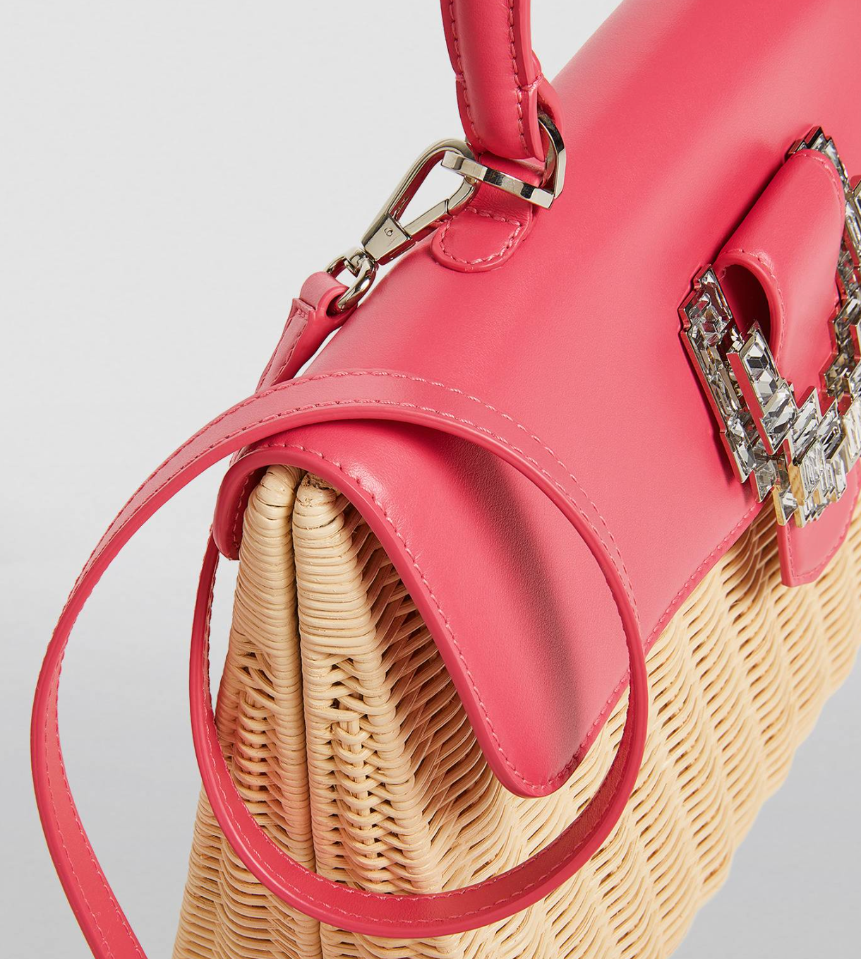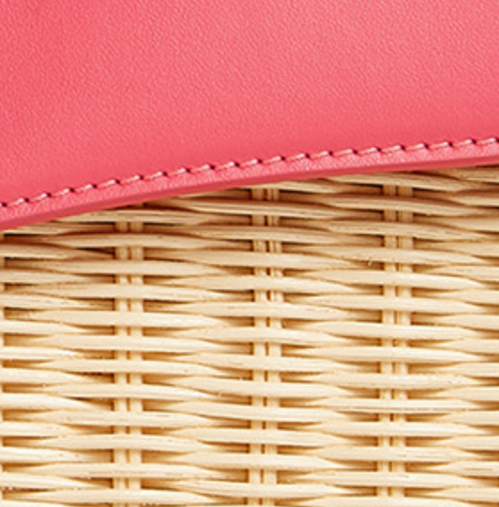 Materials: Woven wicker/rattan, genuine pink leather trim, and crystal hardware