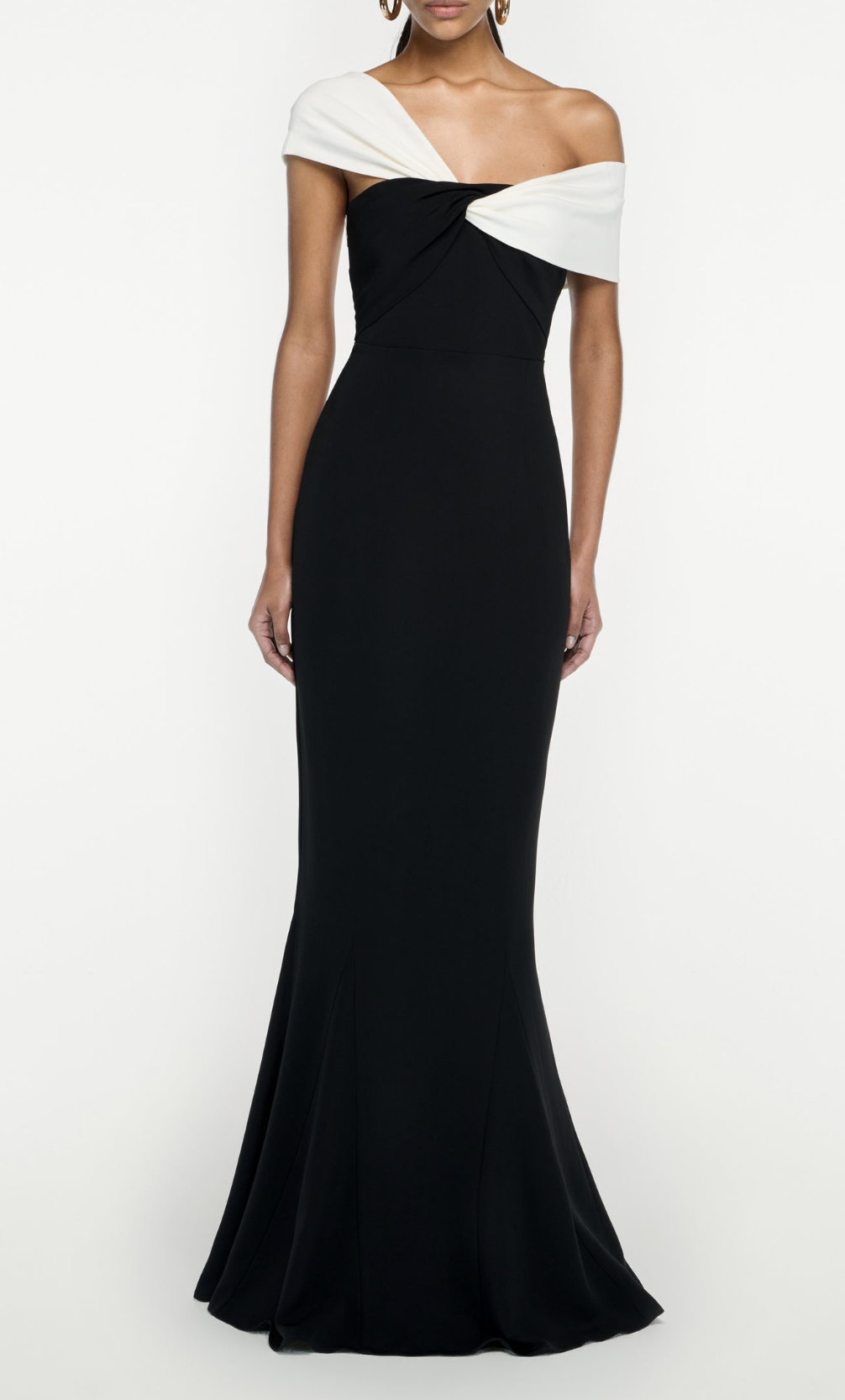 Asymmetric cady maxi dress with stretch falling to floor length in black and white. Featuring a fabric twist across the shoulder and bodice, internal corset and concealed zip fastening at the side.