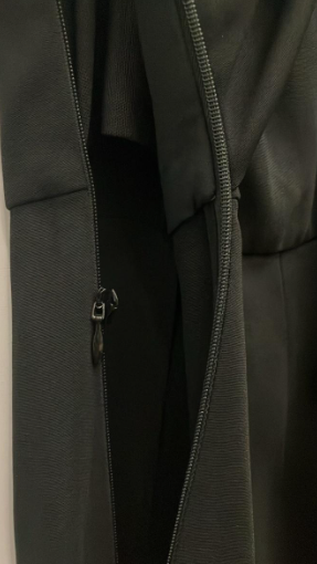Broken zip on the side of the dress. The left arm strap is starting to tear a little at the seam due to the weight of the dress. Small makeup stains.