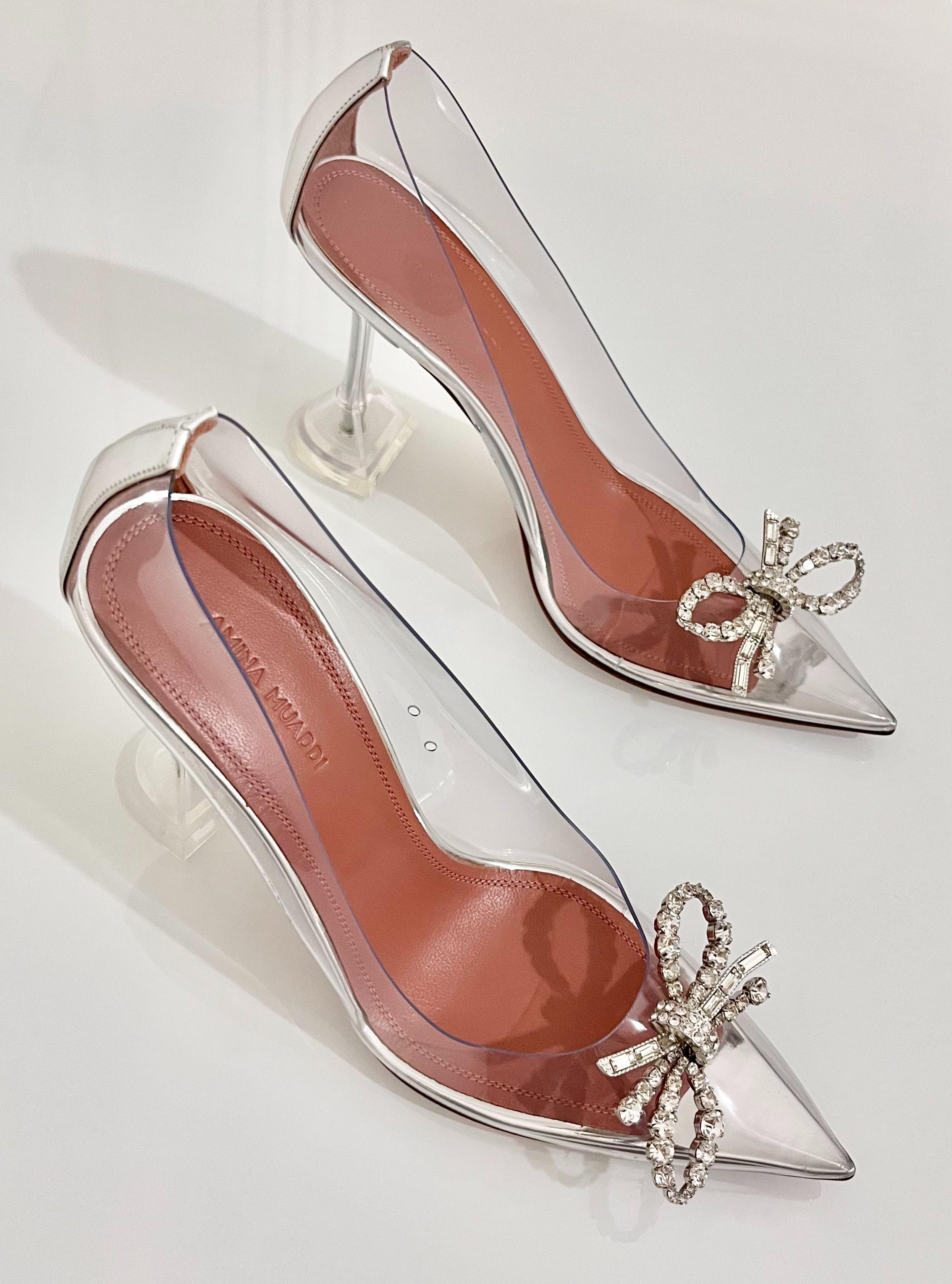 Iconic Amina Muaddi Rosie in leather and pvc fabric.