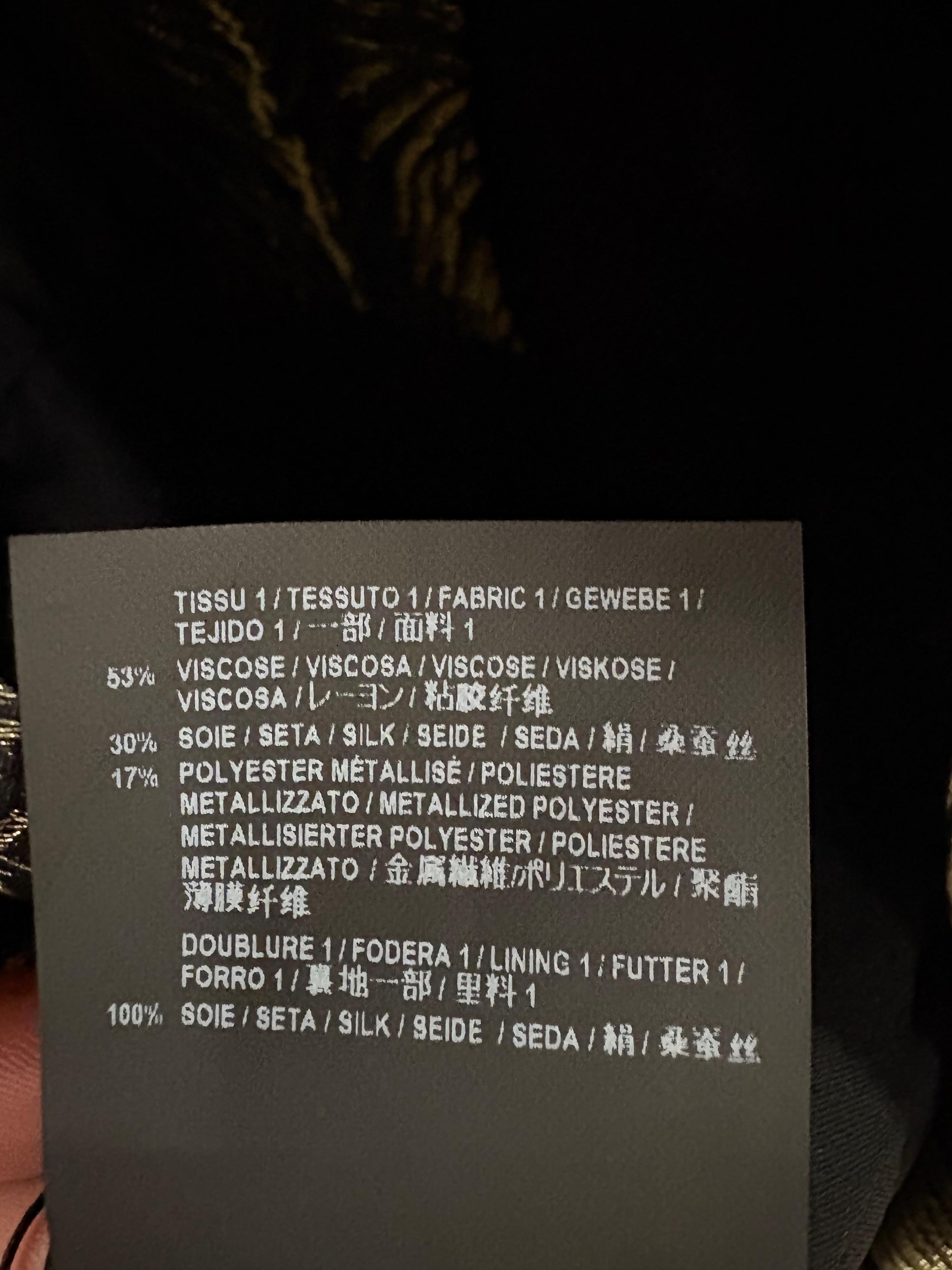 El tejido brocado con ligeros destellos dorados capta la luz, destacando la riqueza del patrón y convirtiéndolo en la opción ideal para eventos nocturnos. El forro de seda proporciona un acabado suave y lujoso, garantizando comodidad y un ajuste impecable.