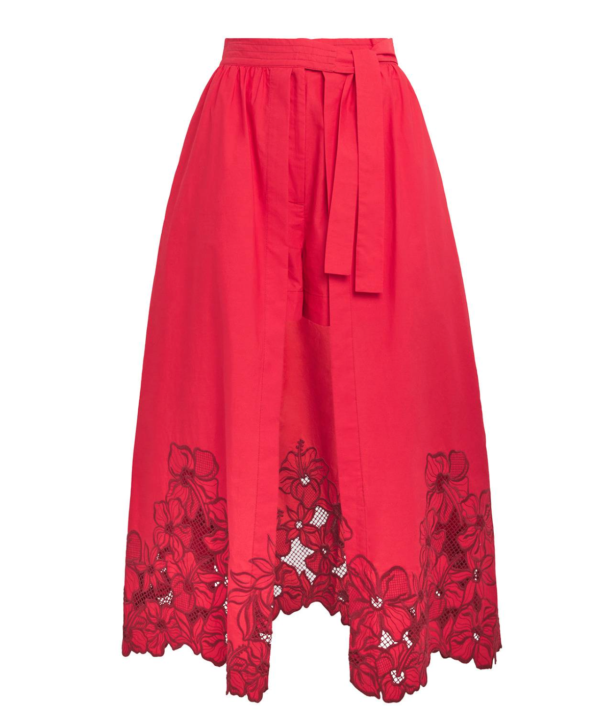 Layered-effect skirt shorts with a long panel, featuring guipure lace flowers on the bottom and ties at the waist.