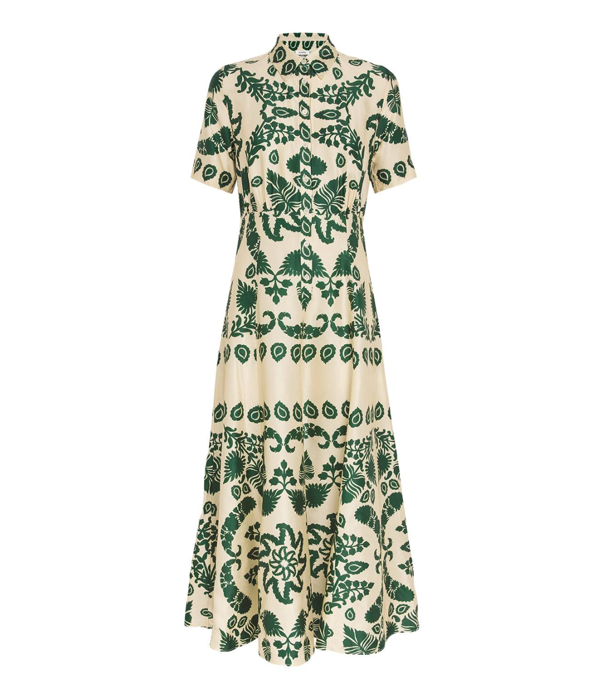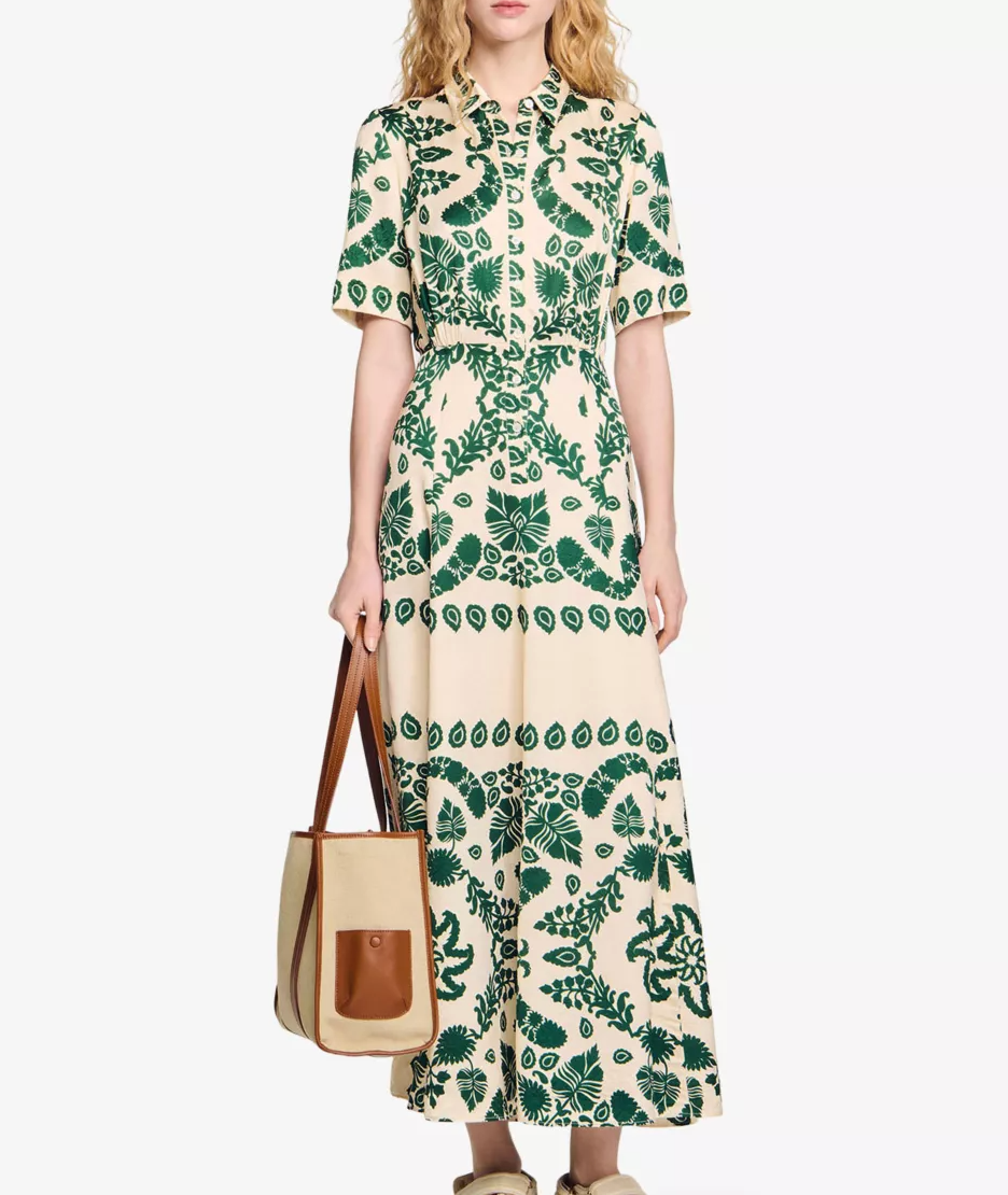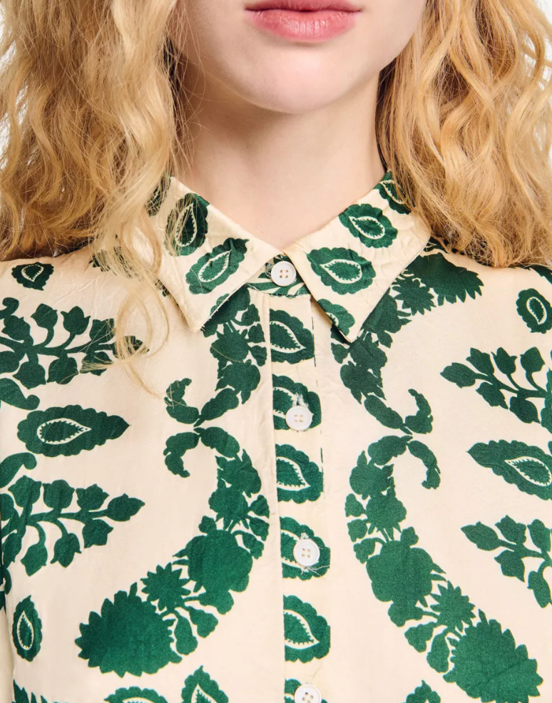 Regular fit, collar, short sleeves, all-over floral paisley print, crinkled satin texture, fitted waist, flared skirt, maxi length