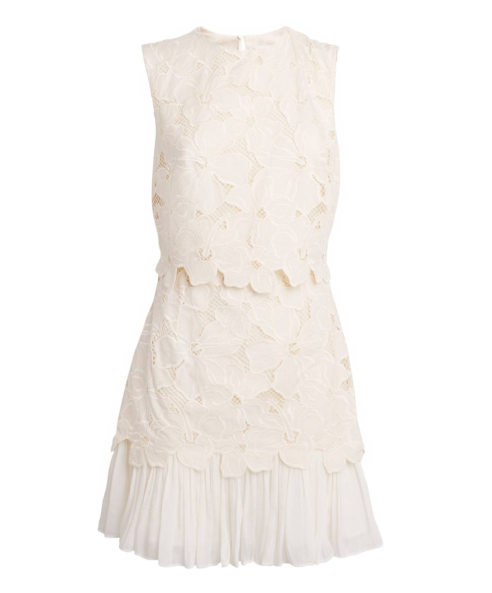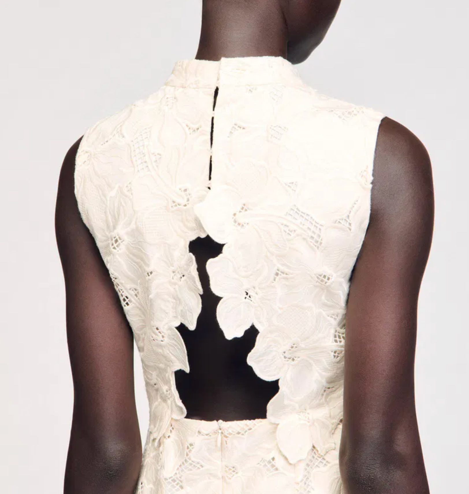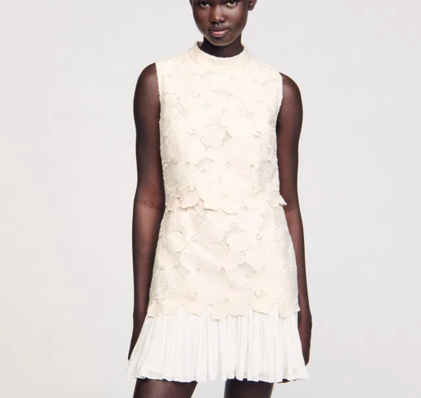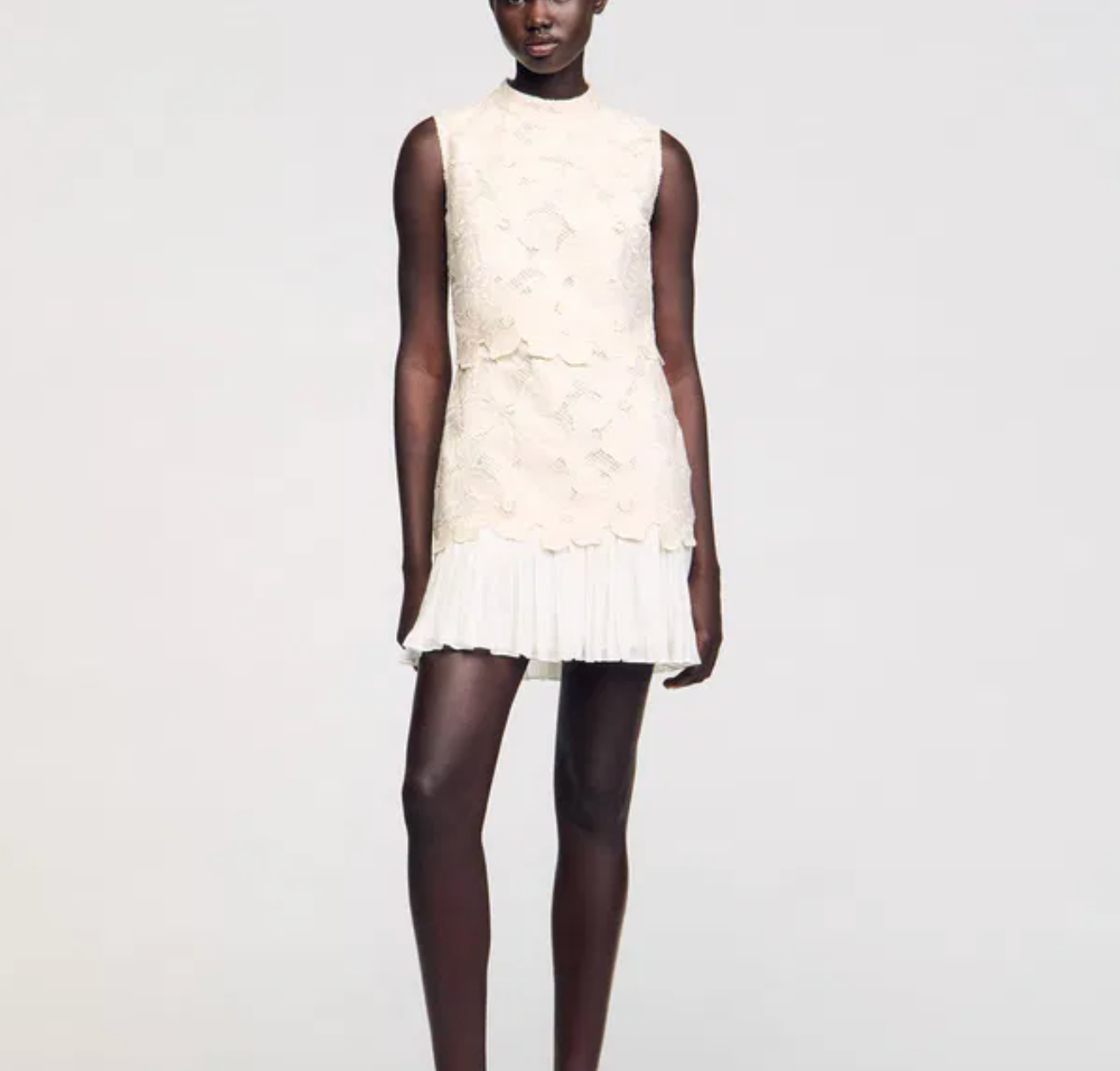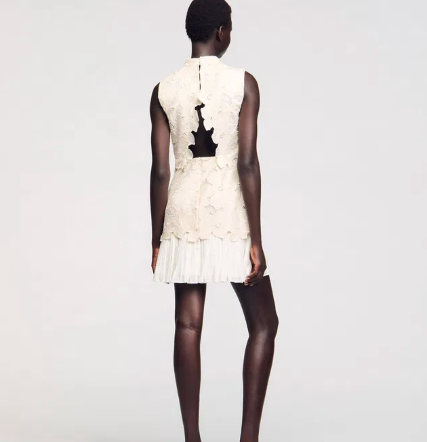 DESCRIPTION Sleeveless short dress in trompe-l'œil effect guipure, with back opening and flounced skirt. Sleeveless short dress in trompe-l'œil effect guipure, with back opening and flounced skirt.