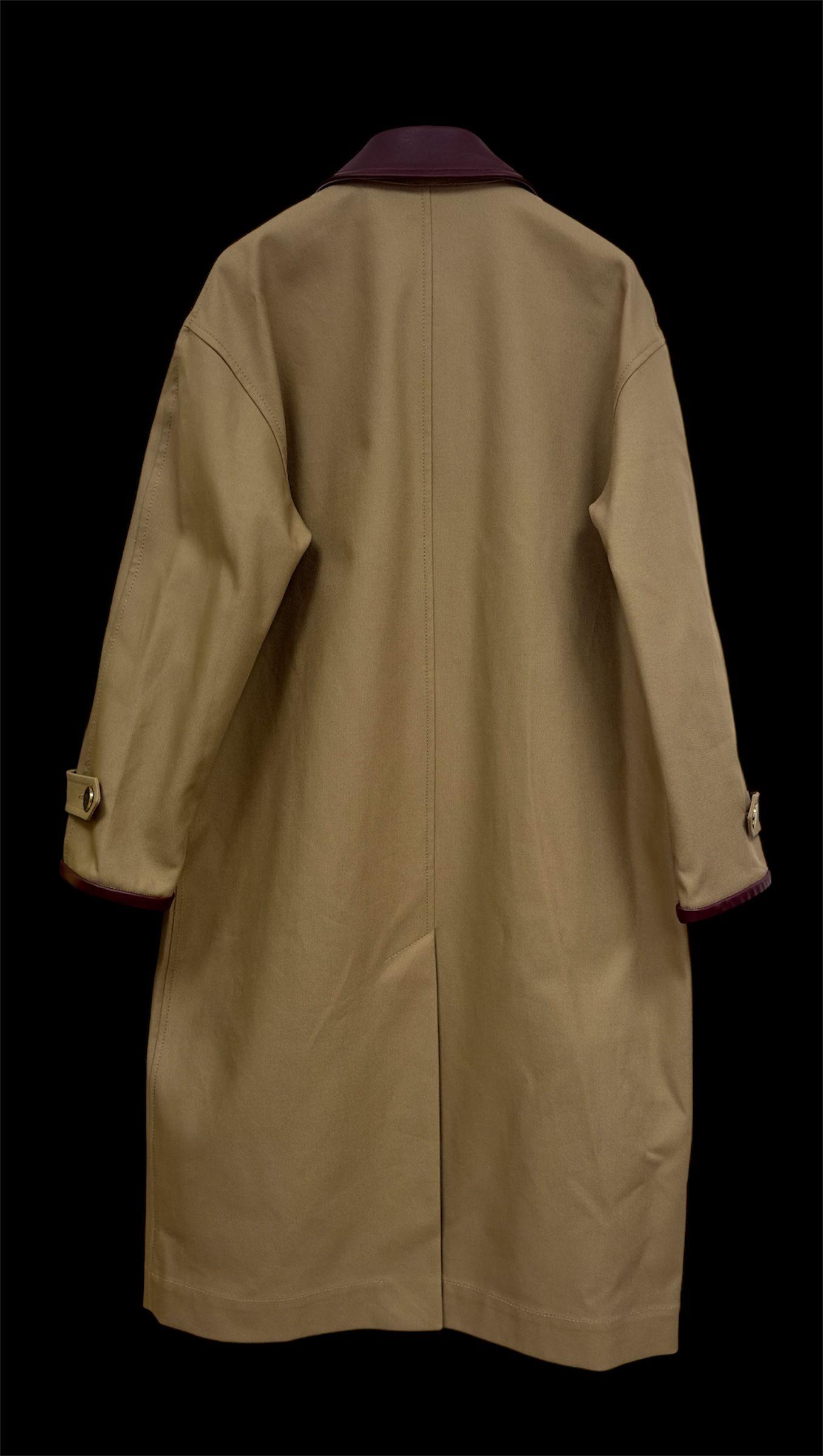 Long trench coat with leather collar and cuffs, long sleeves, front pockets and button fastening with covered placket.
