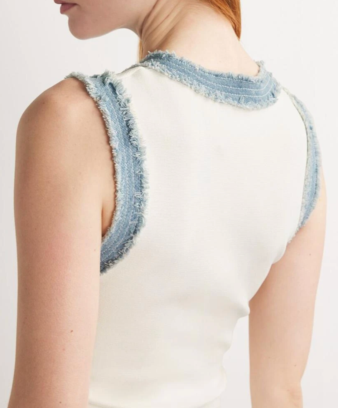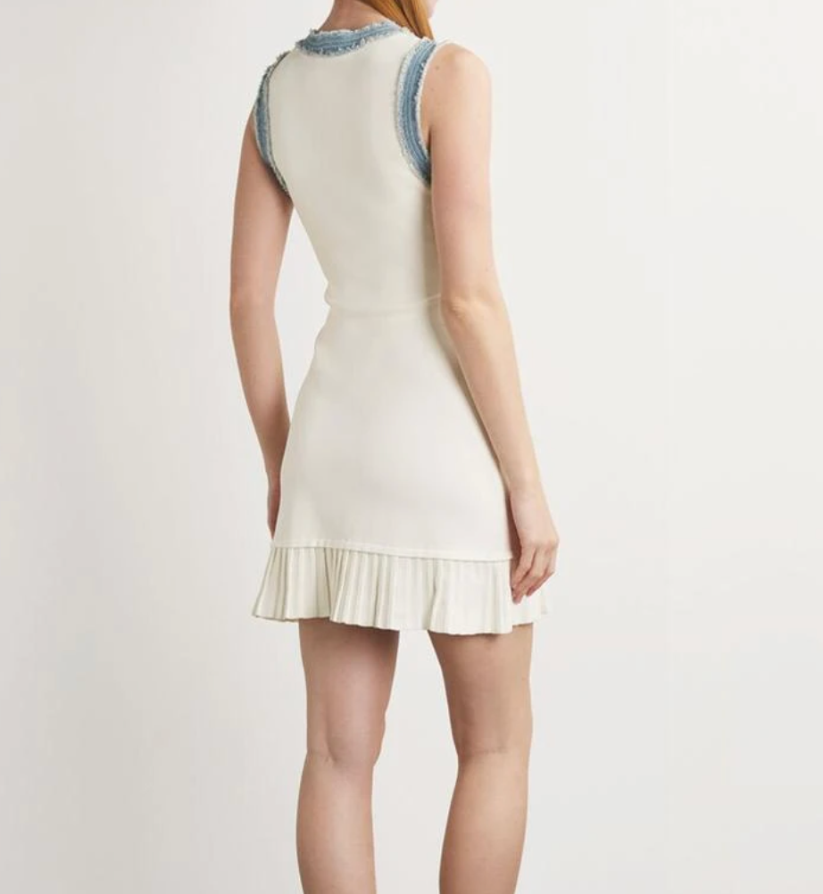 Product Description: Modern, but infused with retro sensibility, Sandro’s mini dress will be a standout style in your warm-weather rotation for trips into the city. The clean piece spotlights frayed denim inserts that artfully outline the compact frame as metal buttons amplify its vintage appeal.
