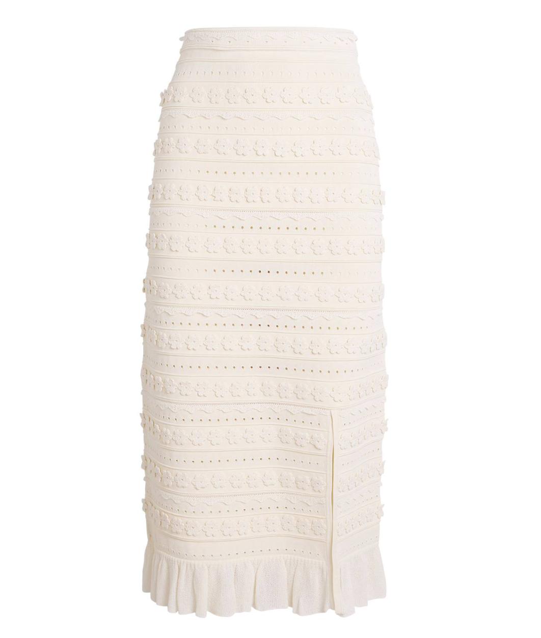 Long skirt in fancy knit with crochet detailing, featuring a slit at the front and a ruffle at the bottom.