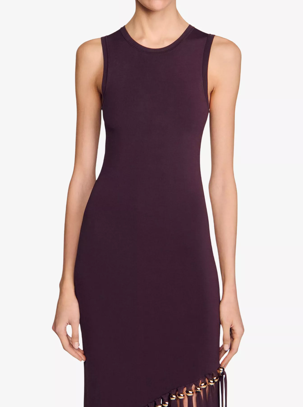 Slim fit, round-neck, sleeveless, bead embellishment, asymmetric fringed hem