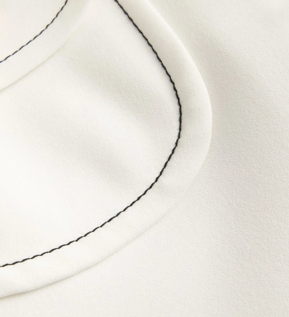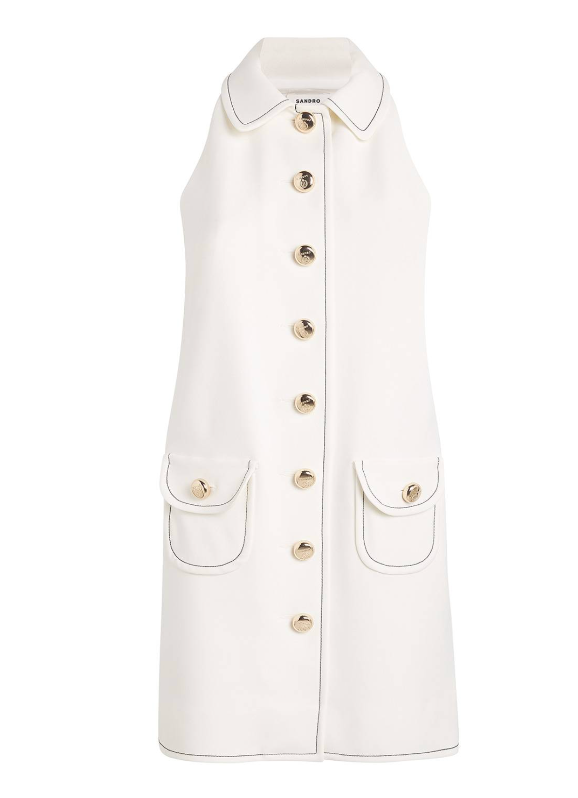 Sleeveless, Peter Pan collar, gold-tone button fastenings, contrast stitching, chest patch pockets, two side flap pockets, mini length