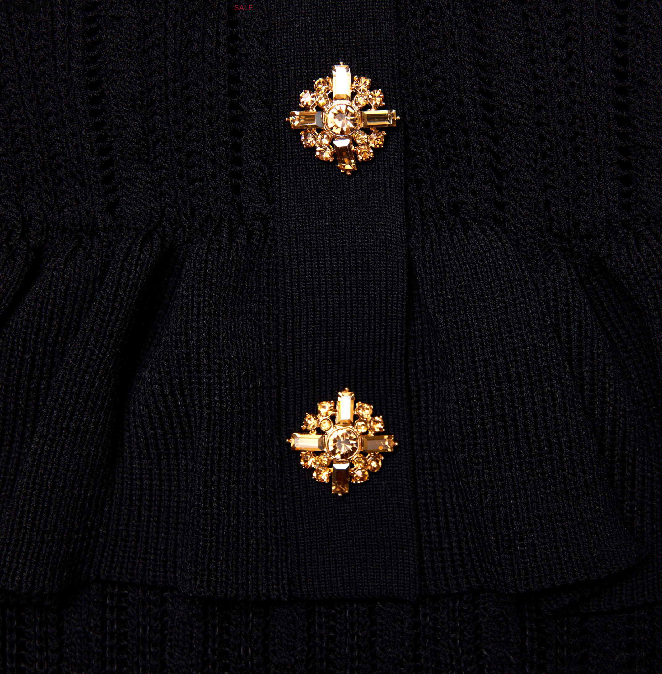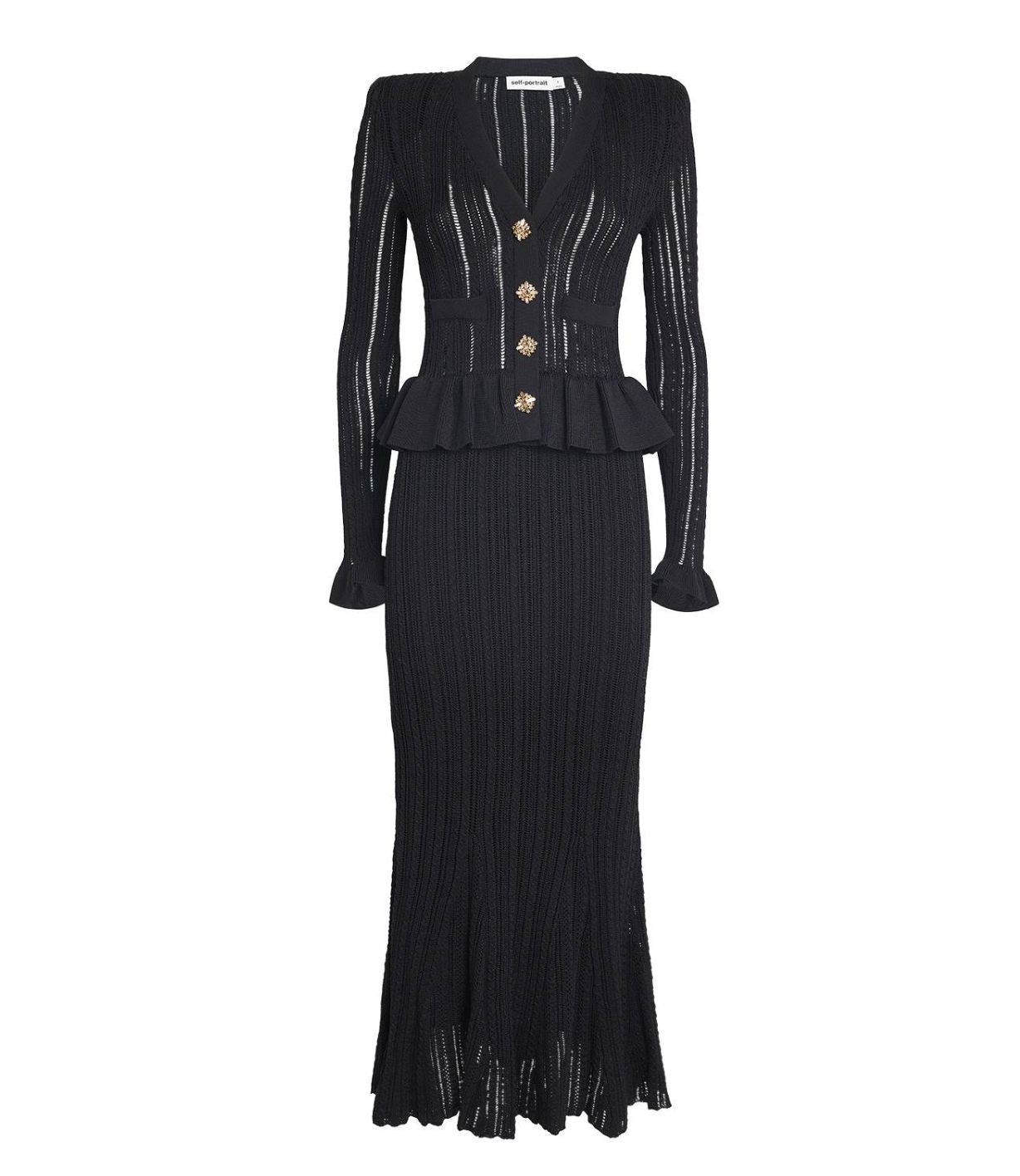 The one-and-done option for every occasion, this midi dress is cut from black pointelle knit. A peplum waist detailing flatters the form – match its gold buttons with our statement earrings.