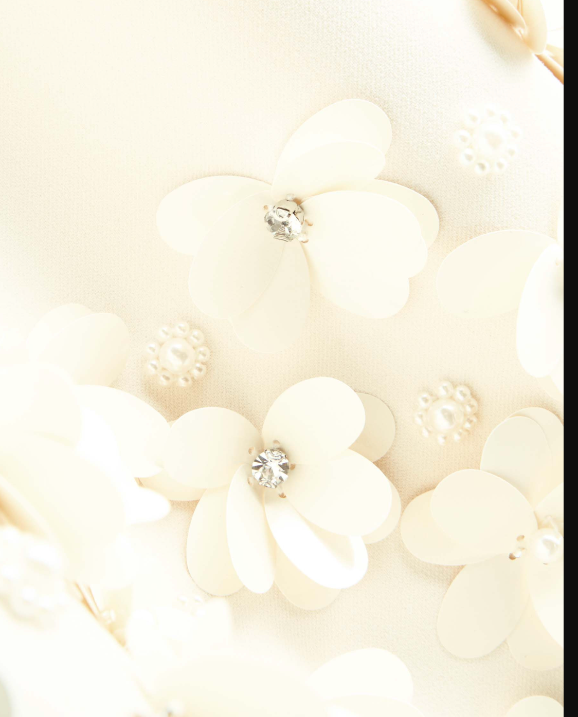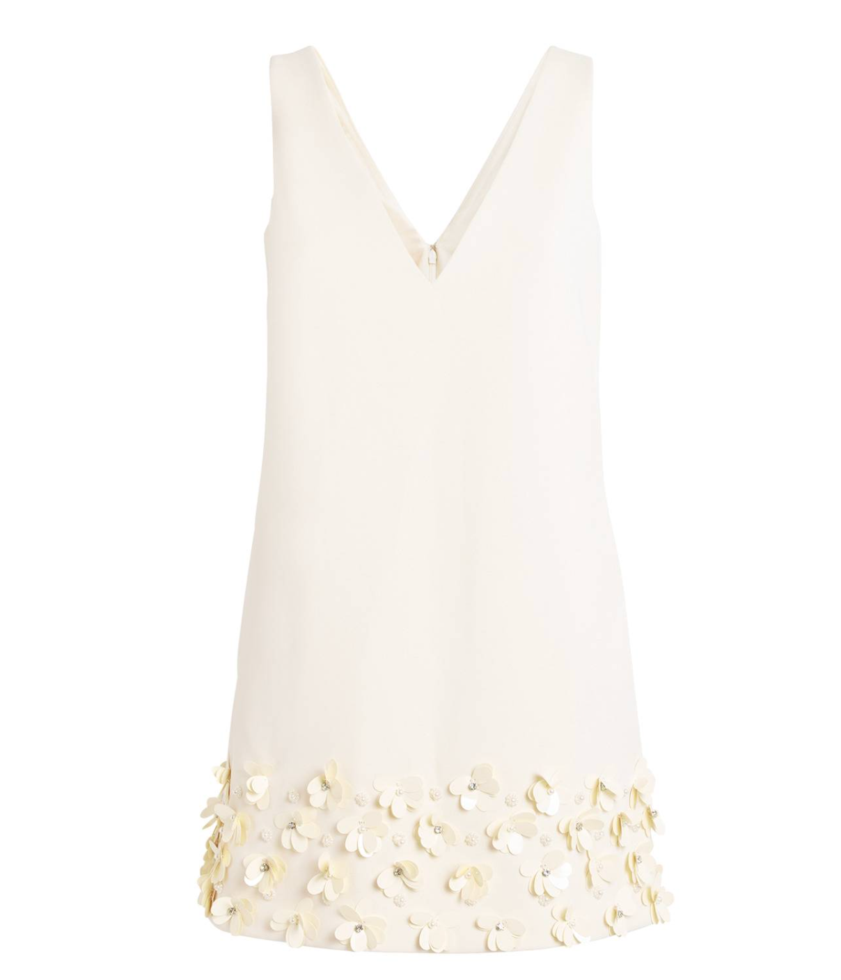 V-neck, darted at bust, crystal and faux-pearl floral embellishments at hem, fully lined