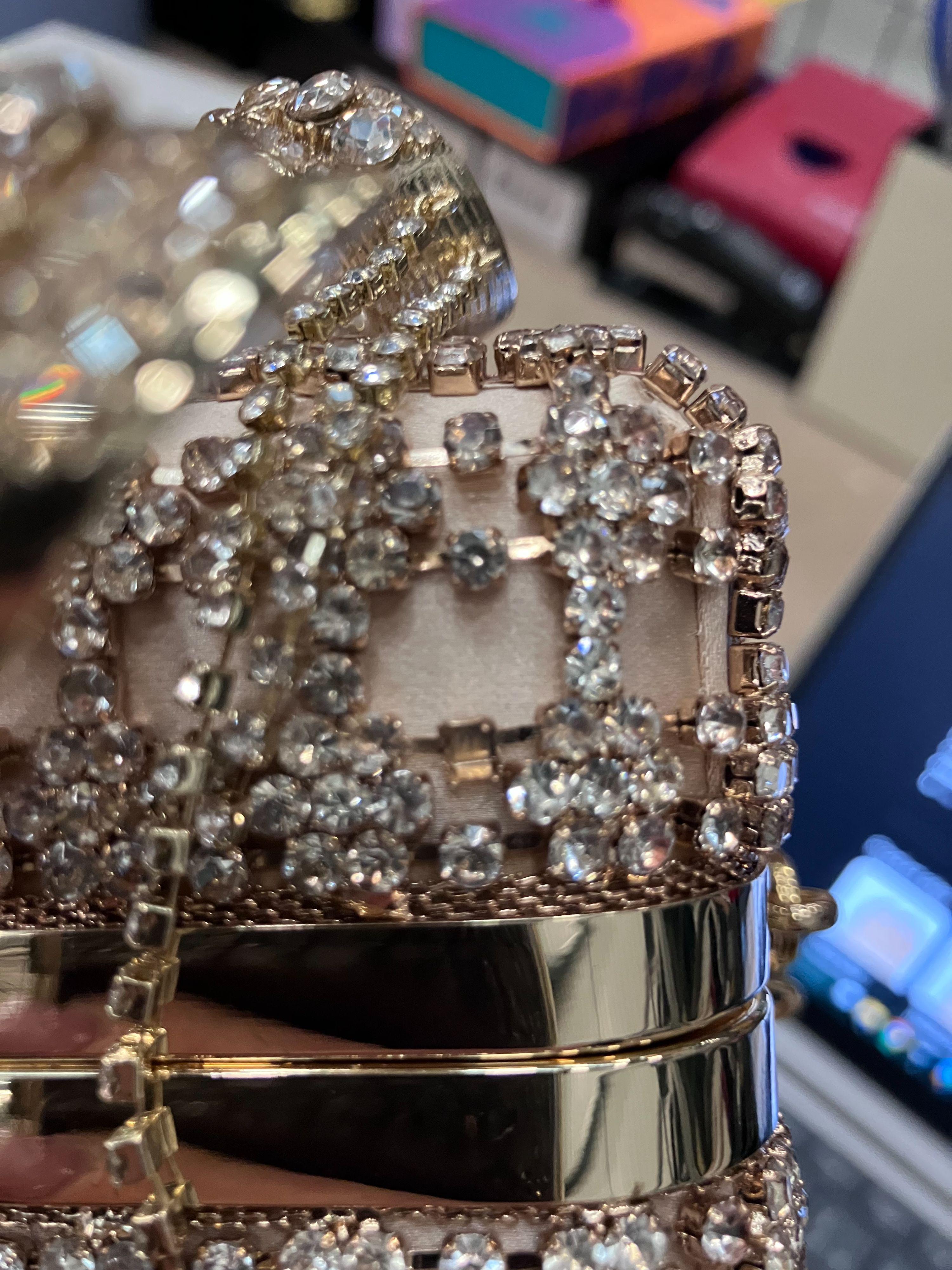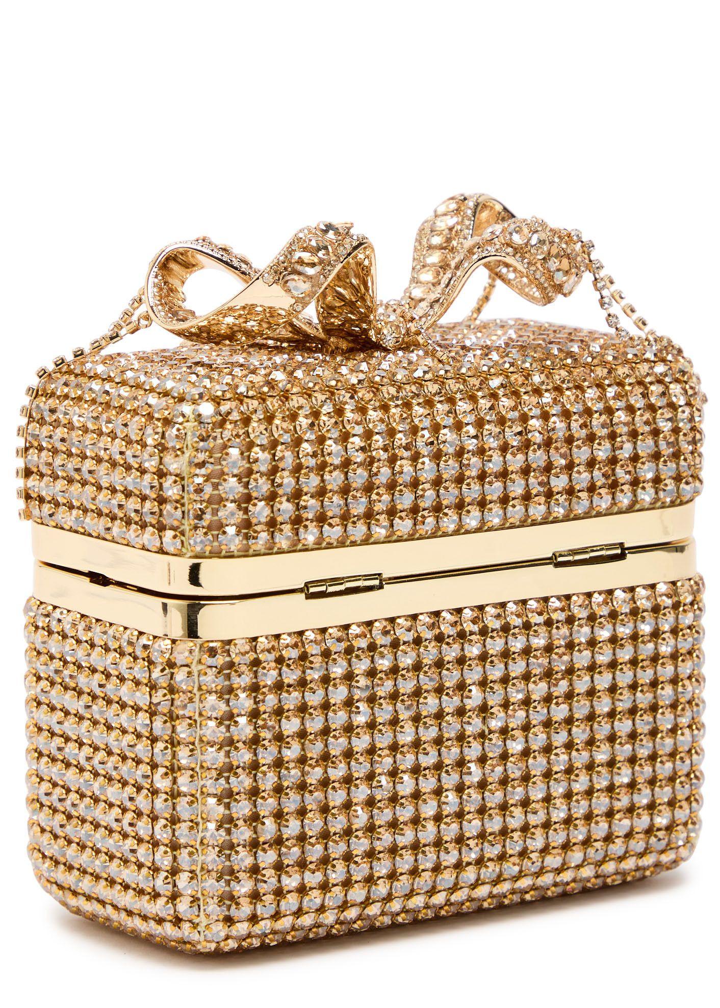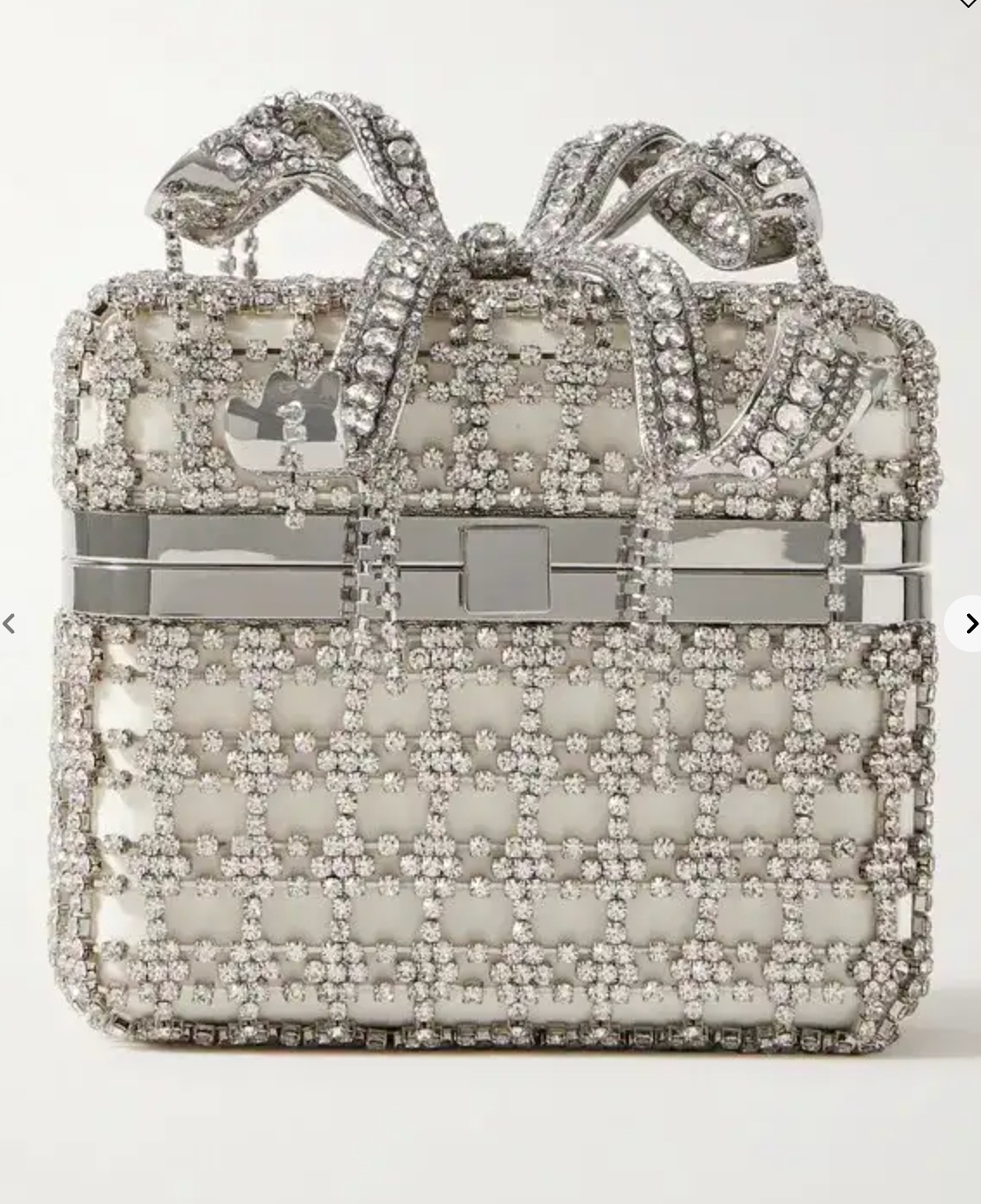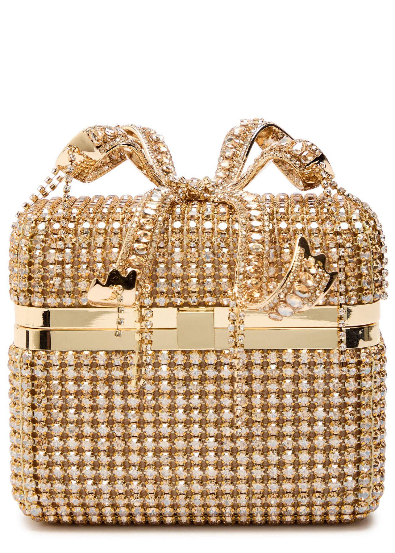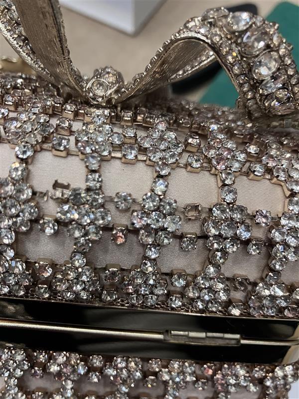 Detachable chain shoulder strap, crystal-embellished overlay, metal bow plaque with crystal embellishments, fully lined