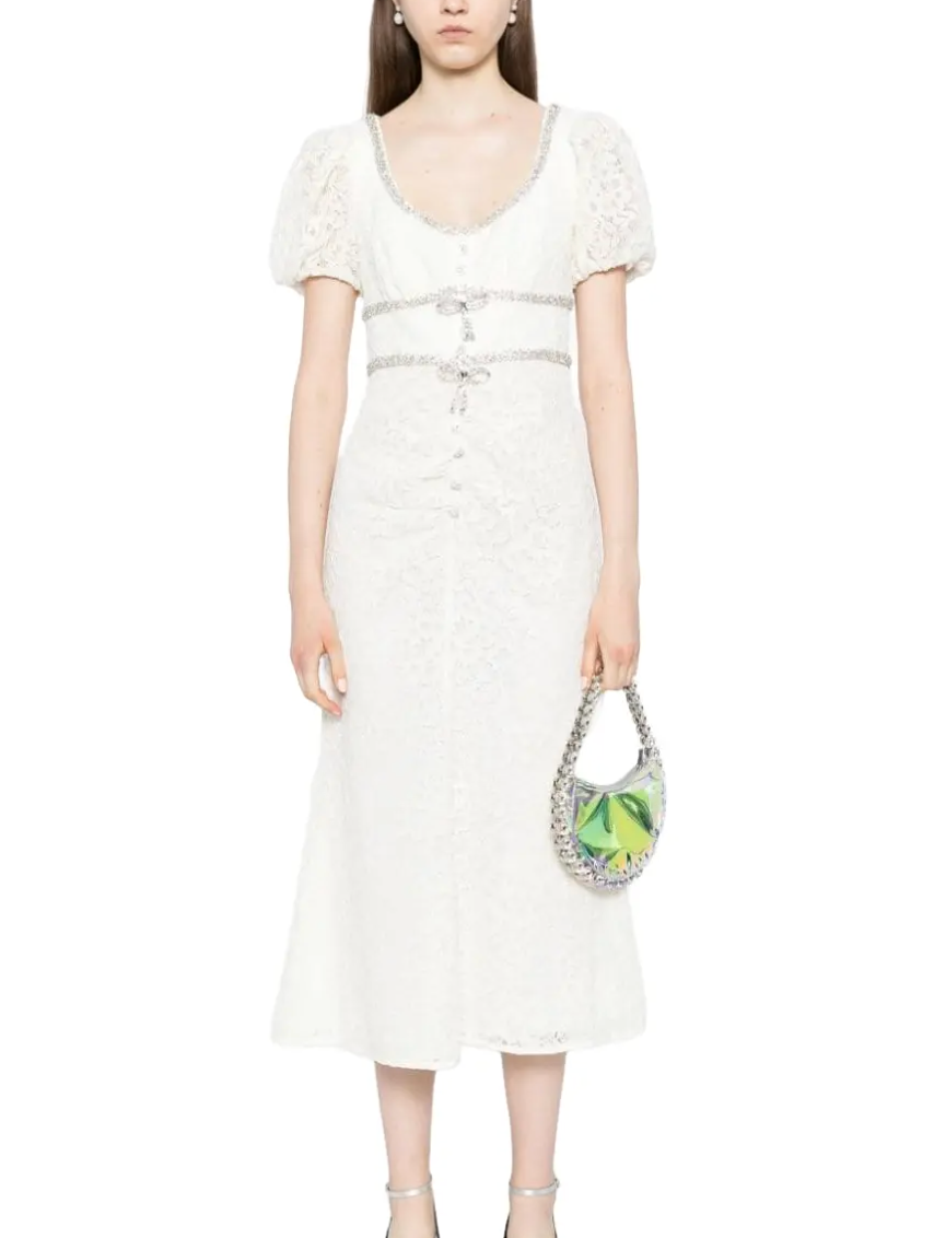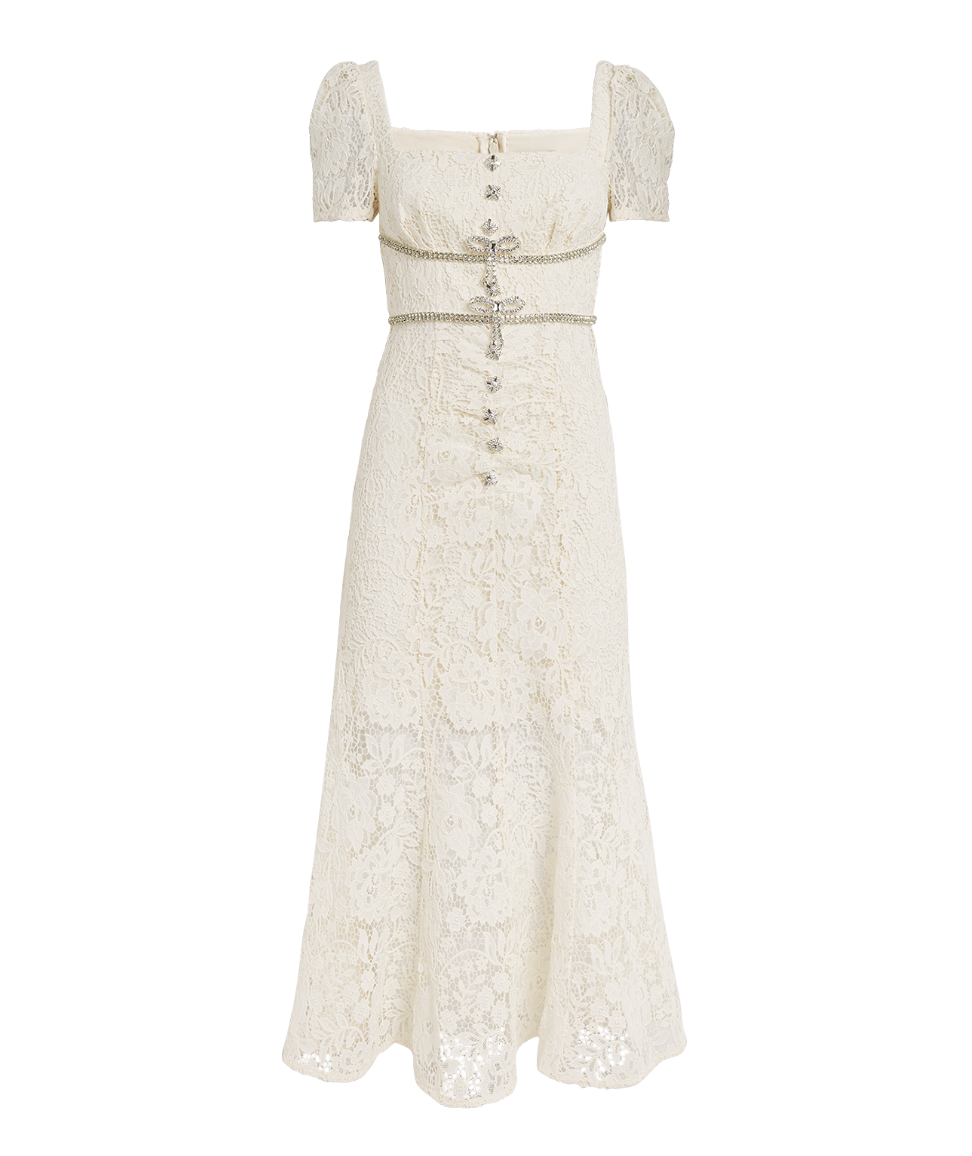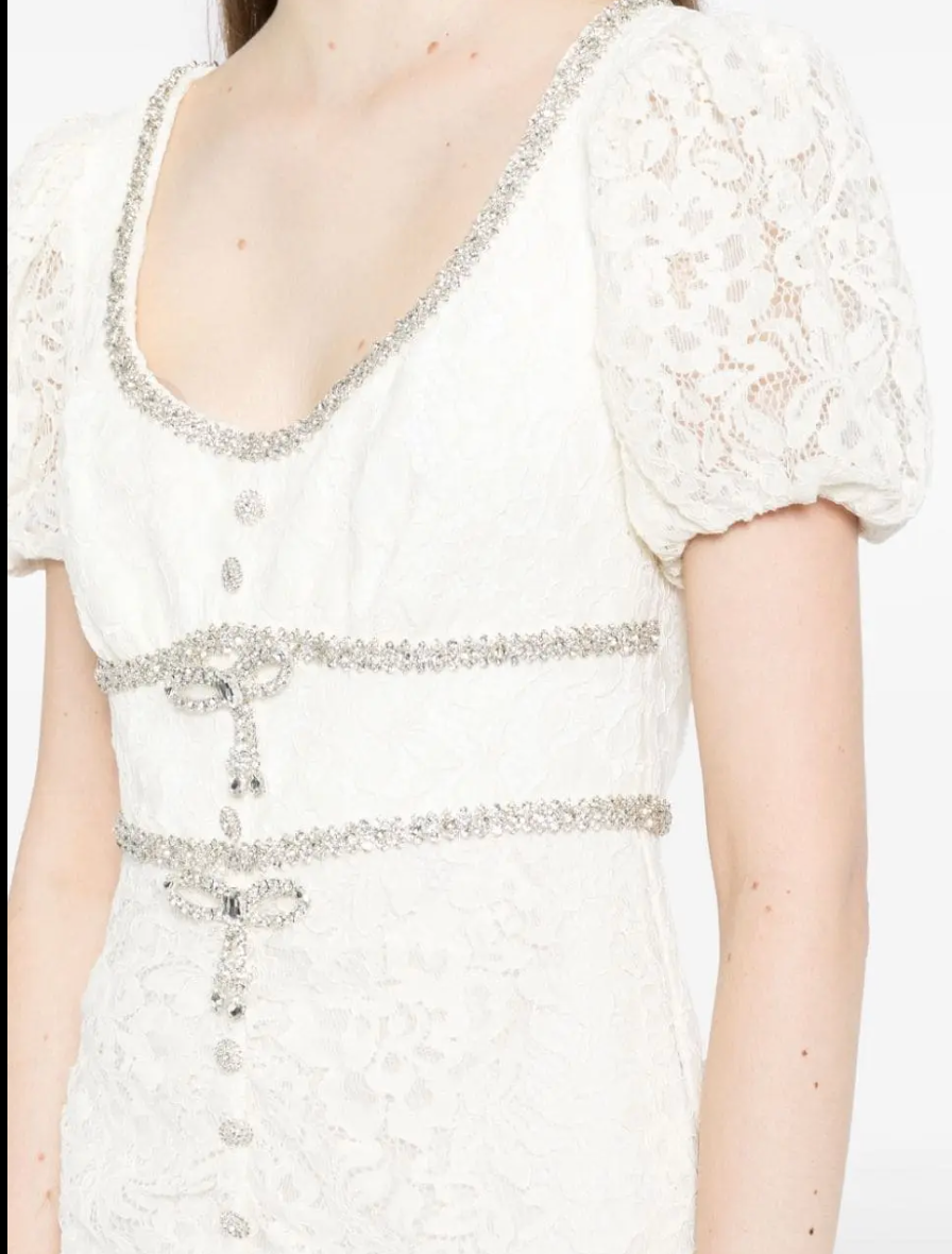 This Self-Portrait midi dress features a scoop neck, short puff sleeves with elasticated cuffs, a fitted waistline, and a flared skirt. The dress is made of lace with floral detailing and has a diamanté trim, bow detailing, dart detailing, pinched detailing, decorative button detailing, and a concealed rear hook and zip fastening. The dress is midi-length and fully lined.