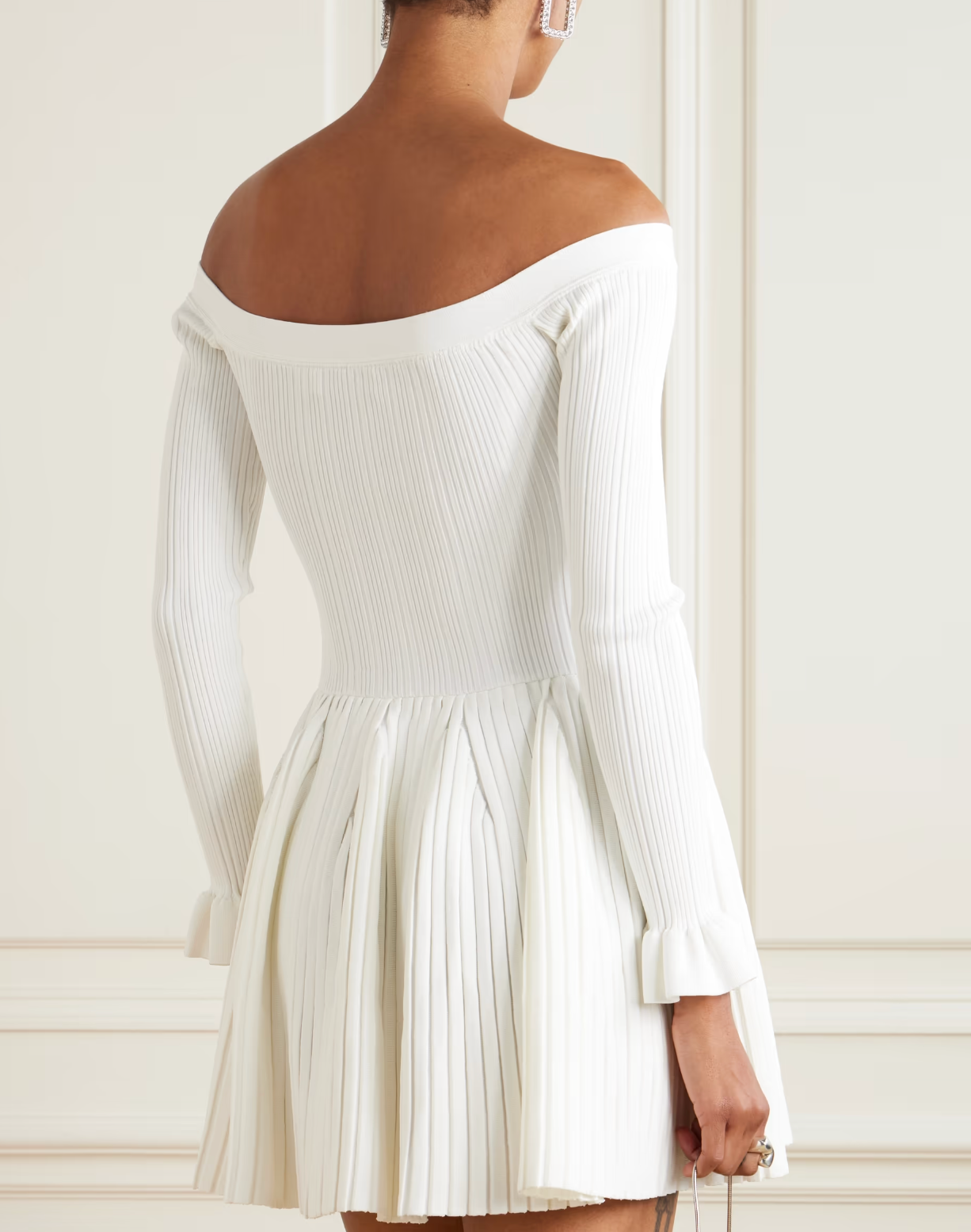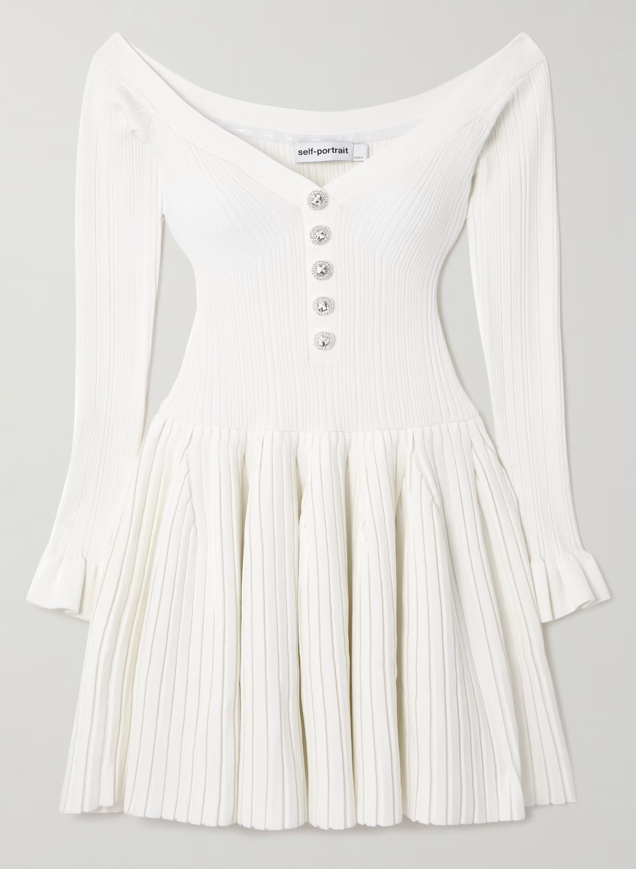 Self-Portrait Off-The-Shoulder Pleated Ribbed-Knit Mini Dress