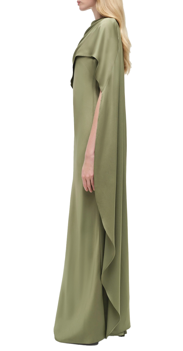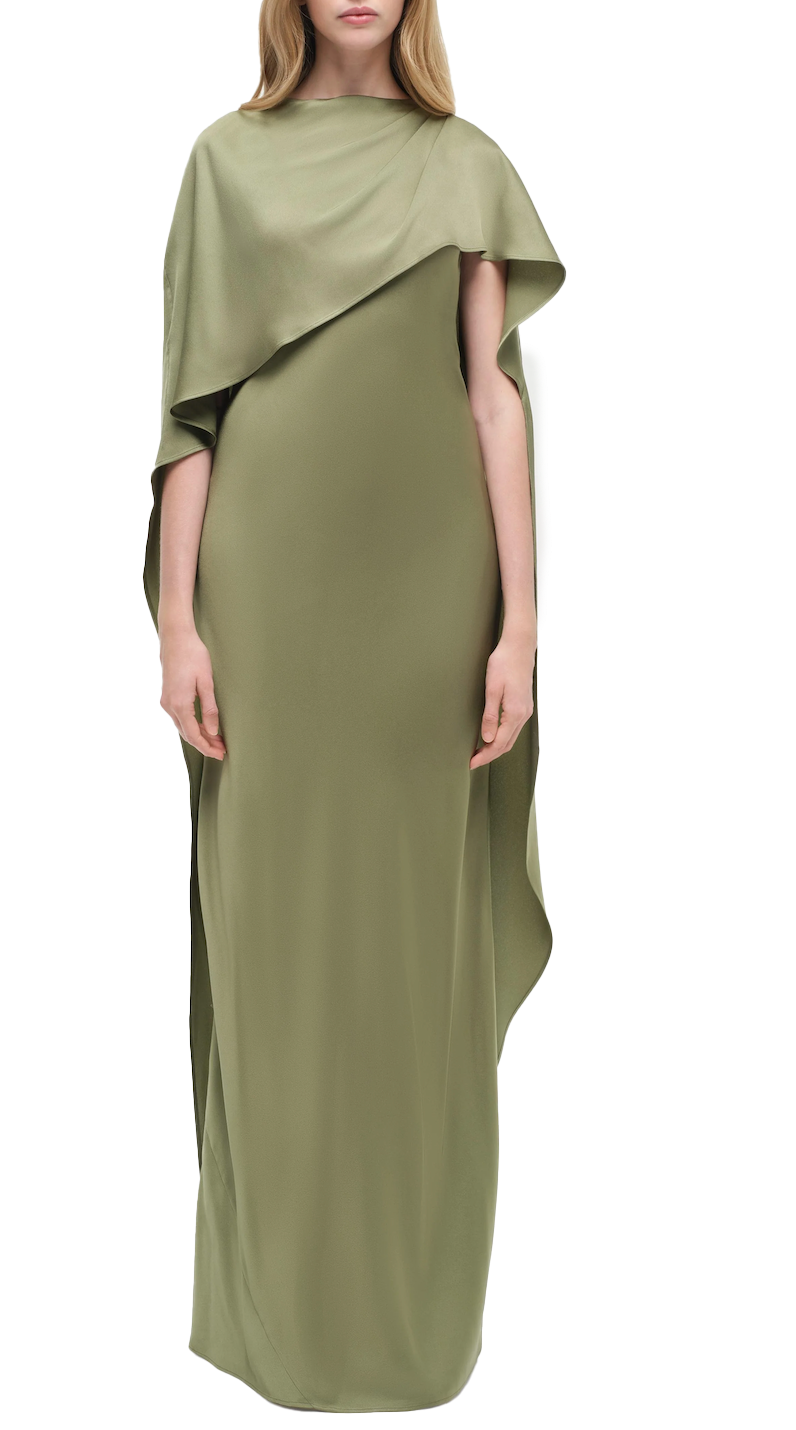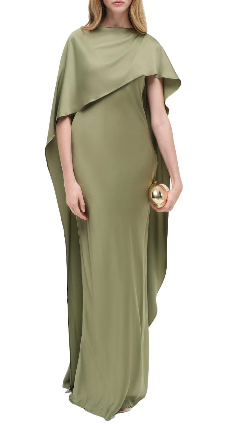 A woven satin gown with a full length cape creates a sculptural shape and compelling design.
