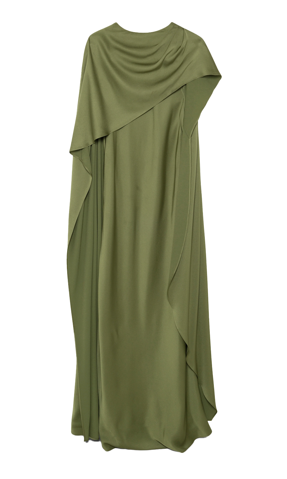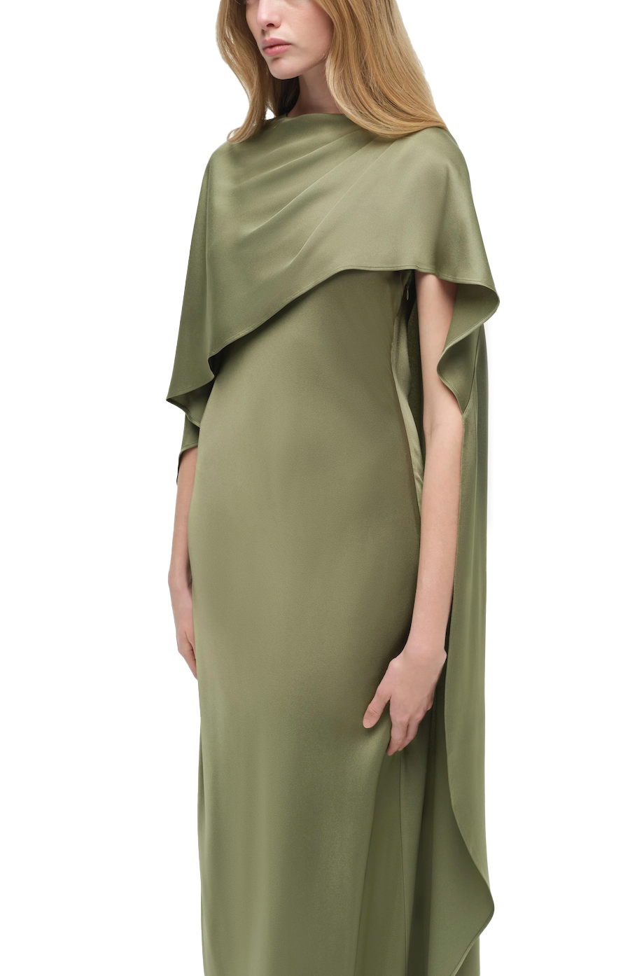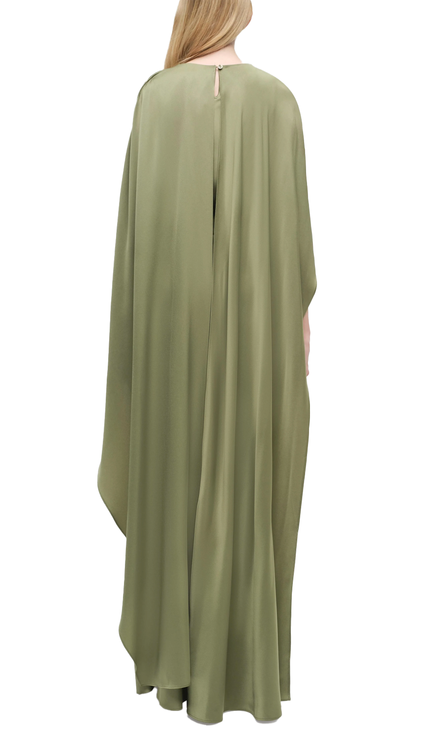 A woven satin gown with a full length cape creates a sculptural shape and compelling design.