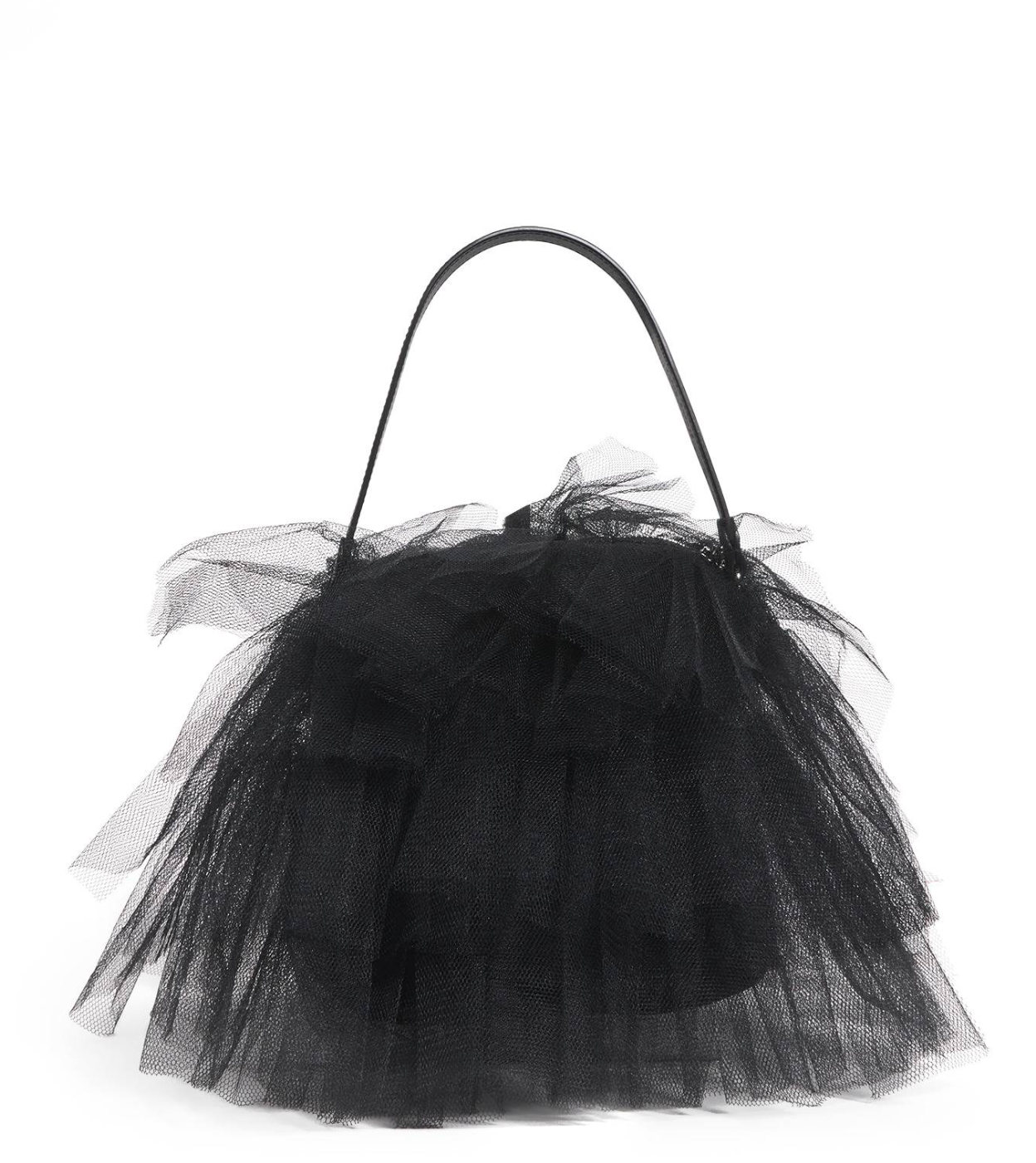 Whimsical and statement-making black tote by Simone Rocha, crafted with layers of soft tulle that create a voluminous, tutu-inspired silhouette. Features a structured inner pouch with a top zip closure, smooth leather top handles, and silver-tone hardware. Lightweight yet eye-catching, this bag adds dramatic texture to both day and evening looks.