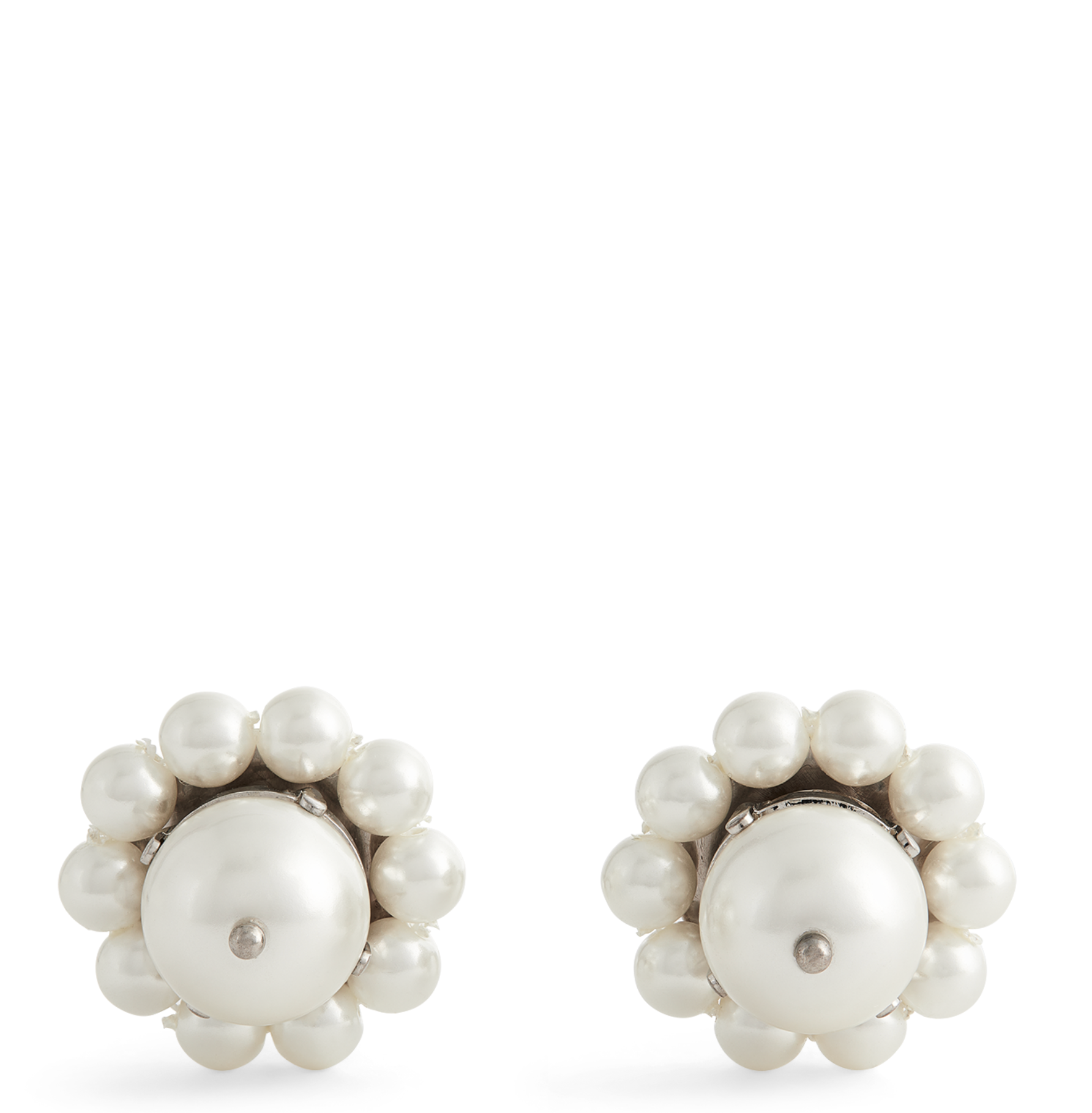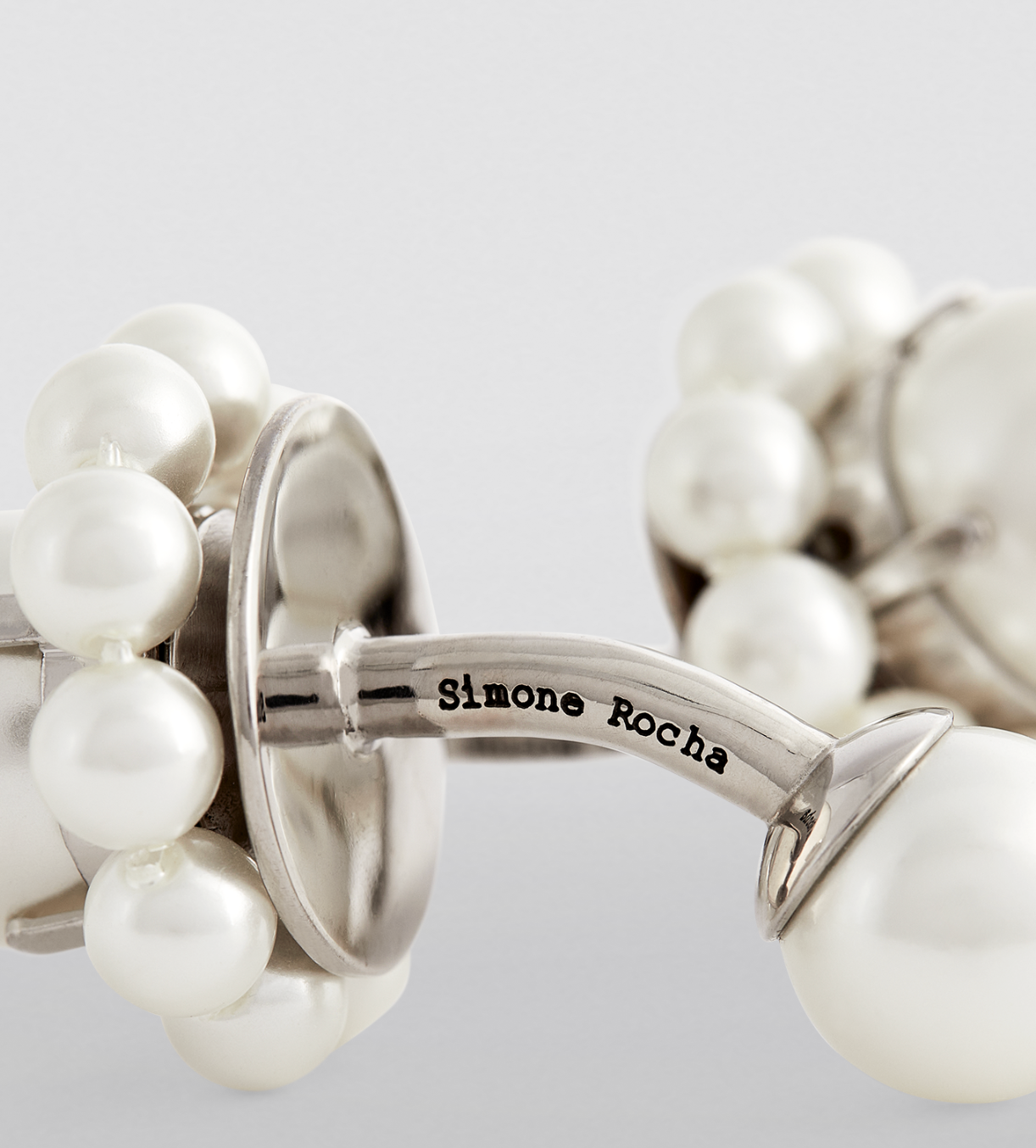 These elegant Simone Rocha cufflink feature the brand's signature romantic aesthetic, crafted in the shape of delicate flowers. Each earring is adorned with lustrous ivory-white faux pearls, with a single, larger pearl at the center surrounded by a cluster of smaller ones.