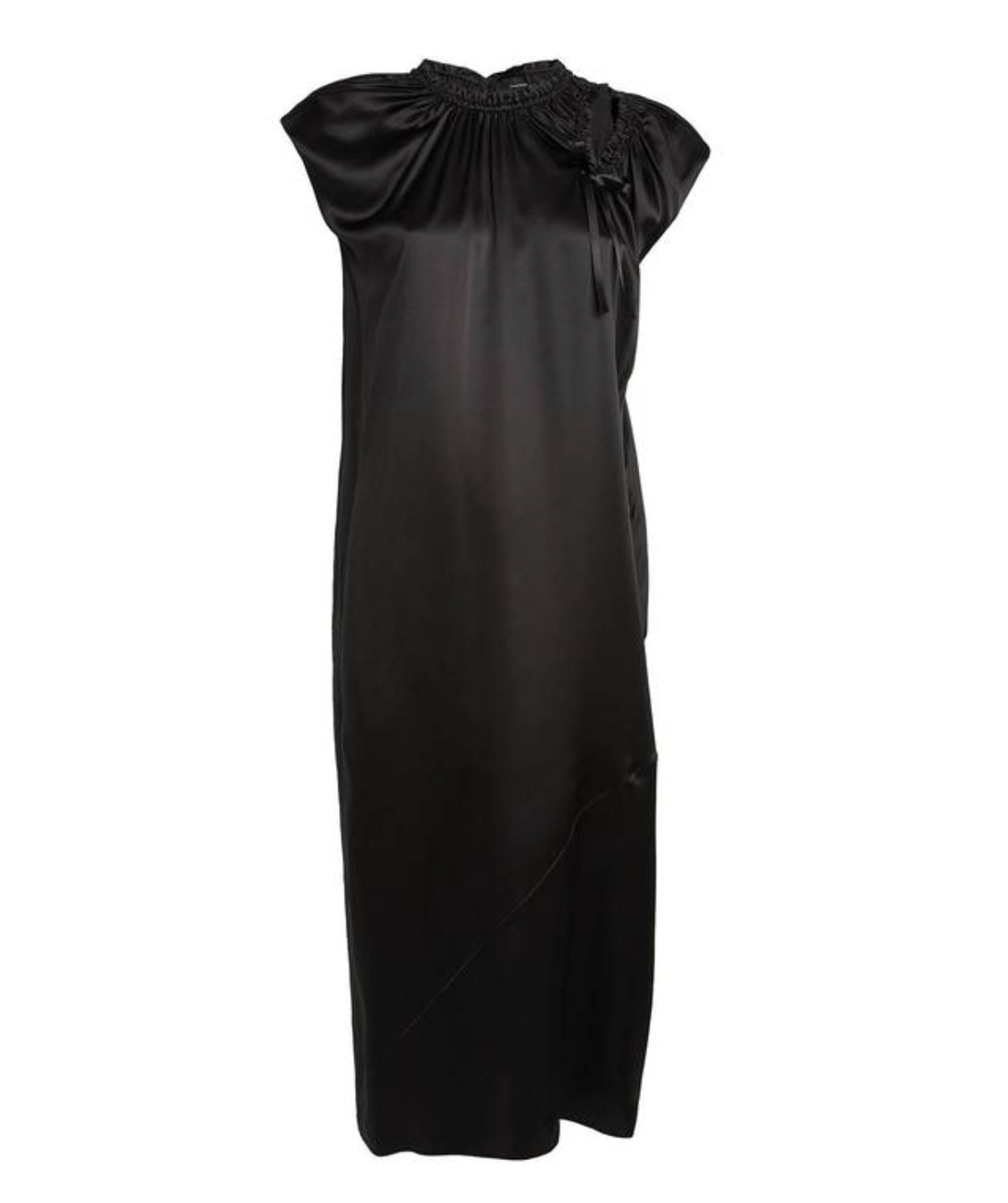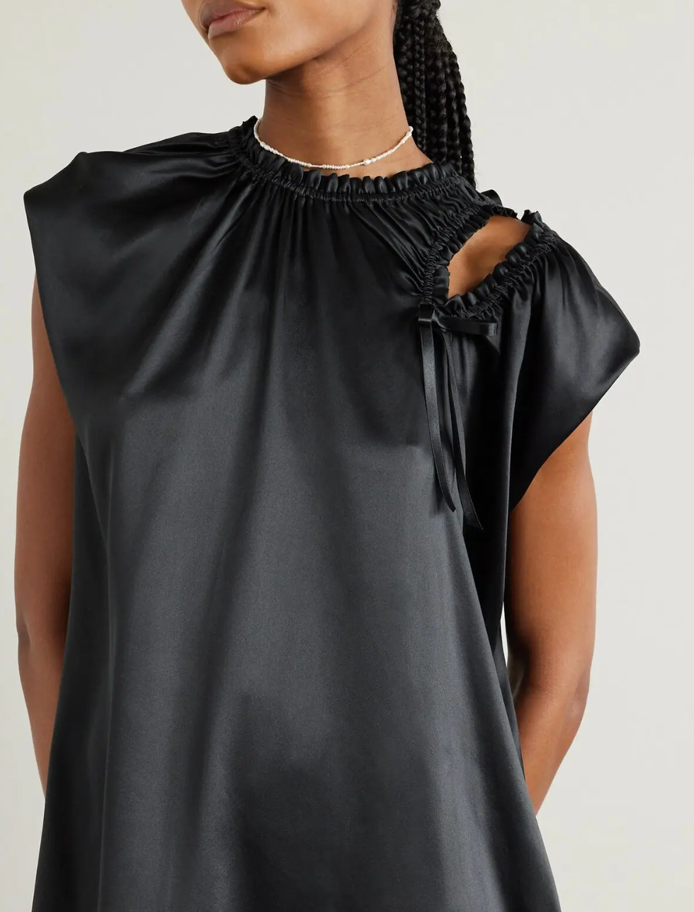 This Simone Rocha midi dress is crafted from silk-satin with a lustrous shine. The dress has delicate ruching along the neckline and features a shoulder cutout that is accented with a tie detail. The midi dress also includes pockets.