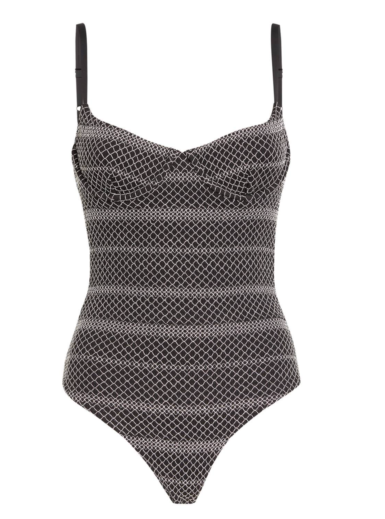 Sweetheart neckline. Shoulder straps. Ruching throughout. Full coverage. Underwire. Scoop back. Lined. Pullover. 76% nylon; 24% spandex