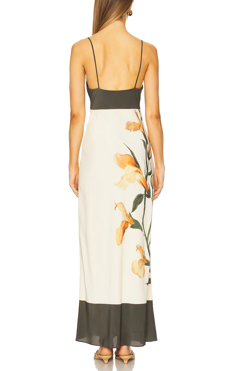 The SIR. 'Constance' maxi dress features a floral print and V neckline. This sleeveless slip silhouette dress falls below the knee and has a slipover style. It is crafted from a silk and polyester blend with a polyester lining. Dry clean only.