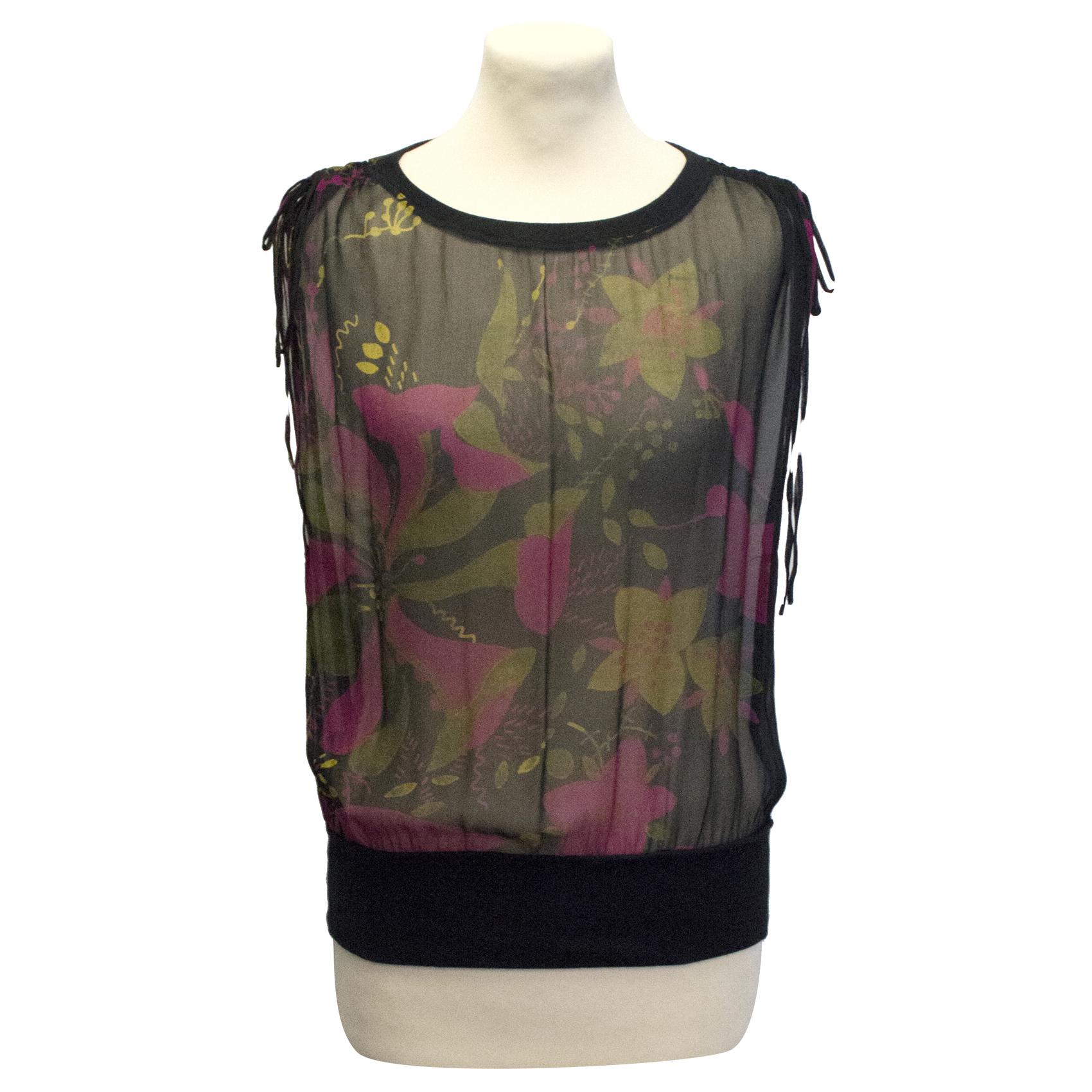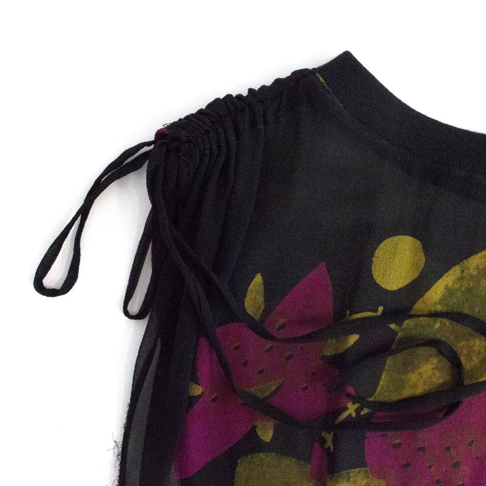 Sophia Malig sheer black top with green and pink floral print. Boat neckline, with drawstrings on the shoulders and a ribbed, elasticated hem.