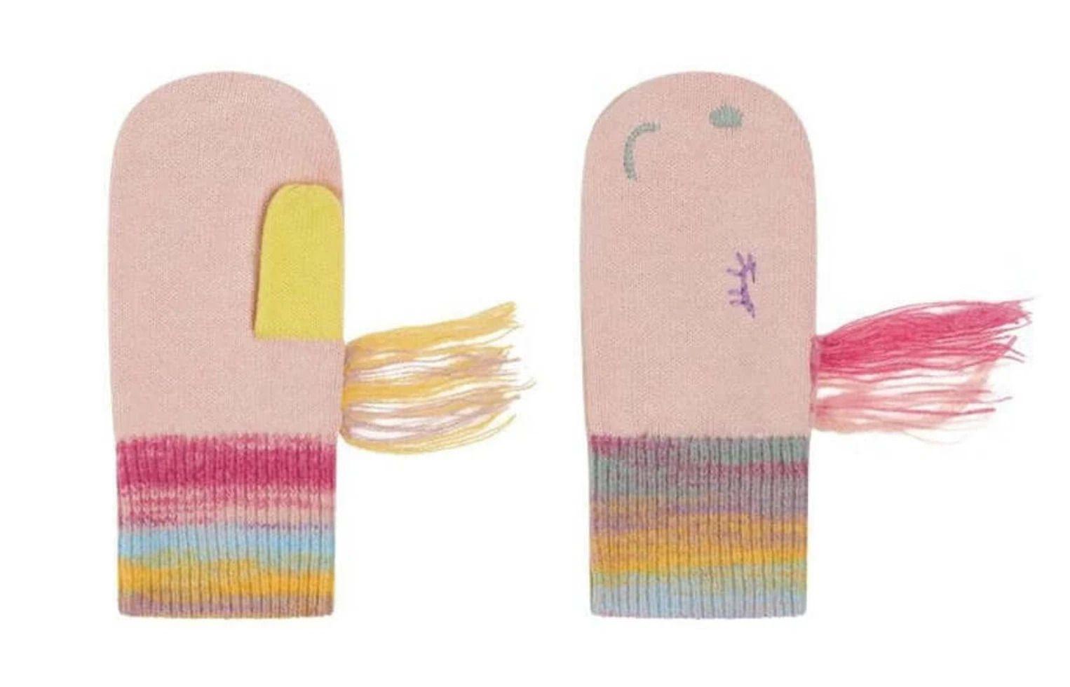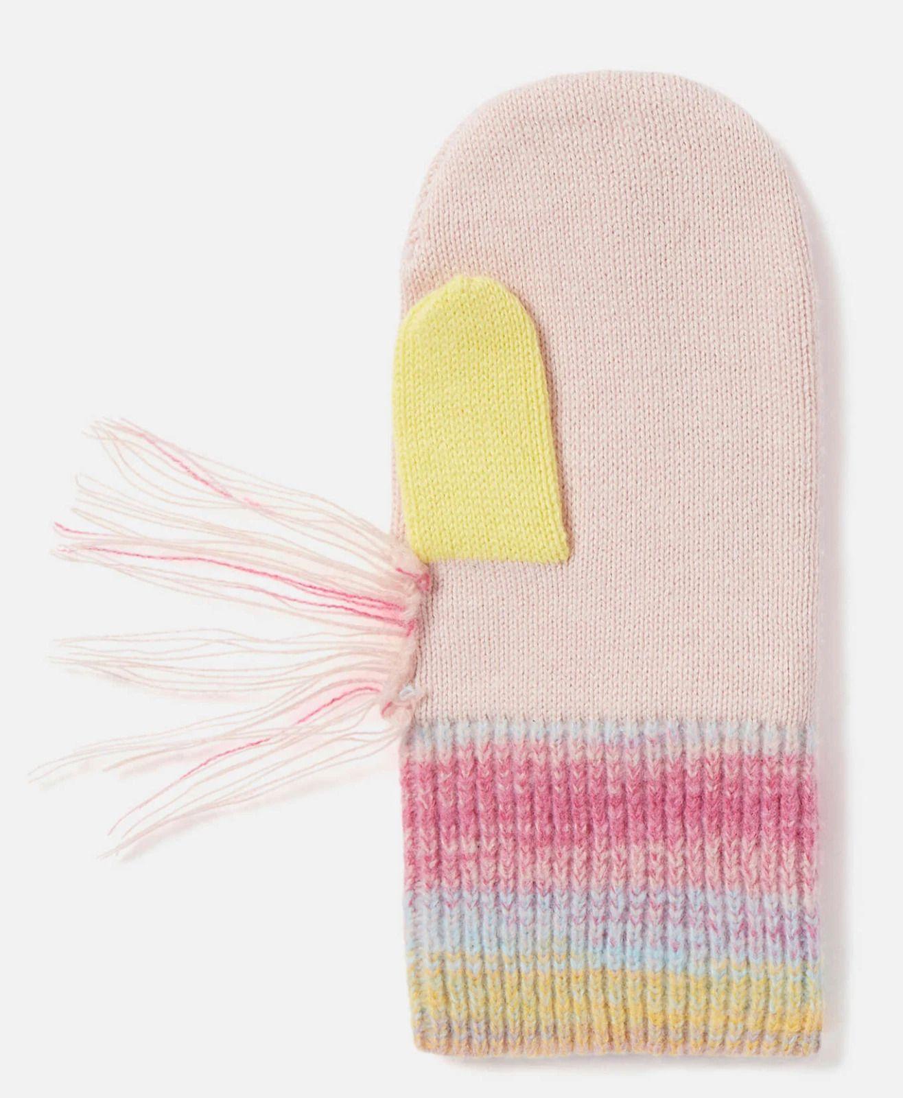Adorable pink rainbow unicorn mittens for girls by Stella McCartney Kids, knitted in a soft organic cotton and wool blend. These cosy mittens are embroidered with a sweet unicorn face and have gently ribbed colourful cuffs with a matching woollen fringed trim to form the cute unicorn mane.