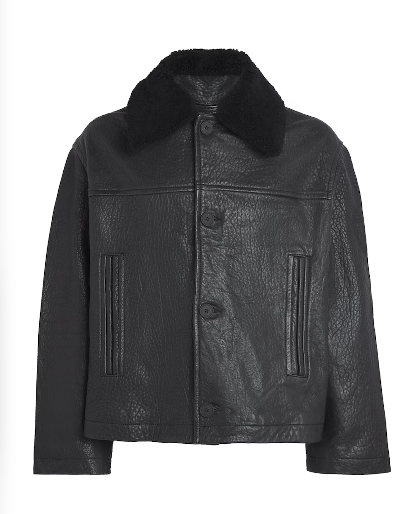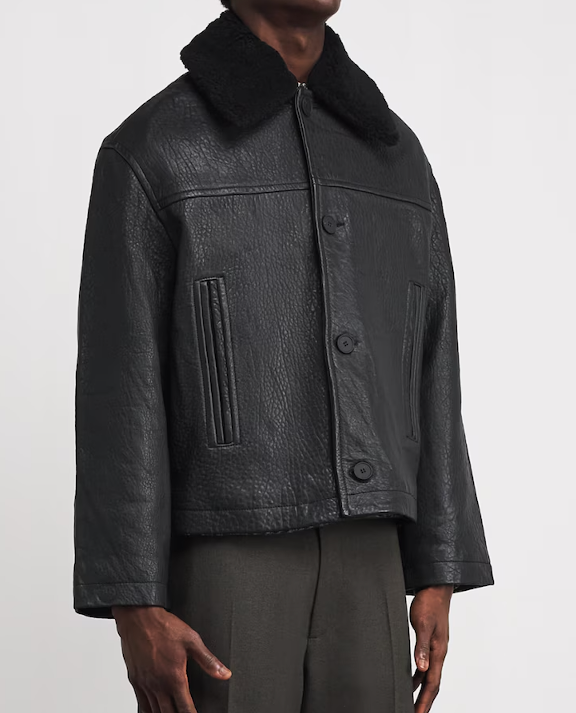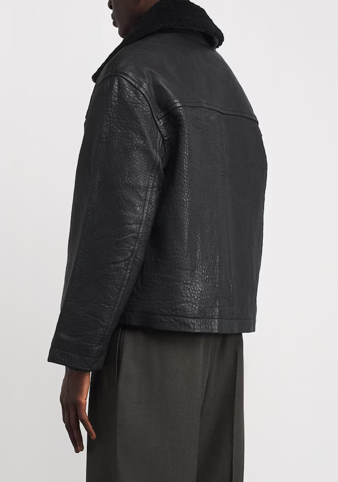 Detachable shearling collar; Cropped fit; Dropped shoulders