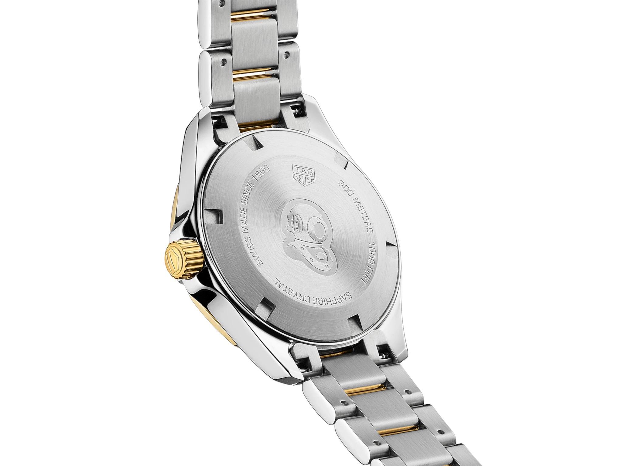 A brad new dazzling diamond and gold edition of the classic Aquaracer Lady. The mother-of-pear dial is adorned with 11 hand-applied diamonds. A further 35 diamonds circle the imposing 18K 2N gold-plated unidirectional turning bezel. Head-turning glamorous and with the mother of pearl dial which is a shell from the sea gives that extra touch.