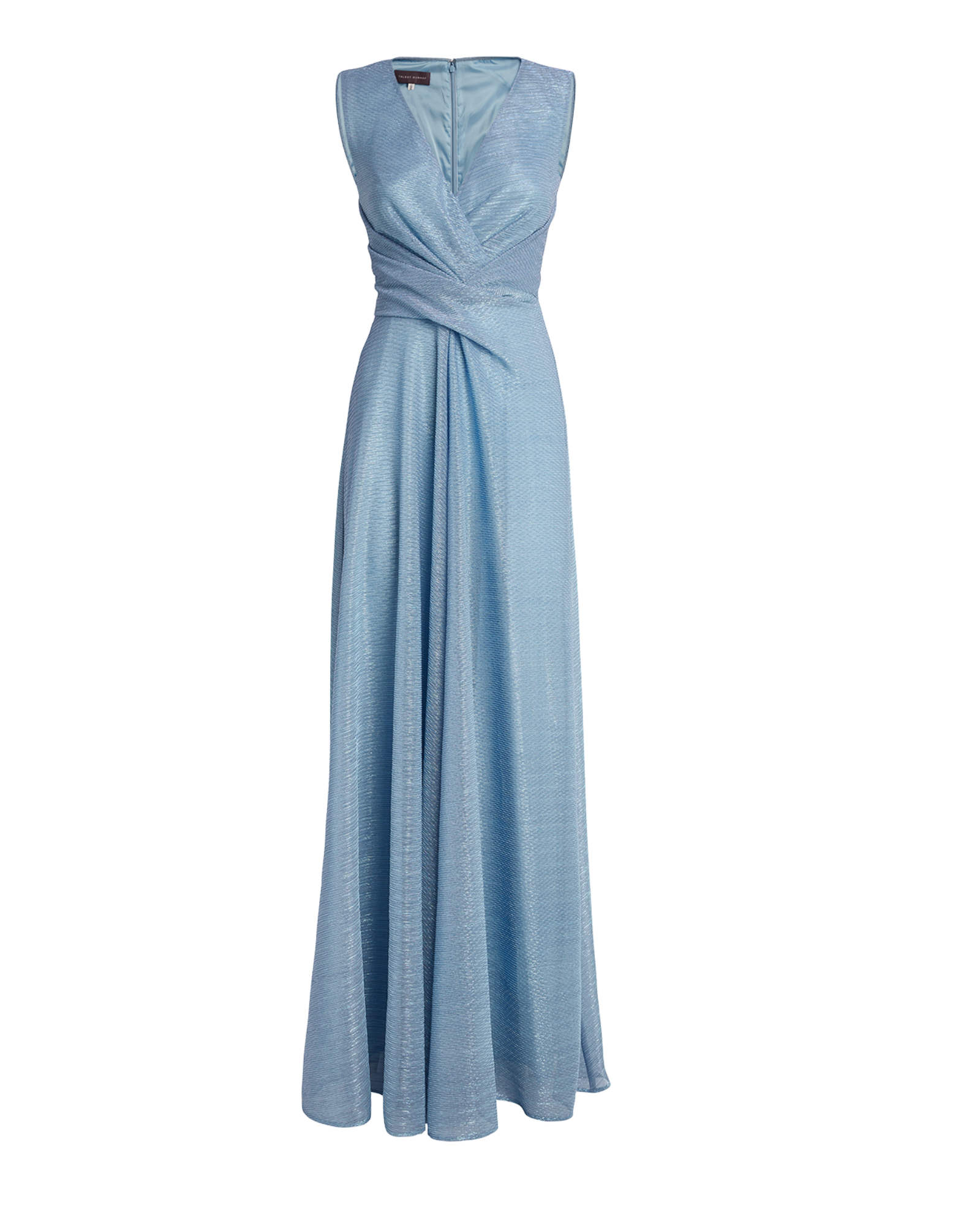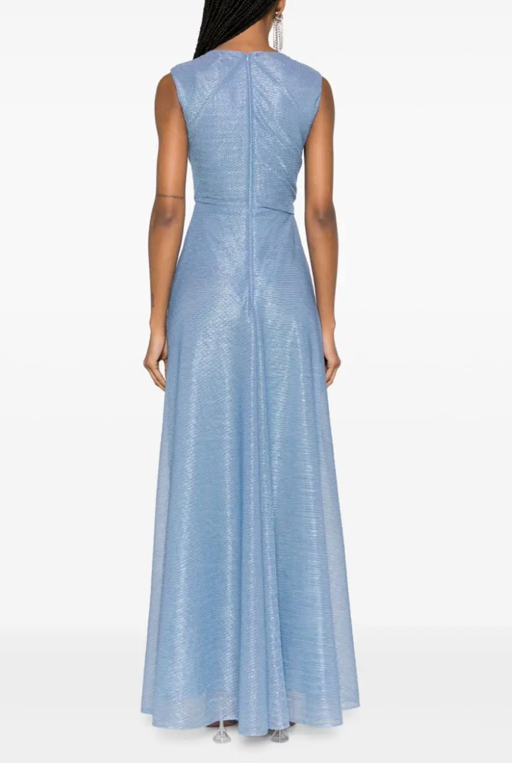 This Talbot Runhof maxi dress is crafted from voile with metallic threading and an iridescent effect. It features a draped design, plunging V-neck, concealed rear zip fastening, off-shoulder detail, fitted waistline, flared skirt, floor-length hem, and full lining.