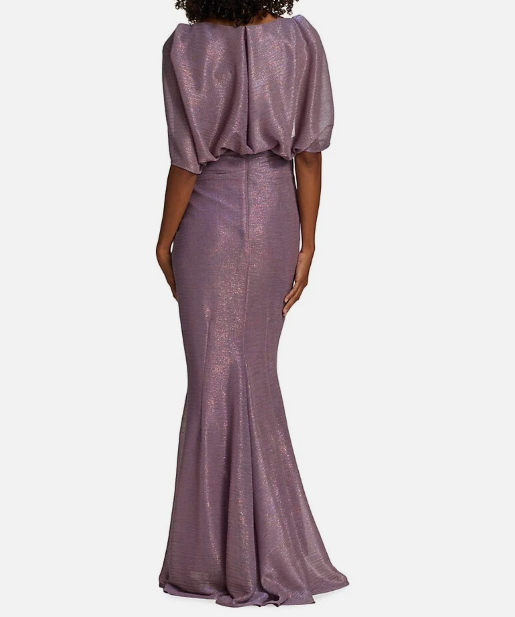 Known for its shimmering metallic-voile fabric, the gown features a sophisticated boatneck and draped detailing across the bodice that creates a flattering silhouette. Its signature design element is the cape sleeves, which add an ethereal touch to the floor-length, figure-hugging design.