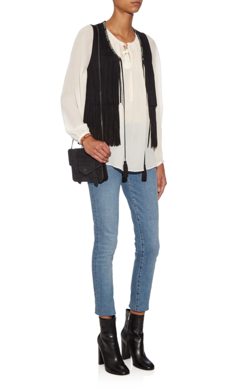 - Blue, green, burgundy, and beige embroidered neckline trim