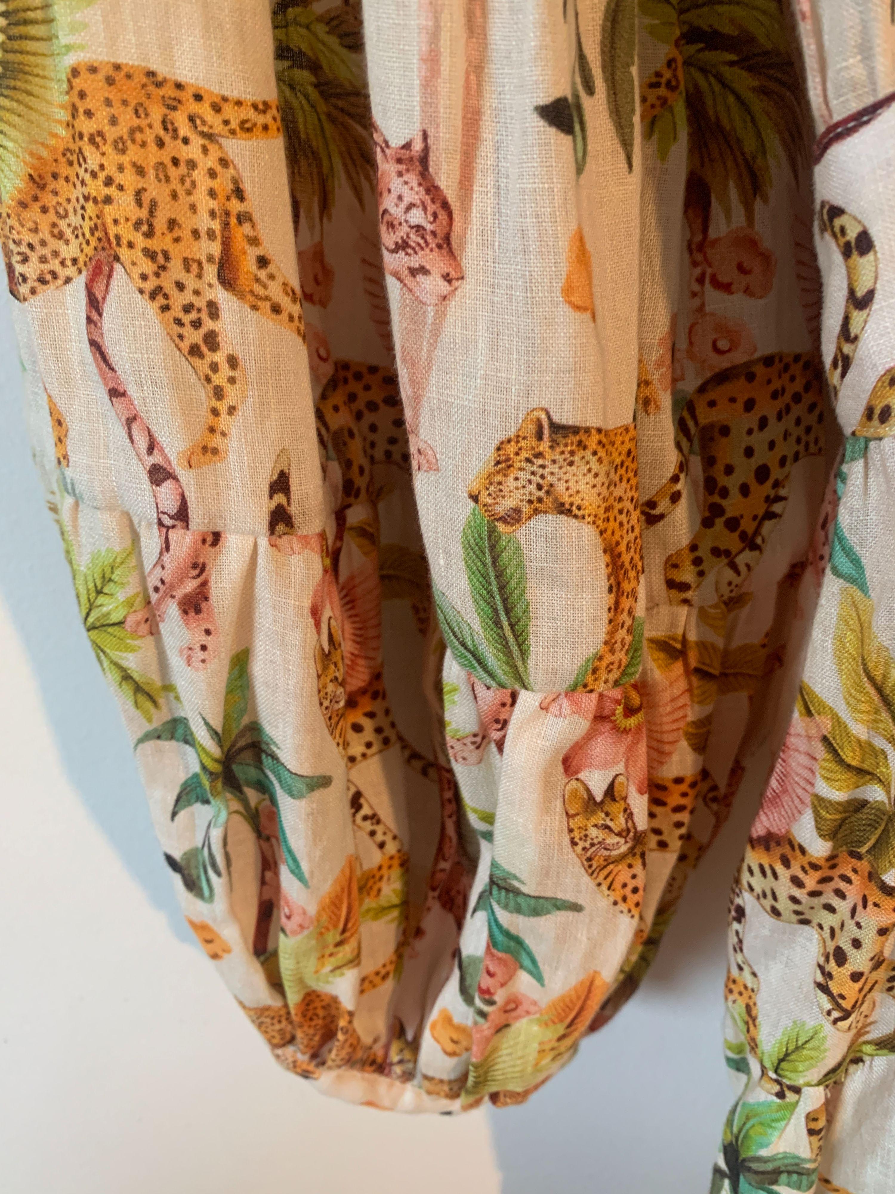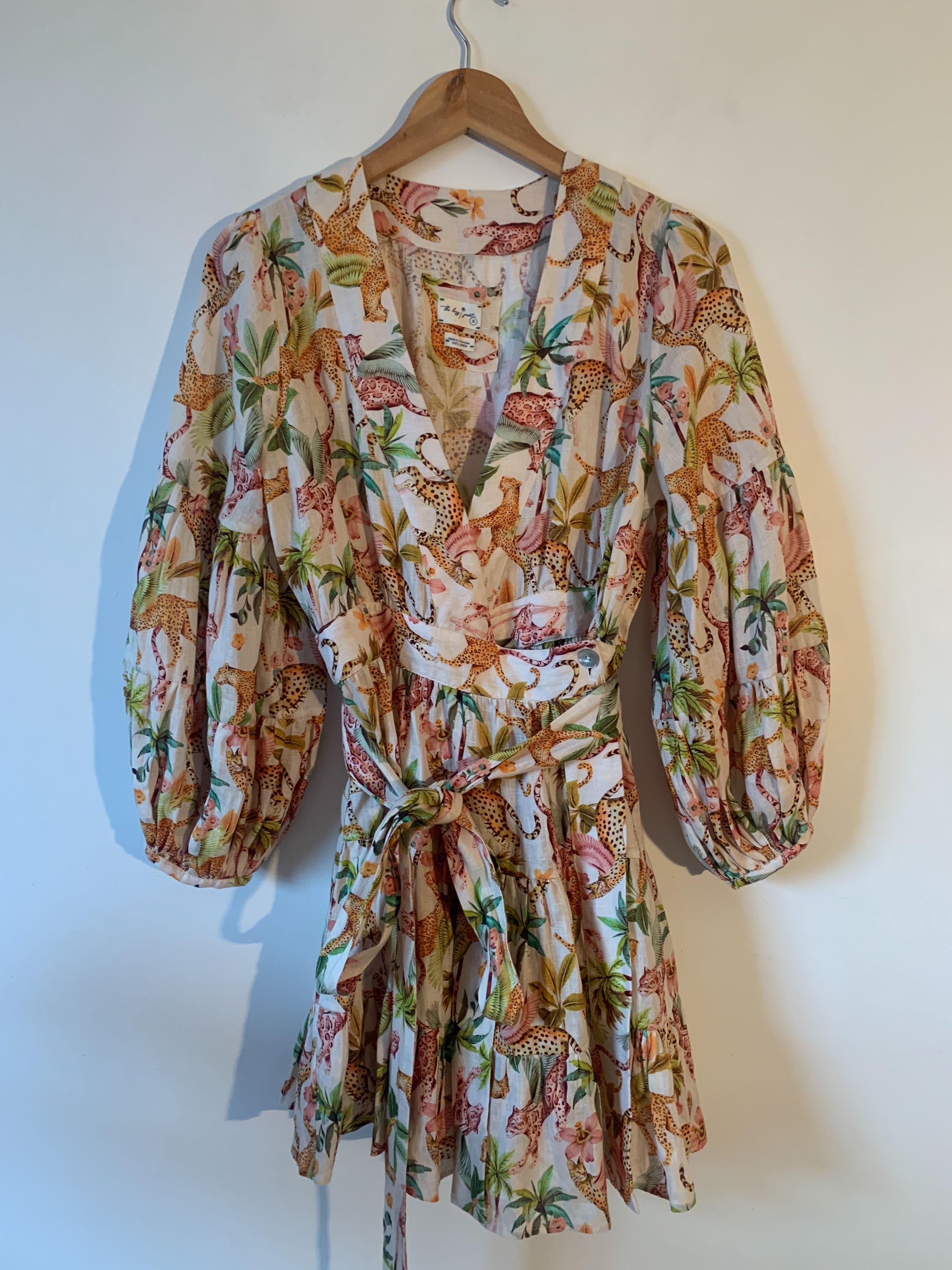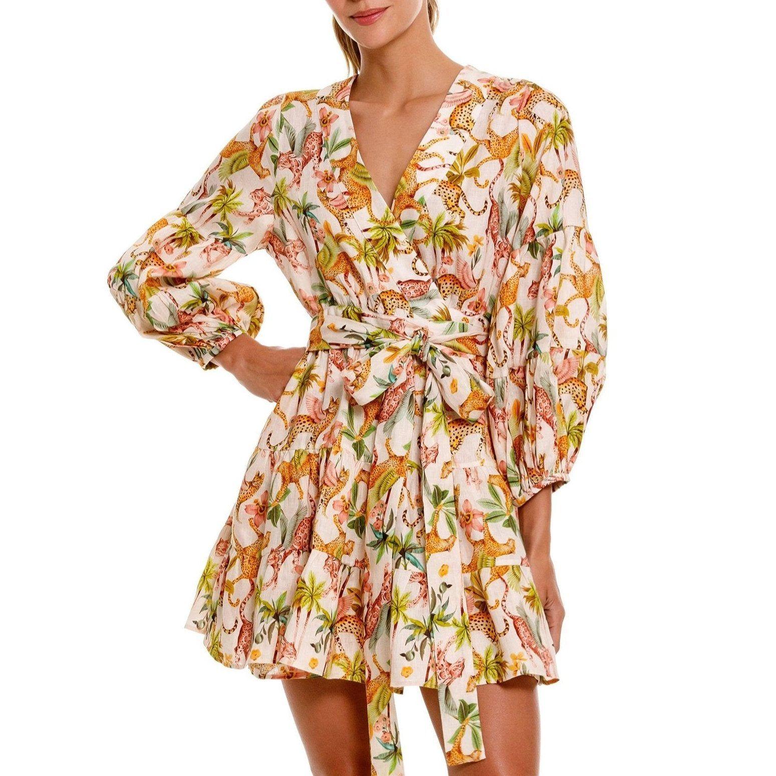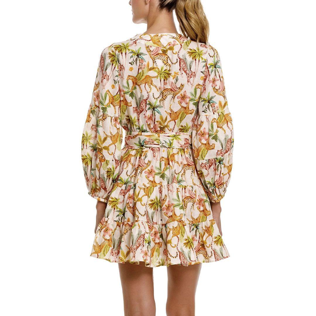 The Lazy Poet Eloise Pegasus 100% linen mini wrap dress with tie waist in a beautiful jungle theme print of leopards and palm trees.