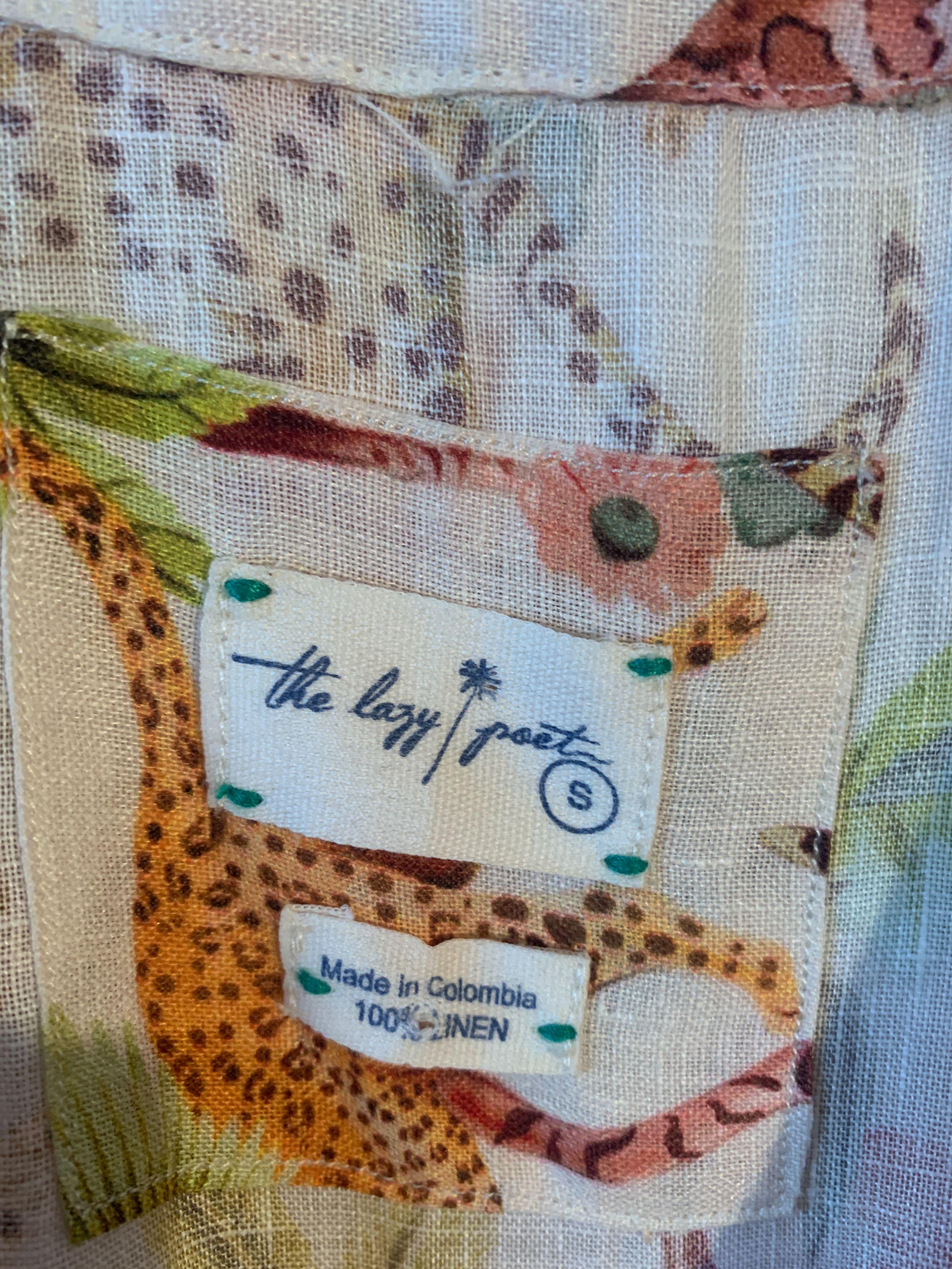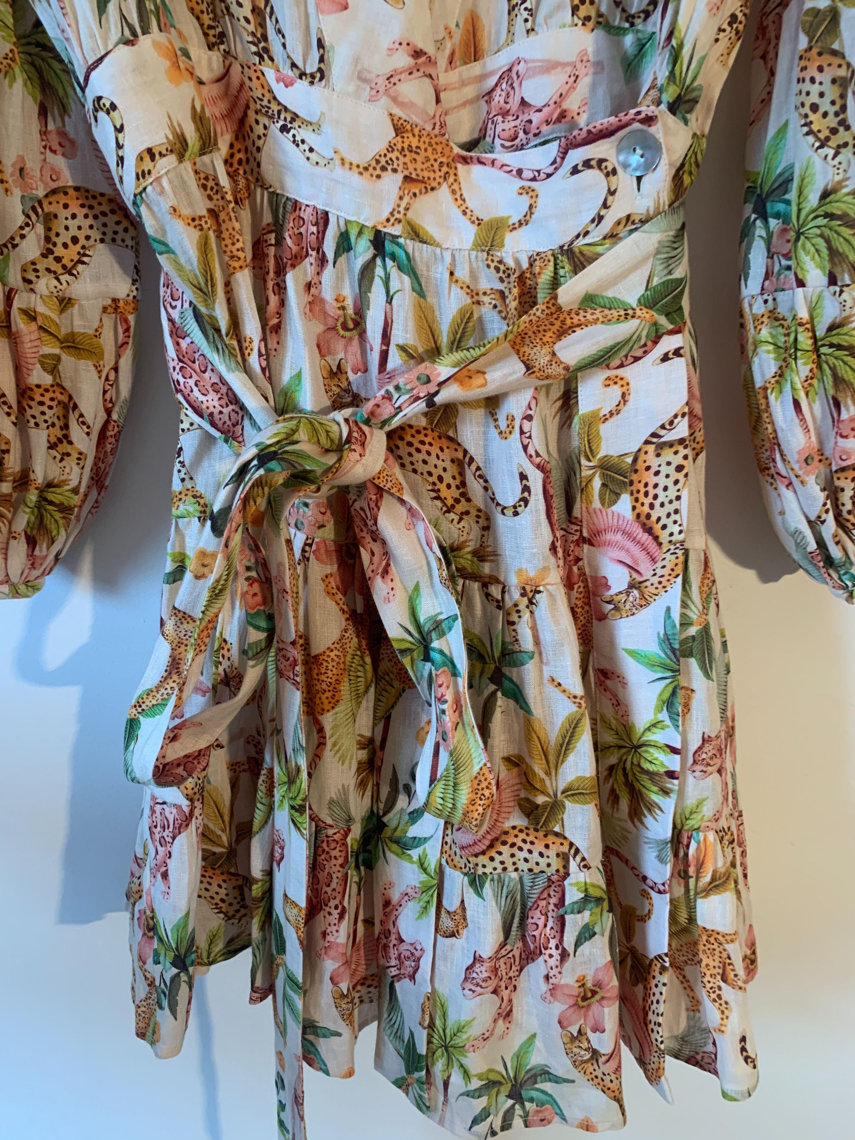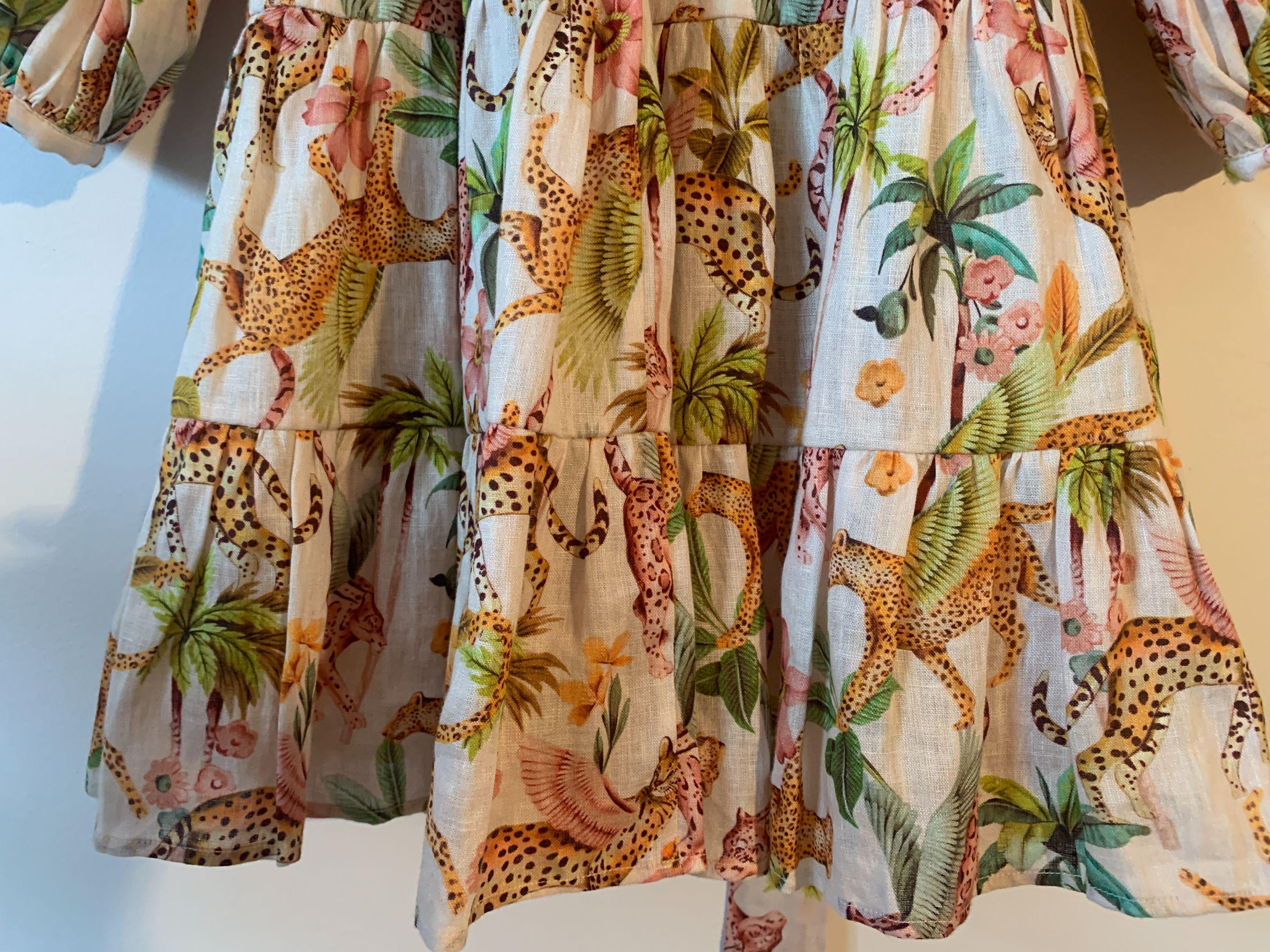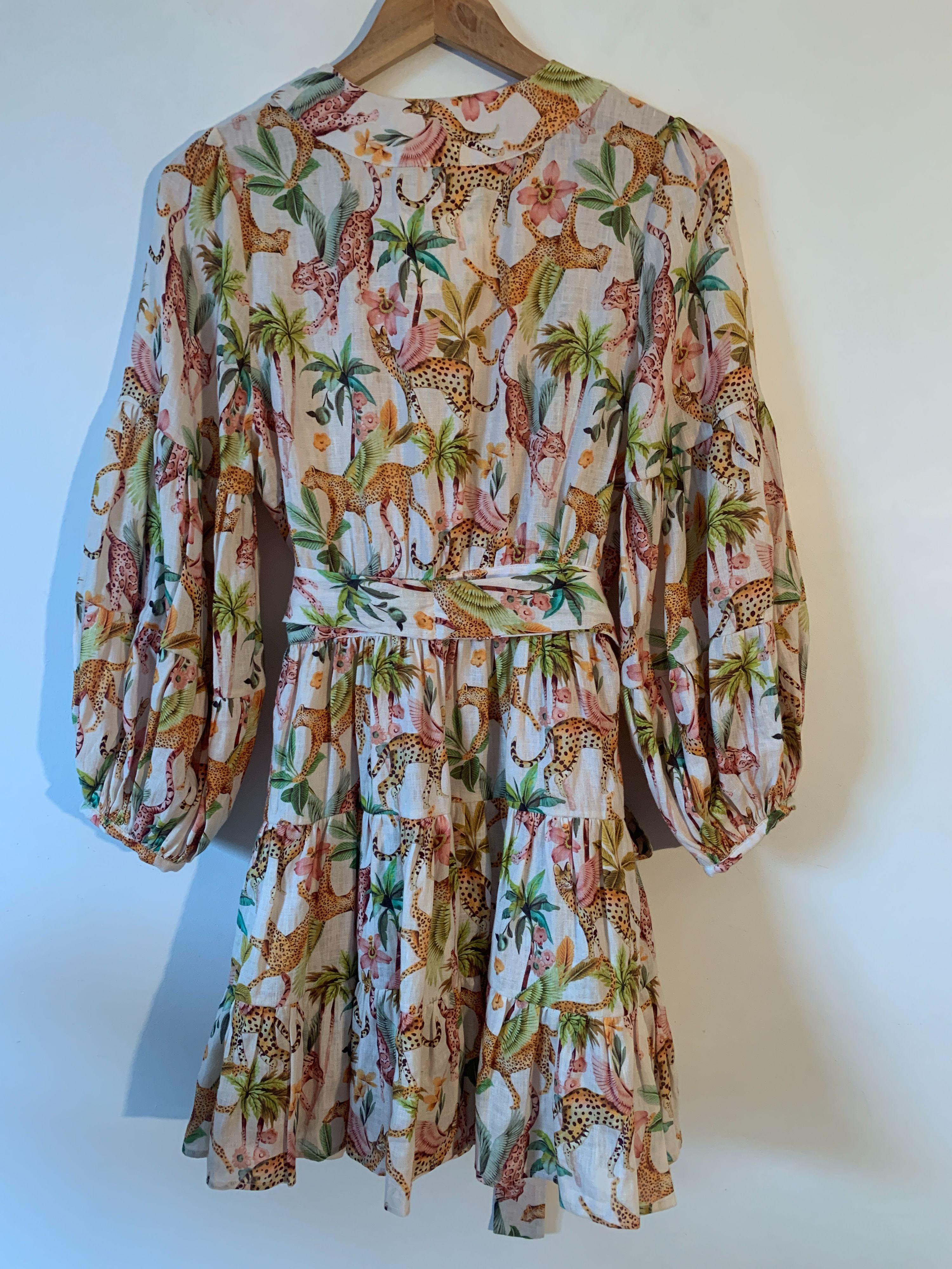 The Lazy Poet Eloise Pegasus 100% linen mini wrap dress with tie waist in a beautiful jungle theme print of leopards and palm trees.