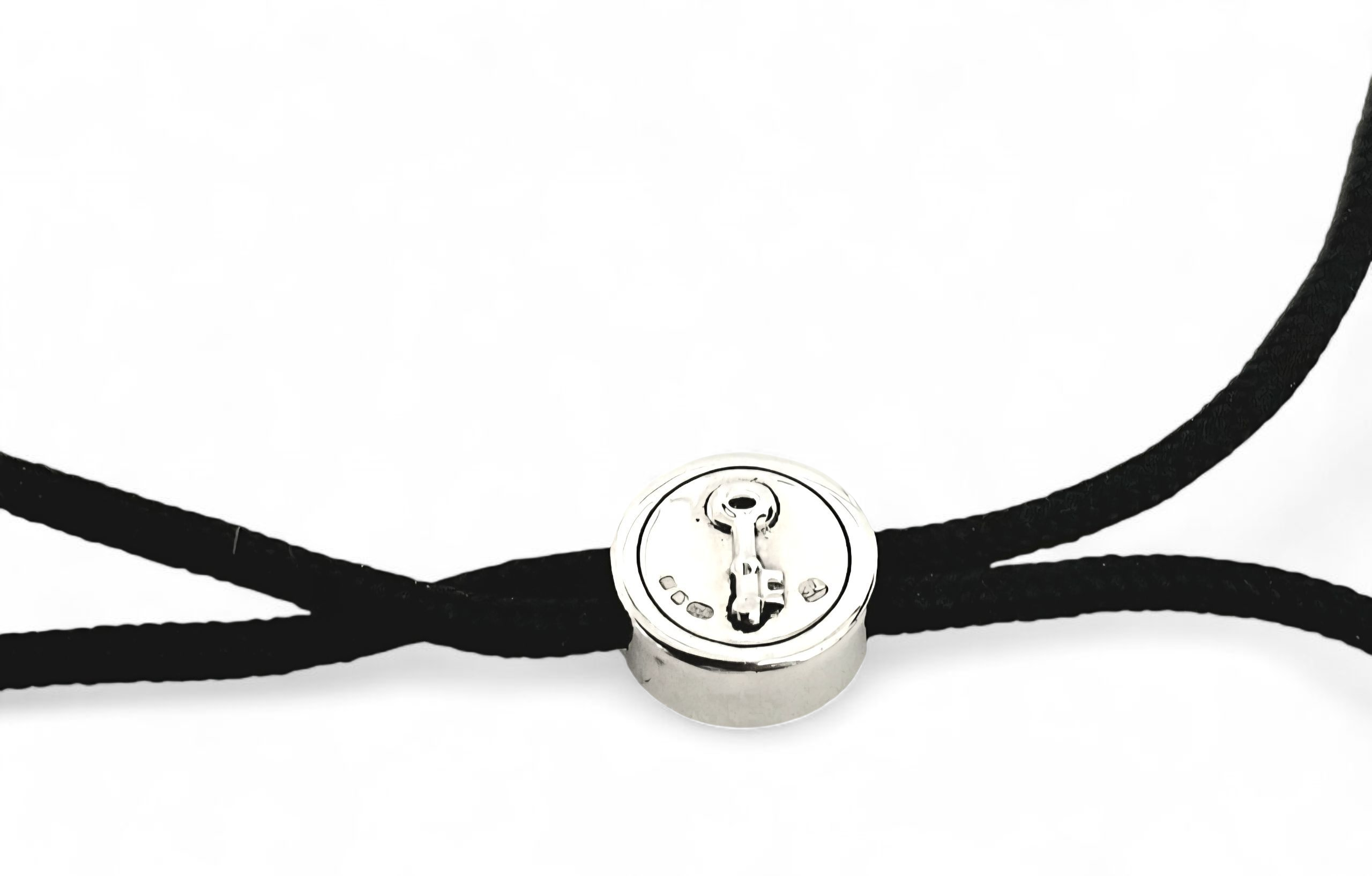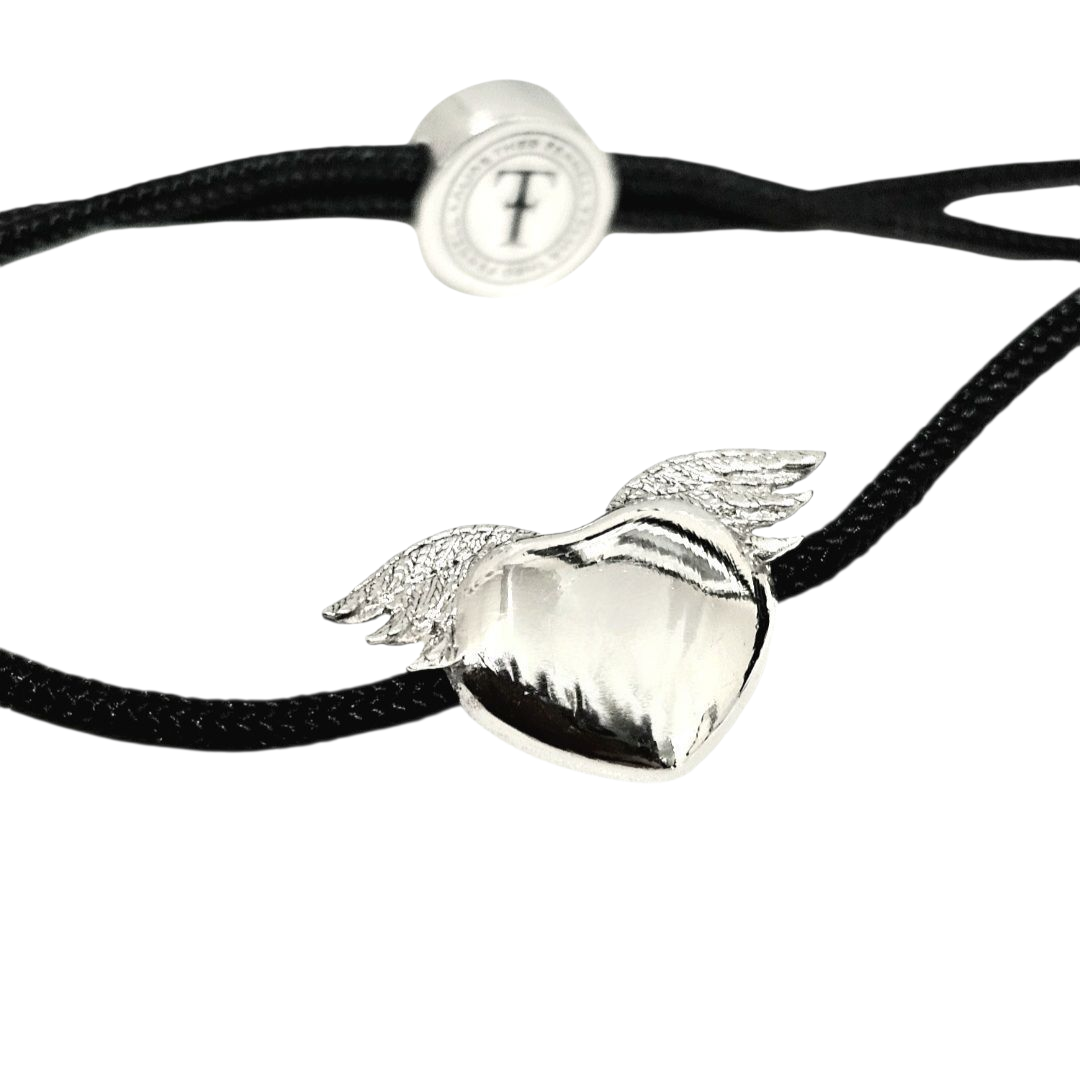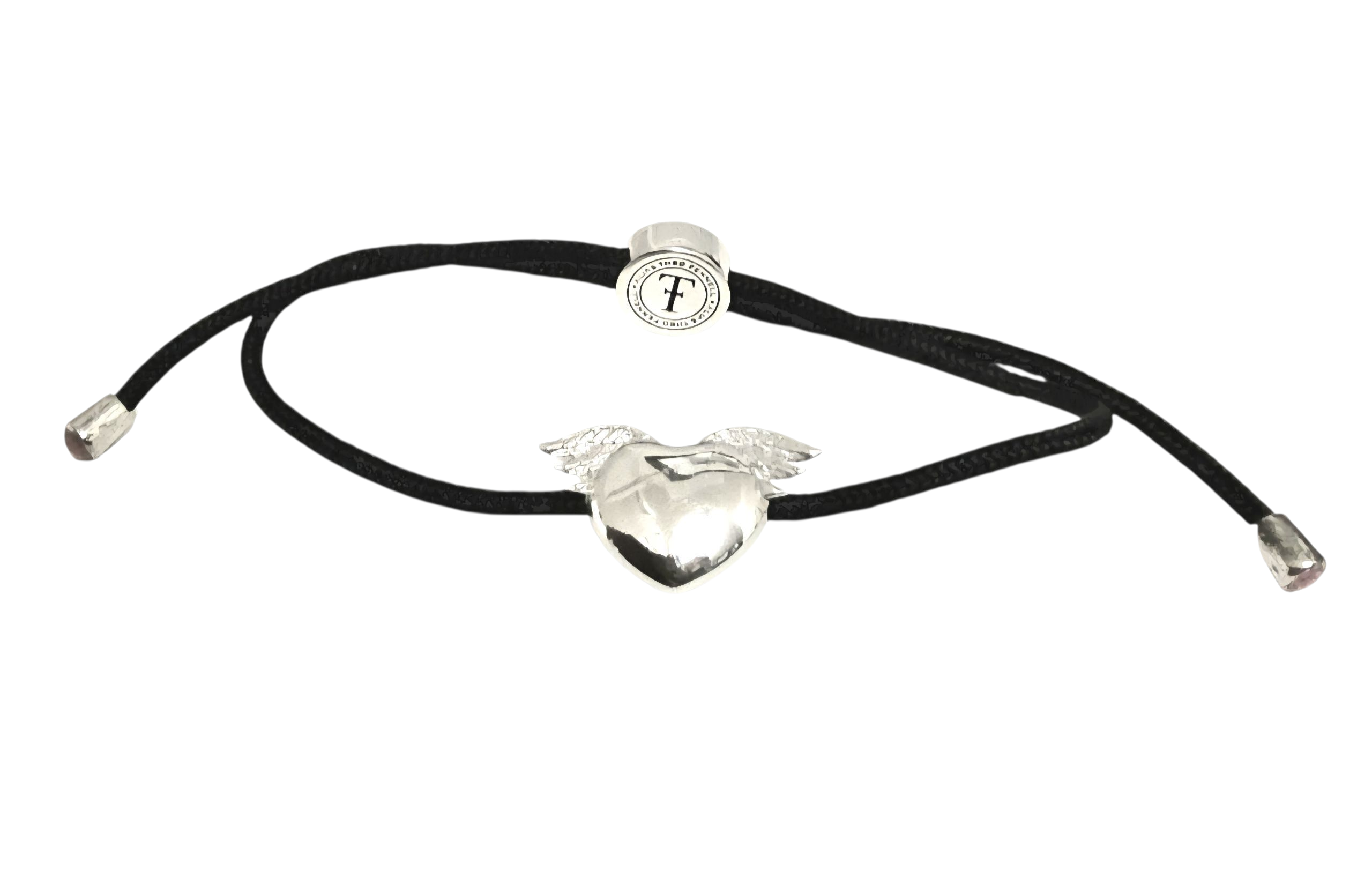 The sterling silver charm is one "Theo Fennell's" signature designs, a winged heart. Adjustable black cord bracelet.
