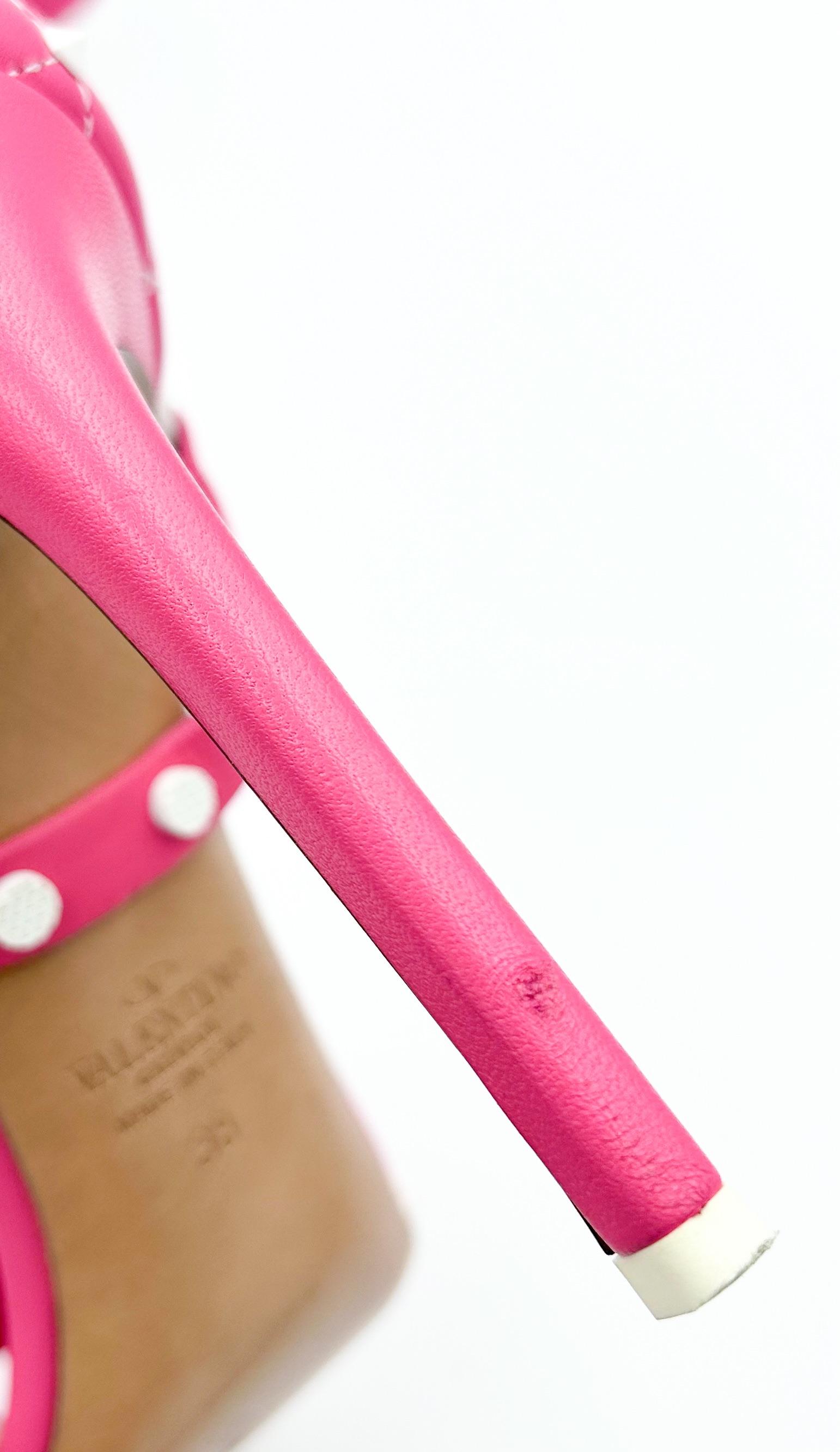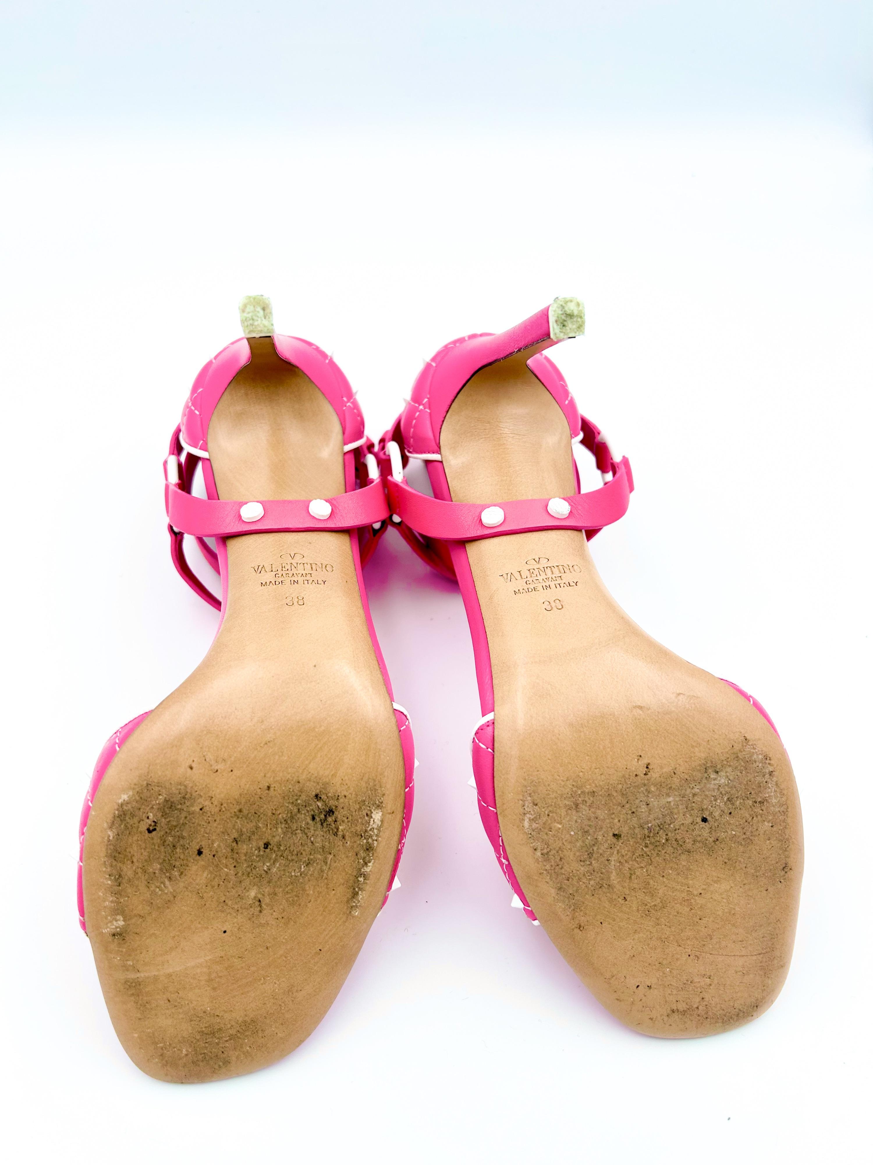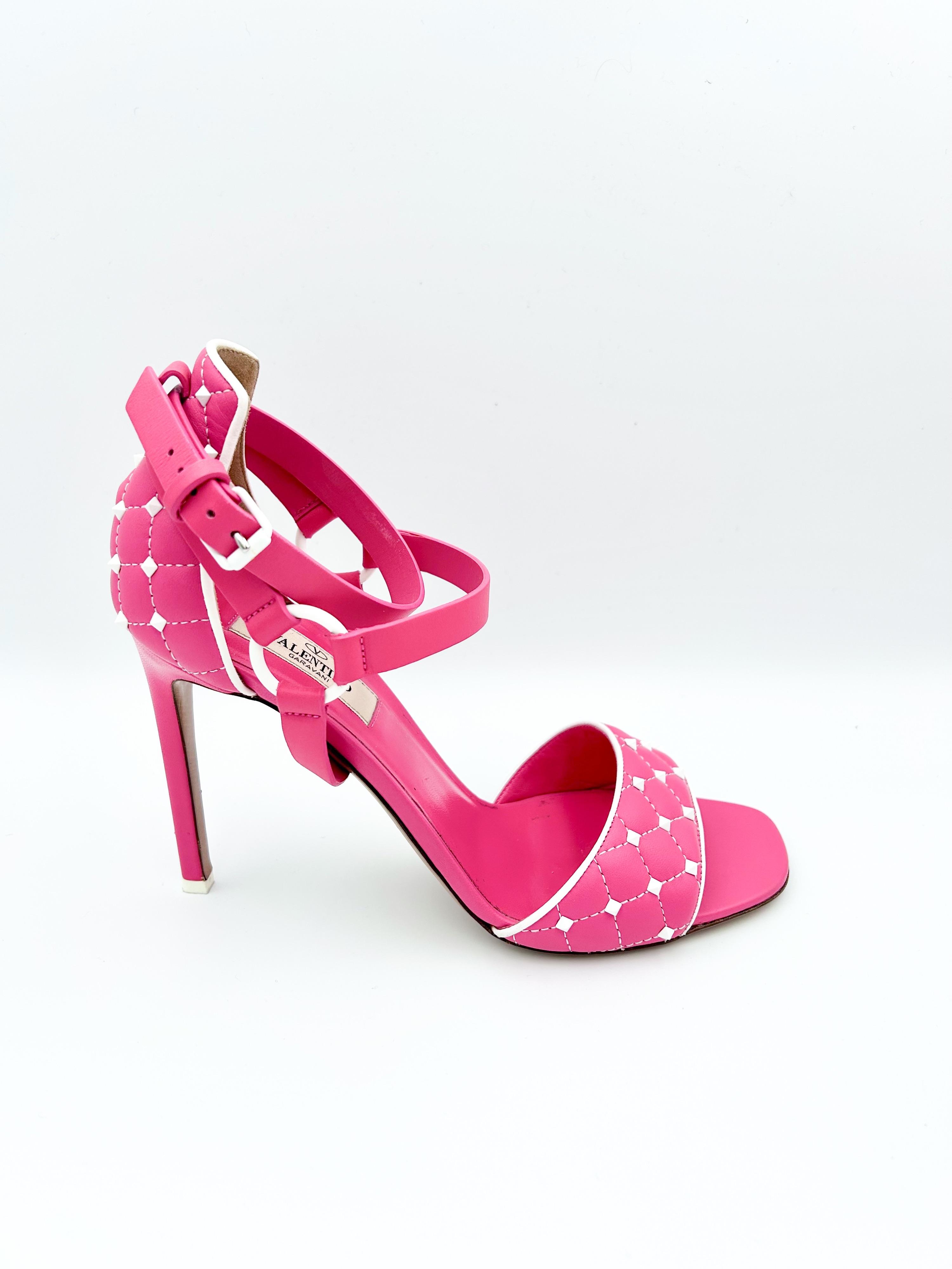 Valentino Garavani Rockstud Spike sandals crafted in vibrant bubblegum pink leather with contrasting white trim and the house’s signature Rockstud embellishments. Presented in excellent preloved condition.