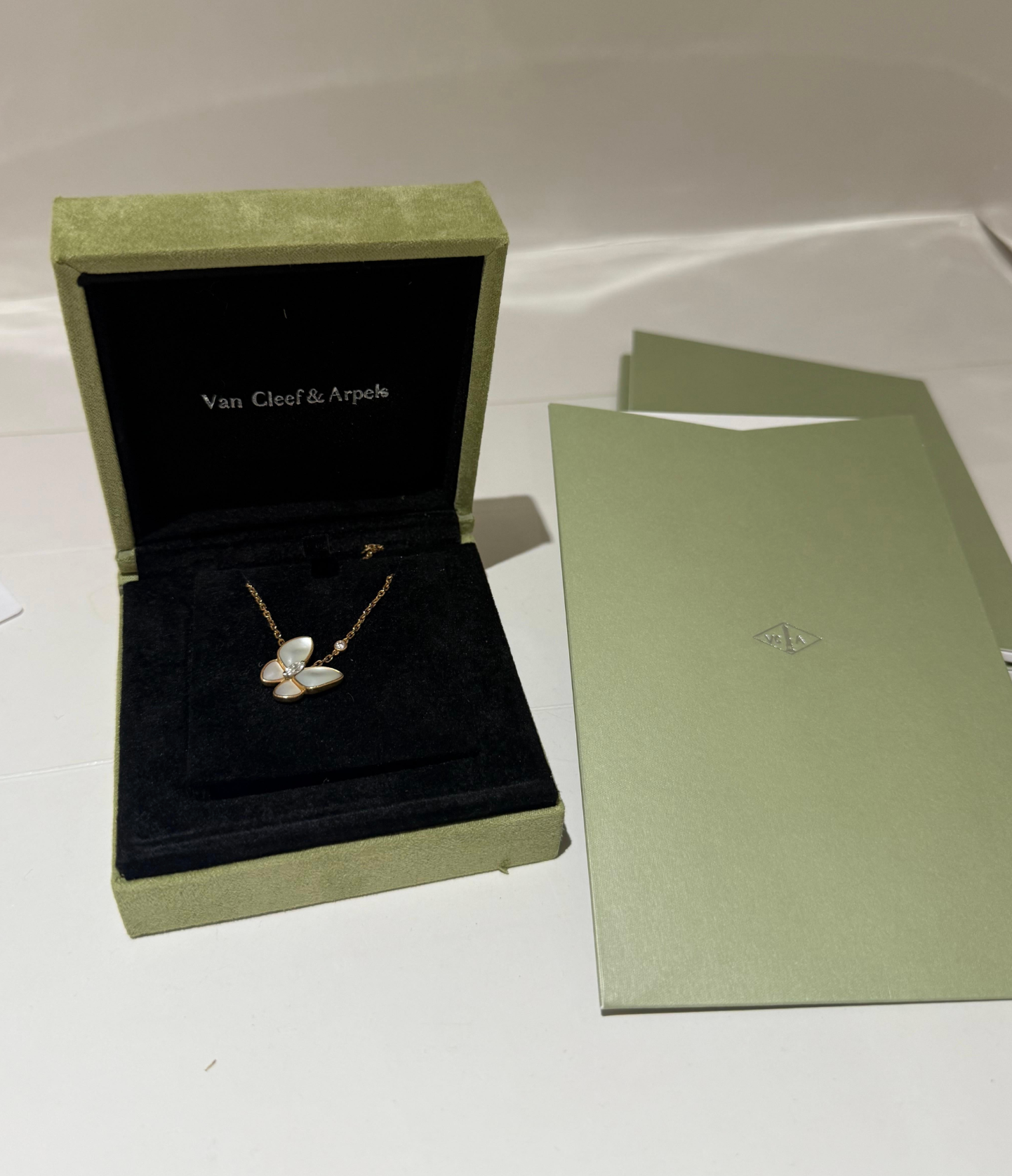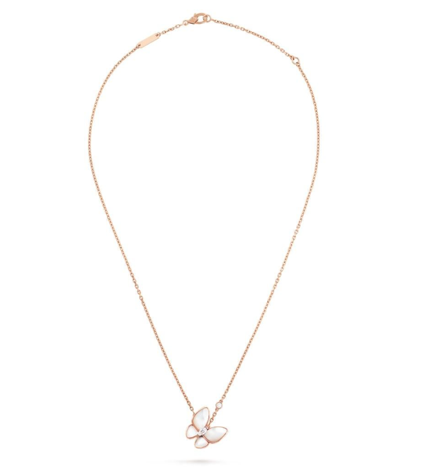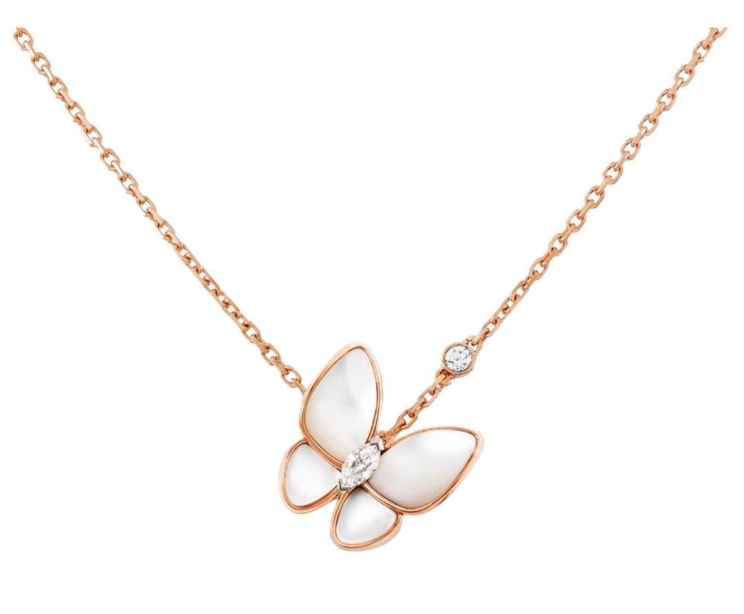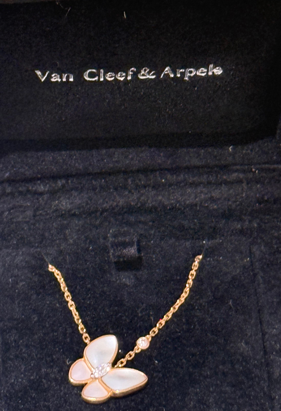Van Cleef & Arpels Butterfly pendant in 18K rose gold with white mother-of-pearl, round diamond, and a marquise diamond, diamond quality DEF, IF to VVS.