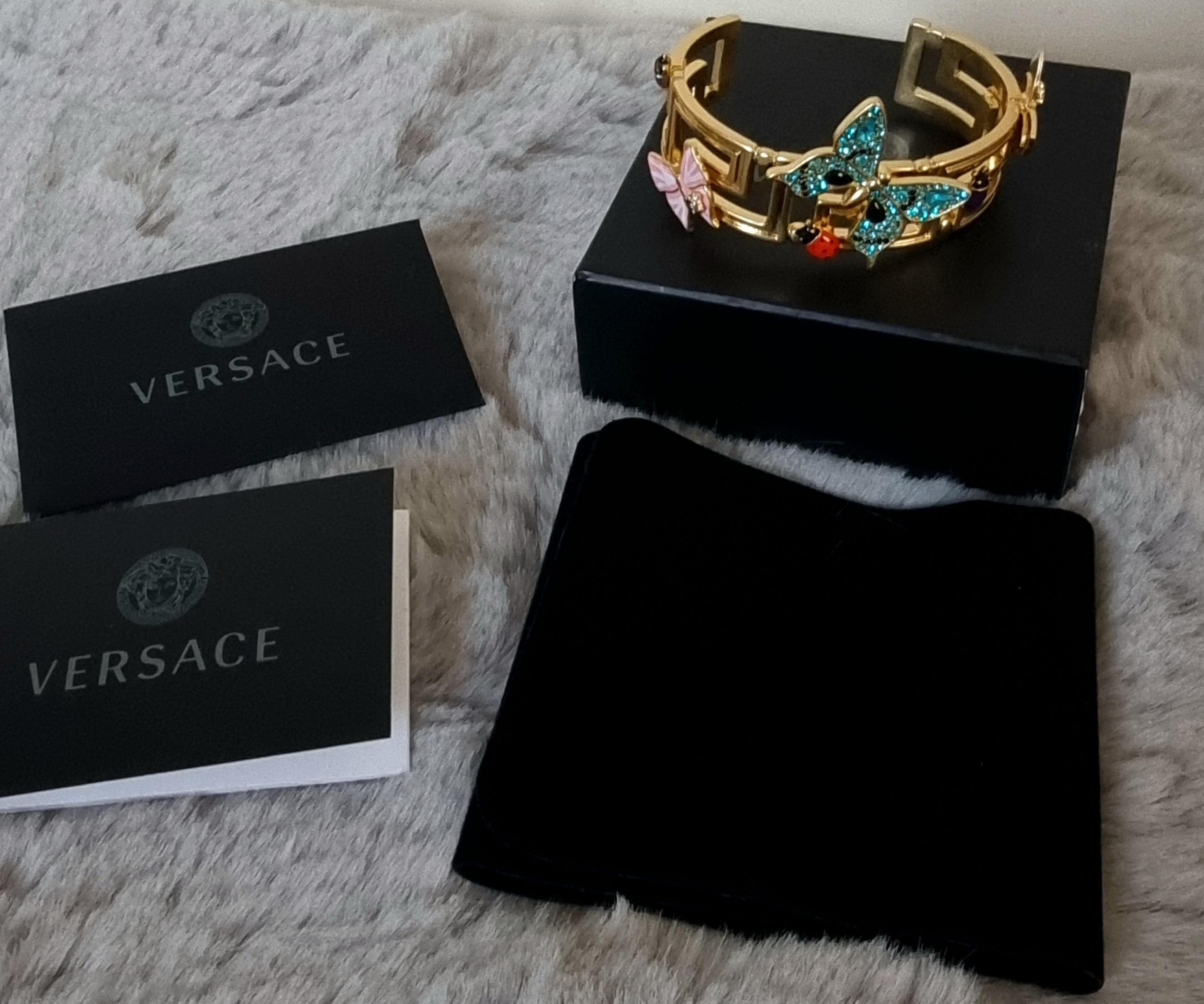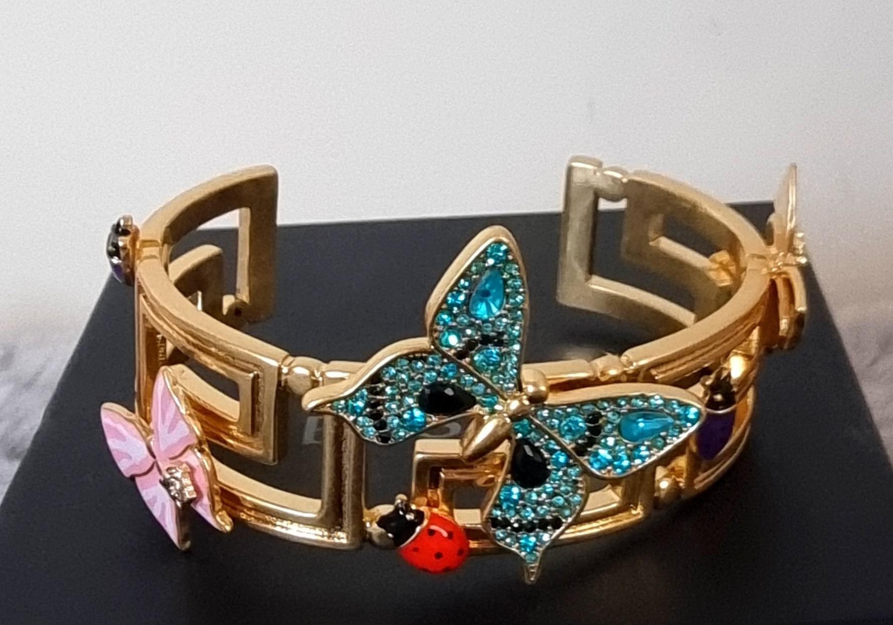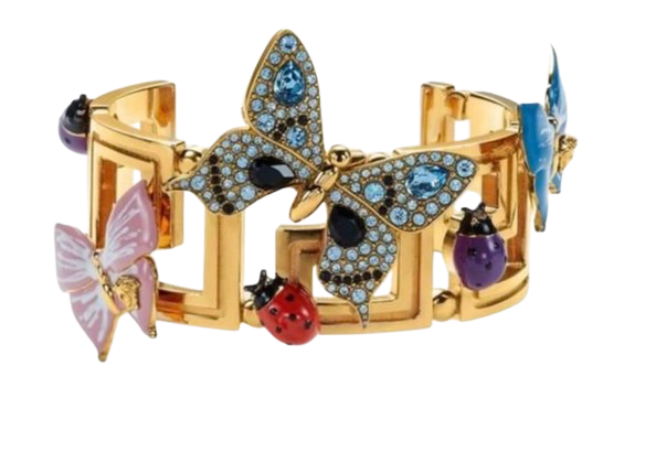 Part of Versace’s collaboration with Dua Lipa, the gold-tone Greca base of this cuff bracelet is embellished with handcrafted crystal butterflies and enamelled ladybugs in a 3D nod to an original '90s print.