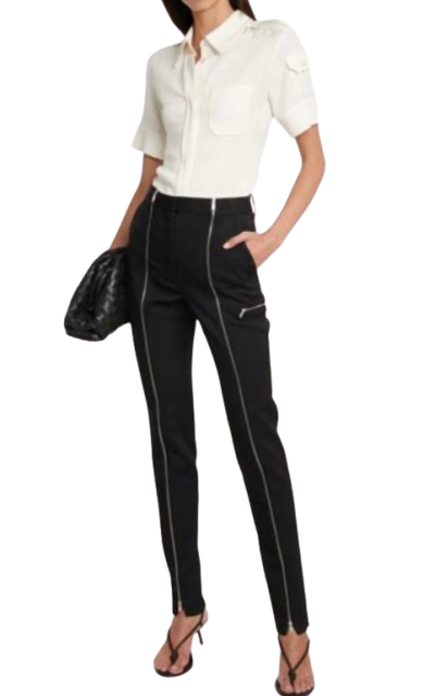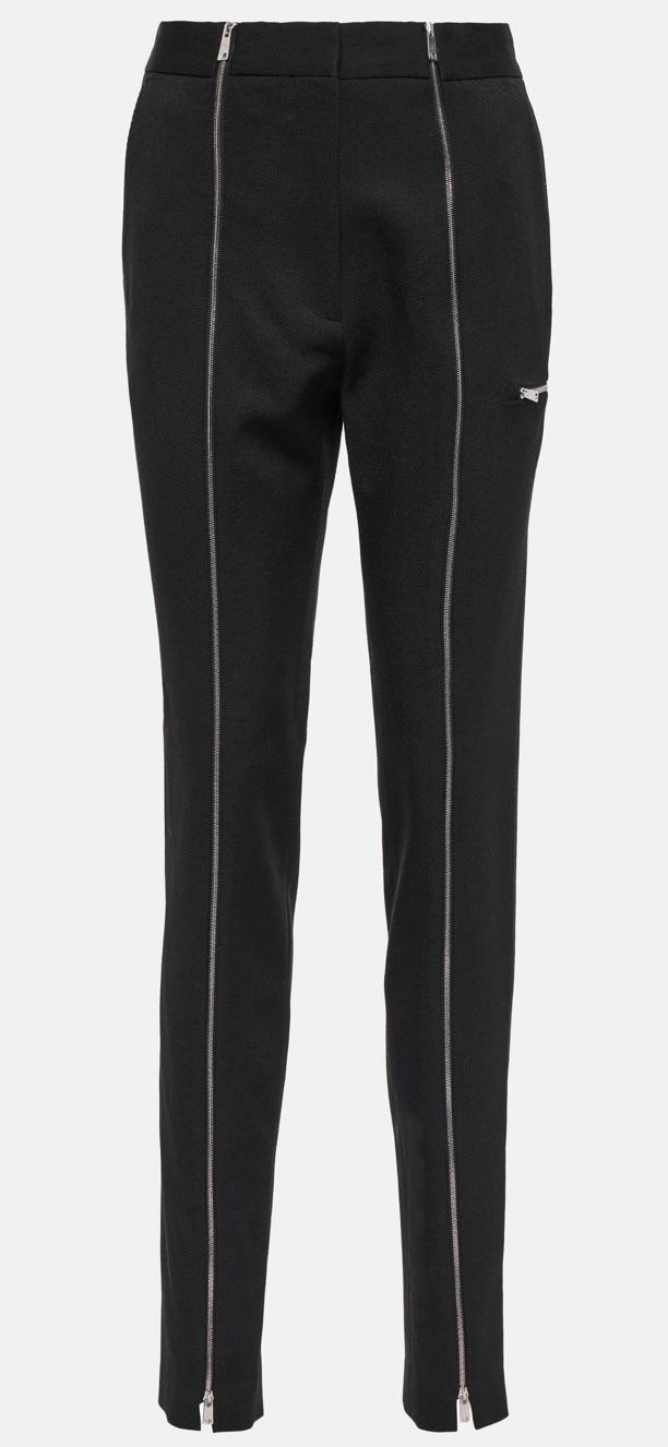 Victoria Beckham Zipped high rise slim wool pants. Tailored to a streamlined high rise silhouette with slim legs further embellished by the addition of silver toned two way zips running down the seam of each leg, allowing you to create split cuffs. Regular fit high rise waist, concealed button, hook and eye and zip-fly fastening at front, belt loops, side slit pockets, back welt pockets and zipped pocket at side 100% wool.
