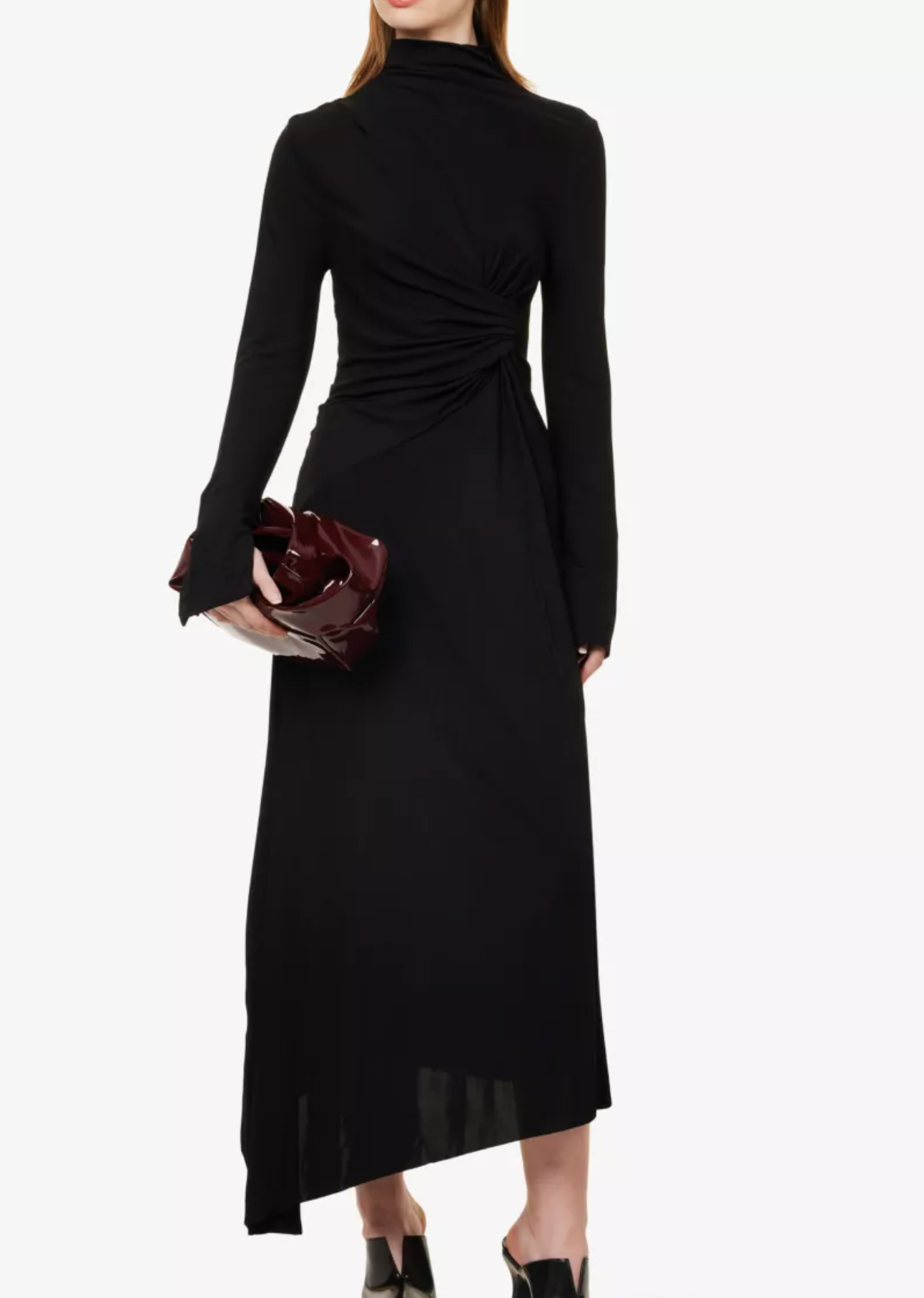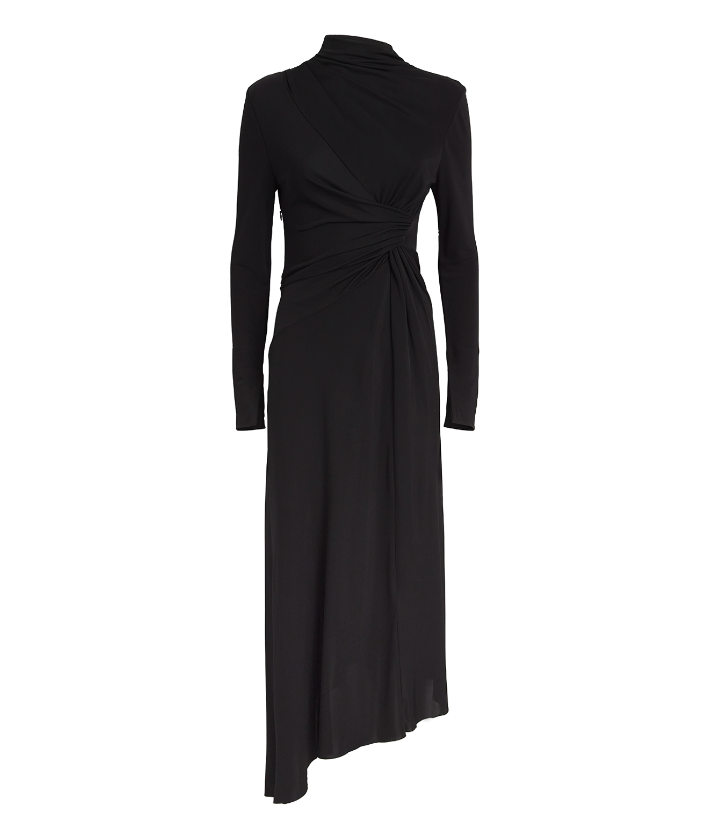 Slim fit, high neck, long sleeves, ruched at shoulder and front, asymmetric hem
