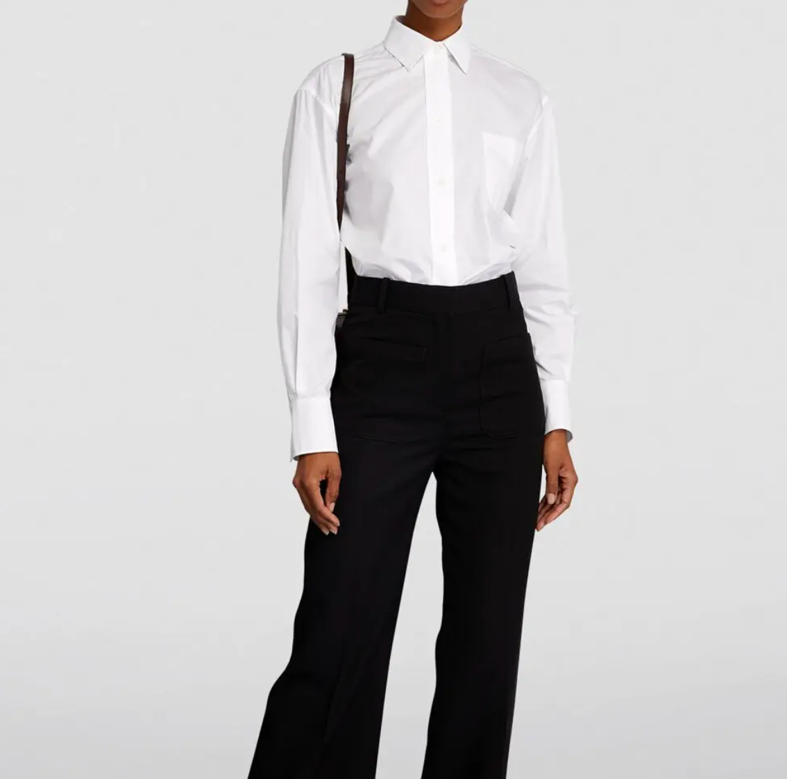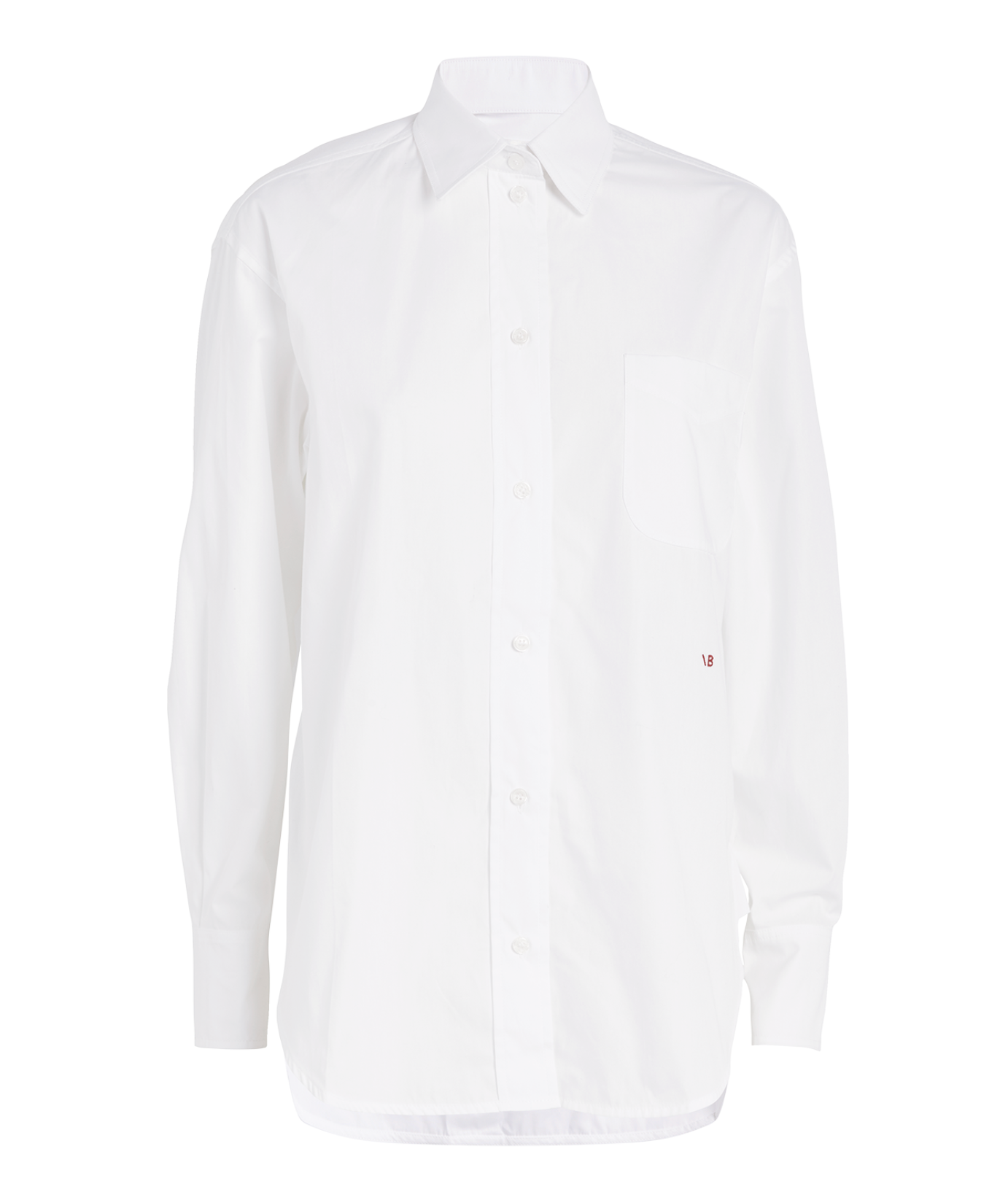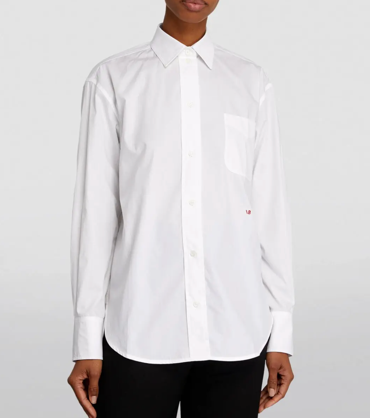 This button-down shirt from Victoria Beckham is inspired by menswear, featuring an oversized fit, pointed collar, drop shoulder, and long sleeves. The silhouette creates a relaxed yet sartorial style that nods to sophisticated tailoring and includes a chest pocket.