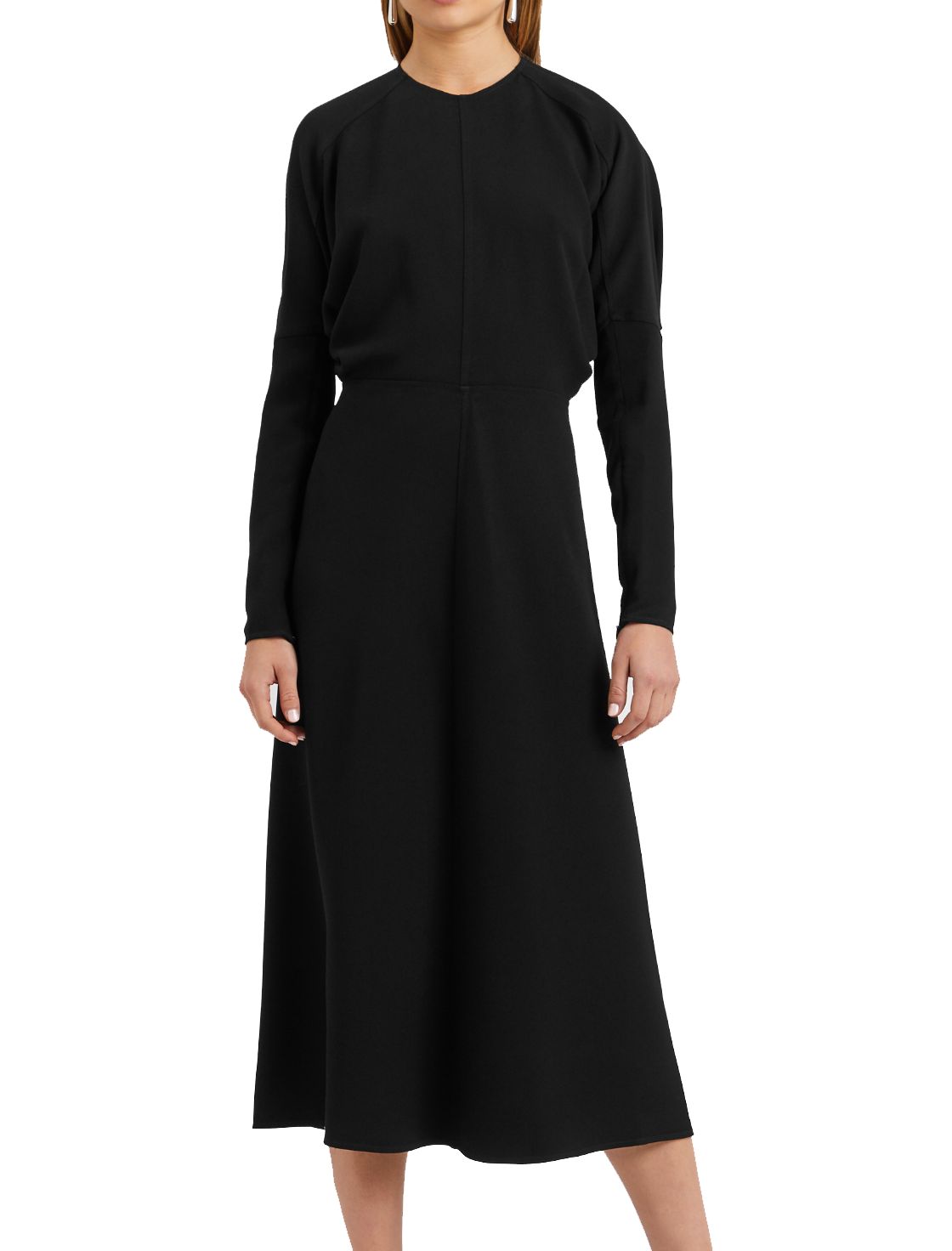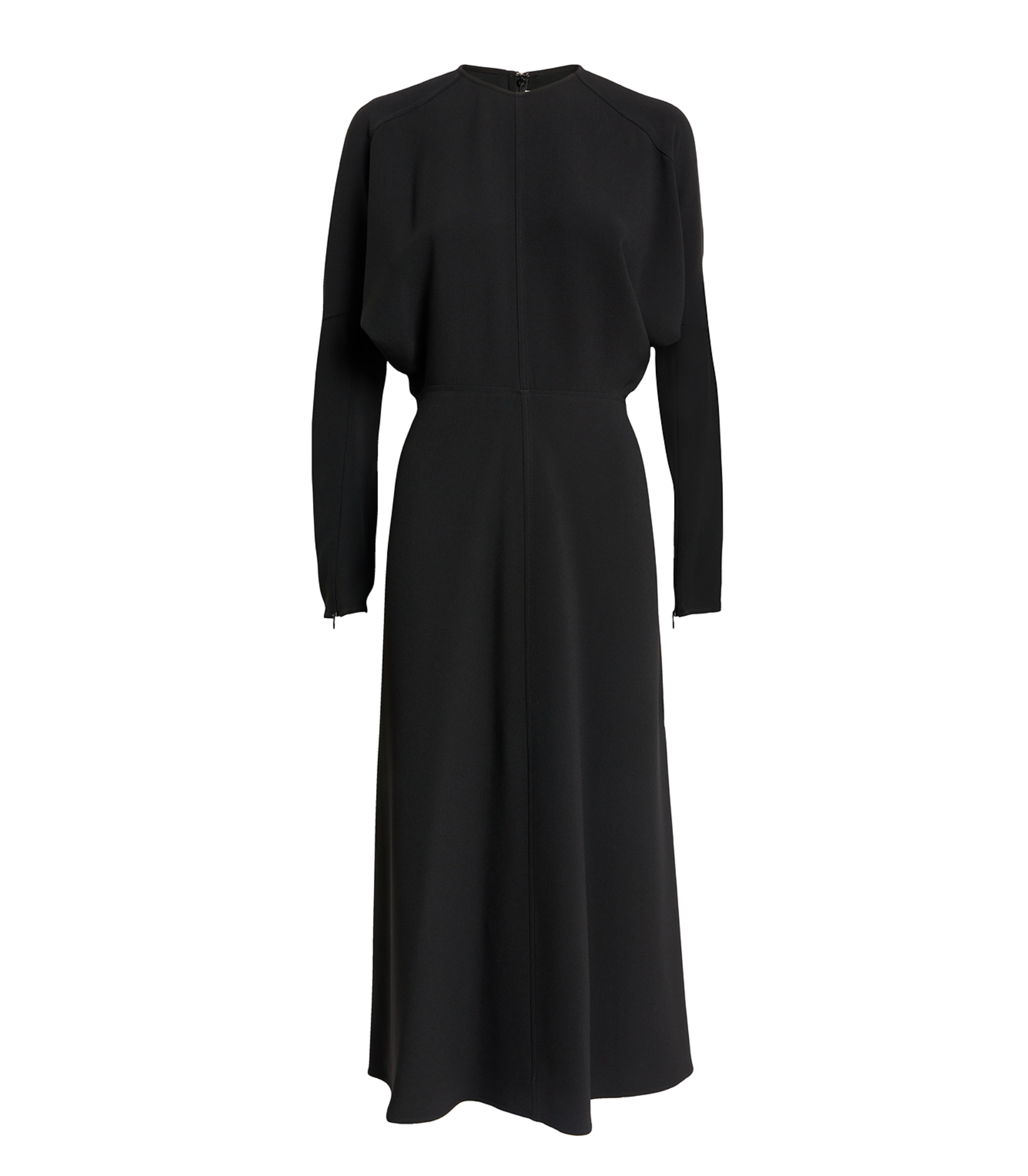 Round-neck, dolman batwing sleeves, concealed zip fastenings at cuffs, panelled