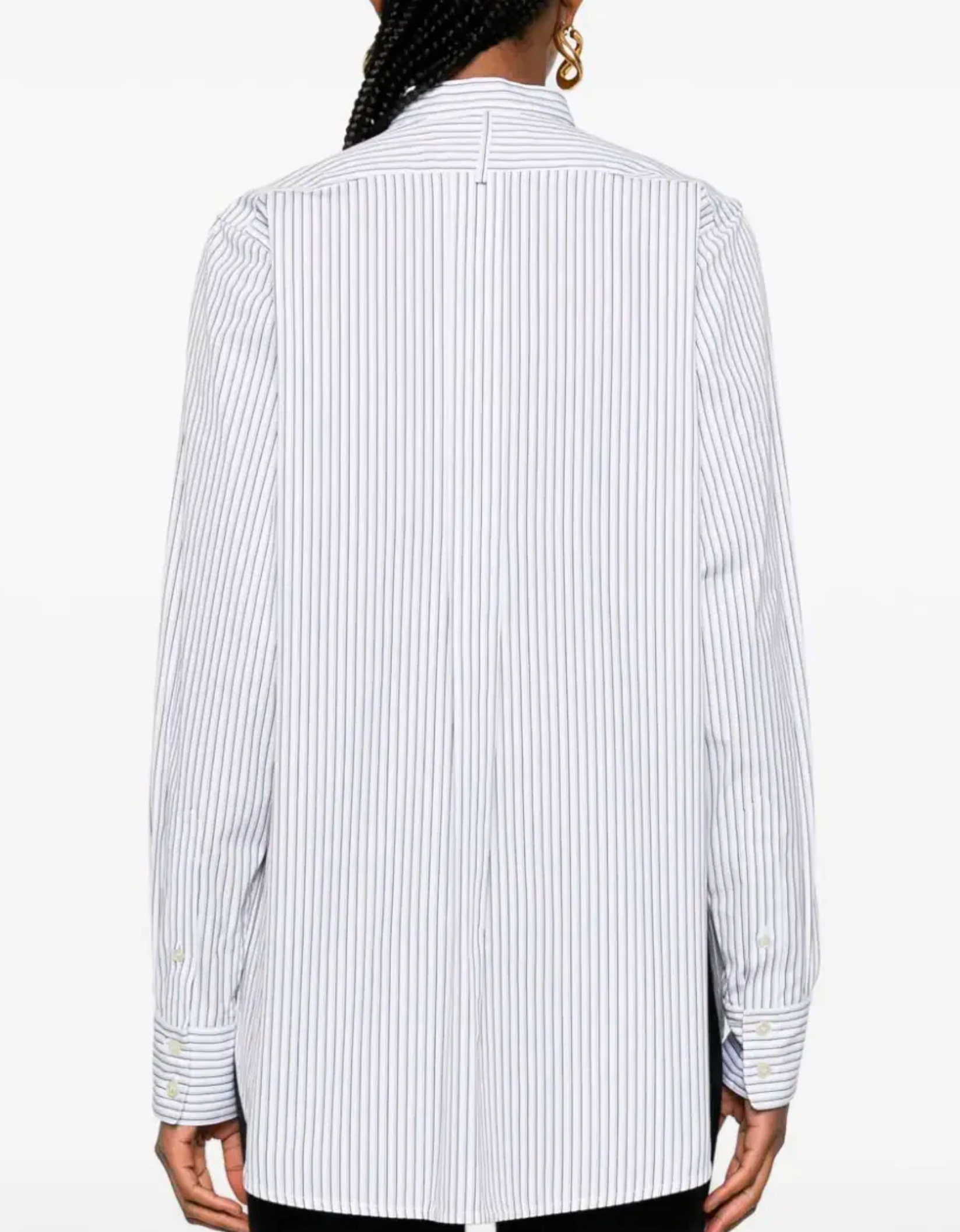 Victoria Beckham´s striped shirt, crafted in white and black cotton. Featuring a vertical stripe print, collarless, front button placket, long sleeves and buttoned cuffs.