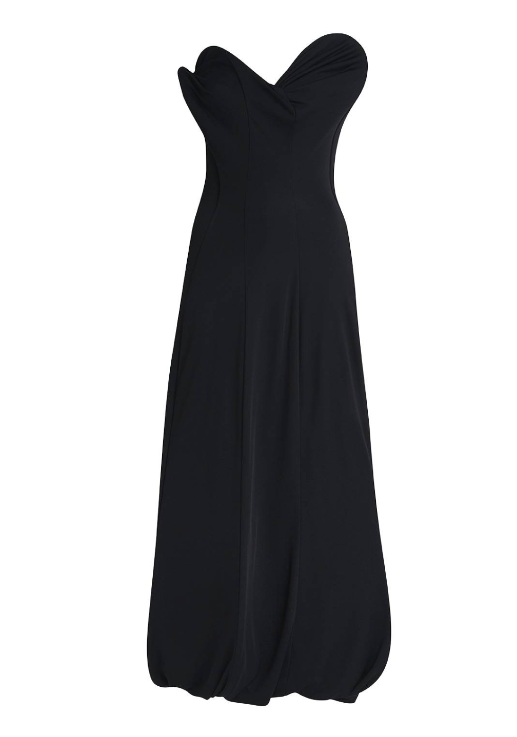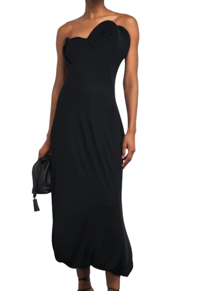 This structural gown from Victoria Beckham takes the form of a blooming flower with its bulbous hem and tactile boning construction. These elements culminate in a floor-kissing length.