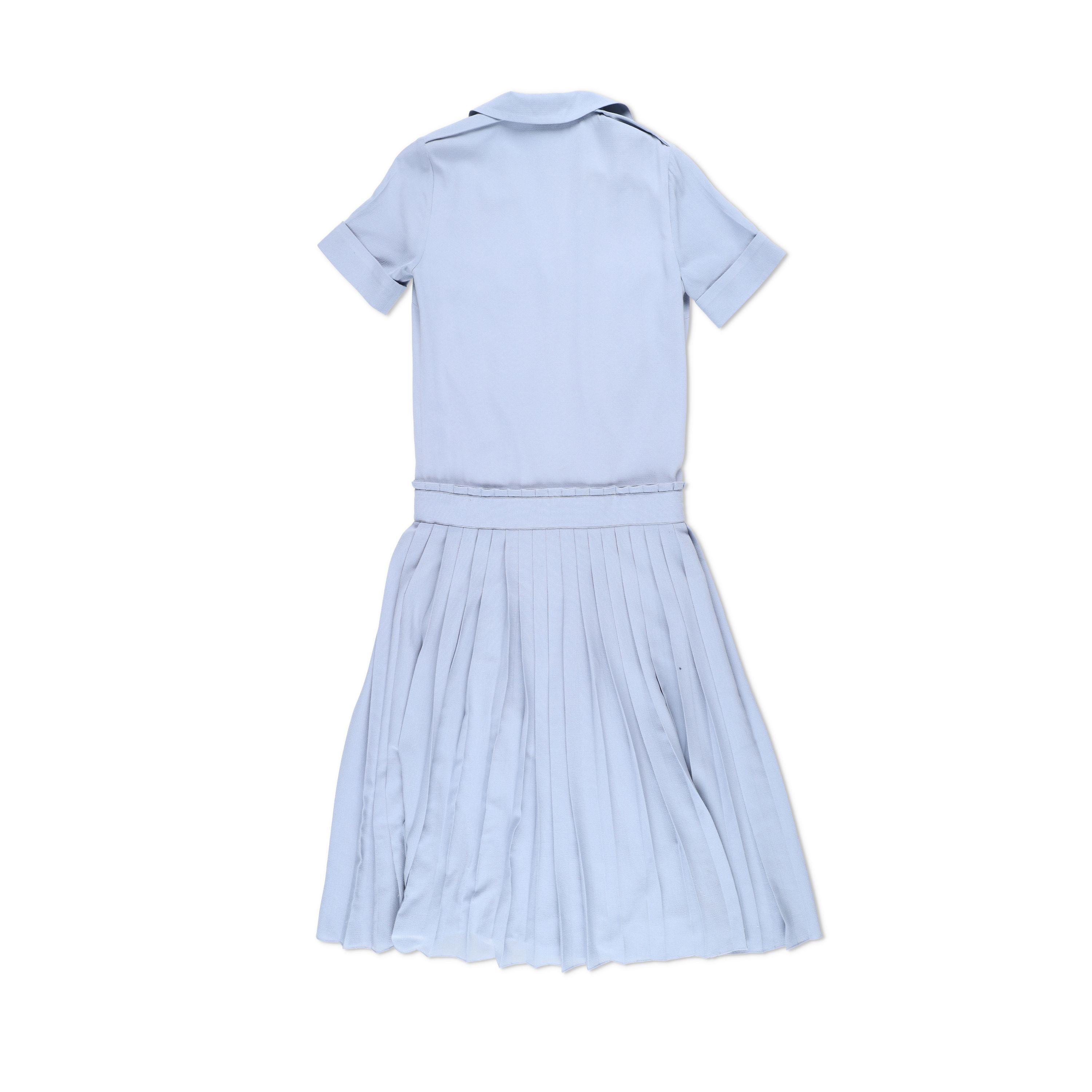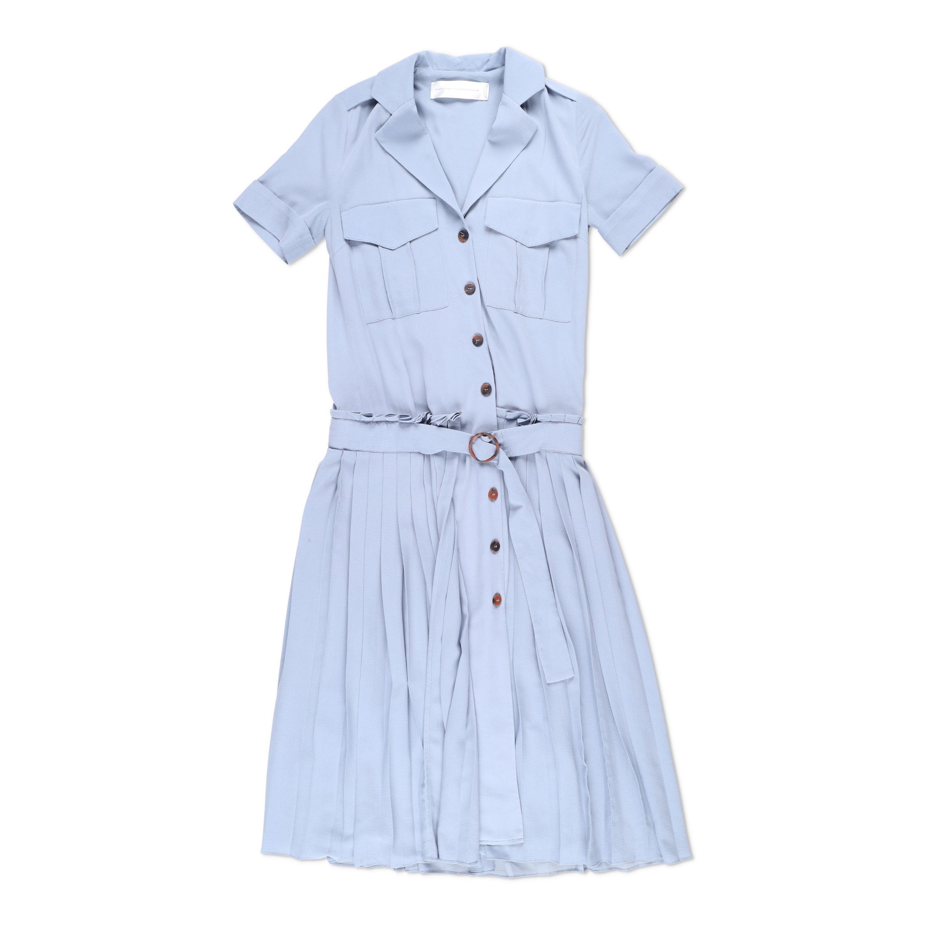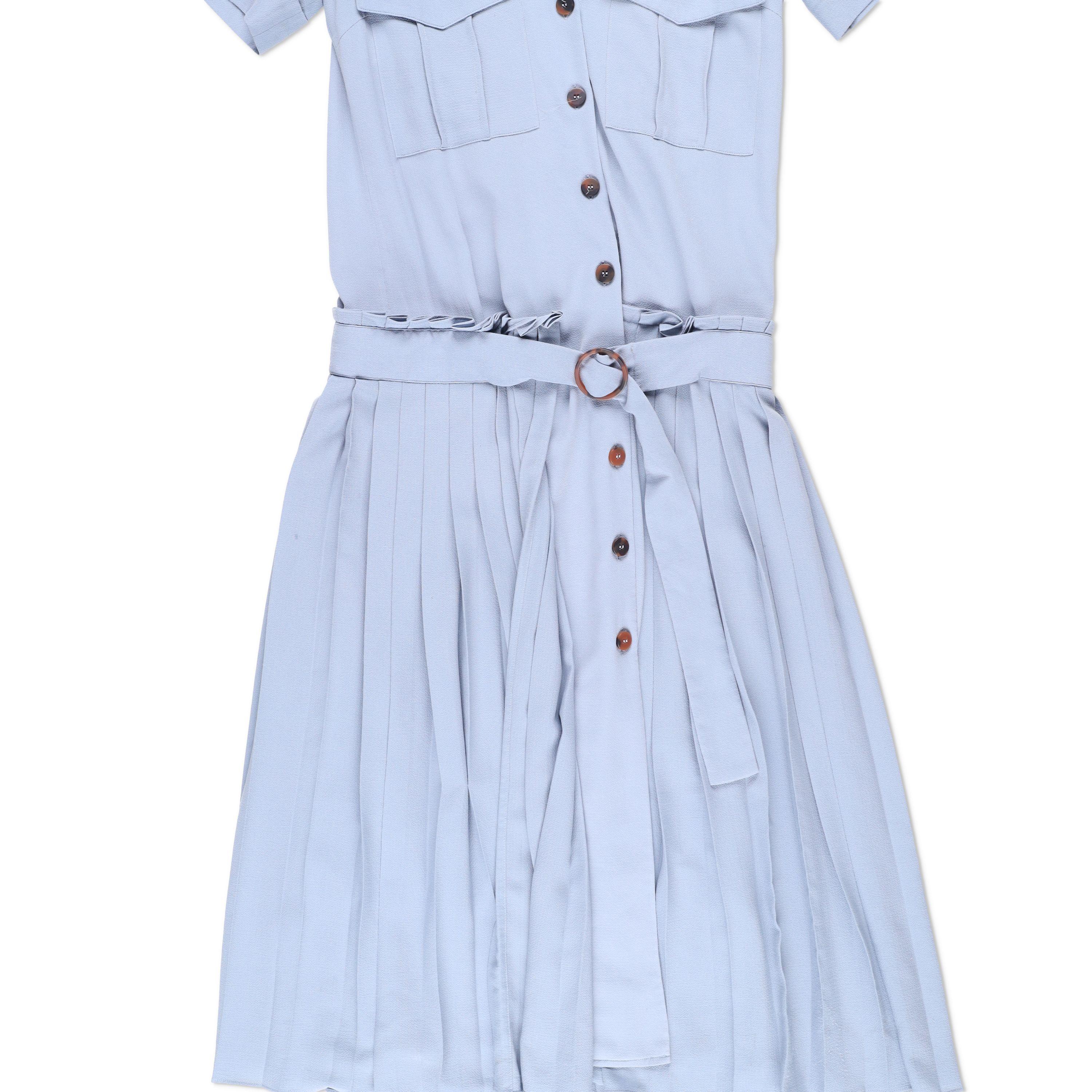 This elegant light blue dress features a classic shirt-dress silhouette with short sleeves and a soft collar. The top includes two front flap pockets and a full button-down closure with wooden-style buttons. The waist is accented by a matching fabric belt with a round buckle for a flattering, adjustable fit. The skirt has delicate pleats that add movement and a feminine touch.