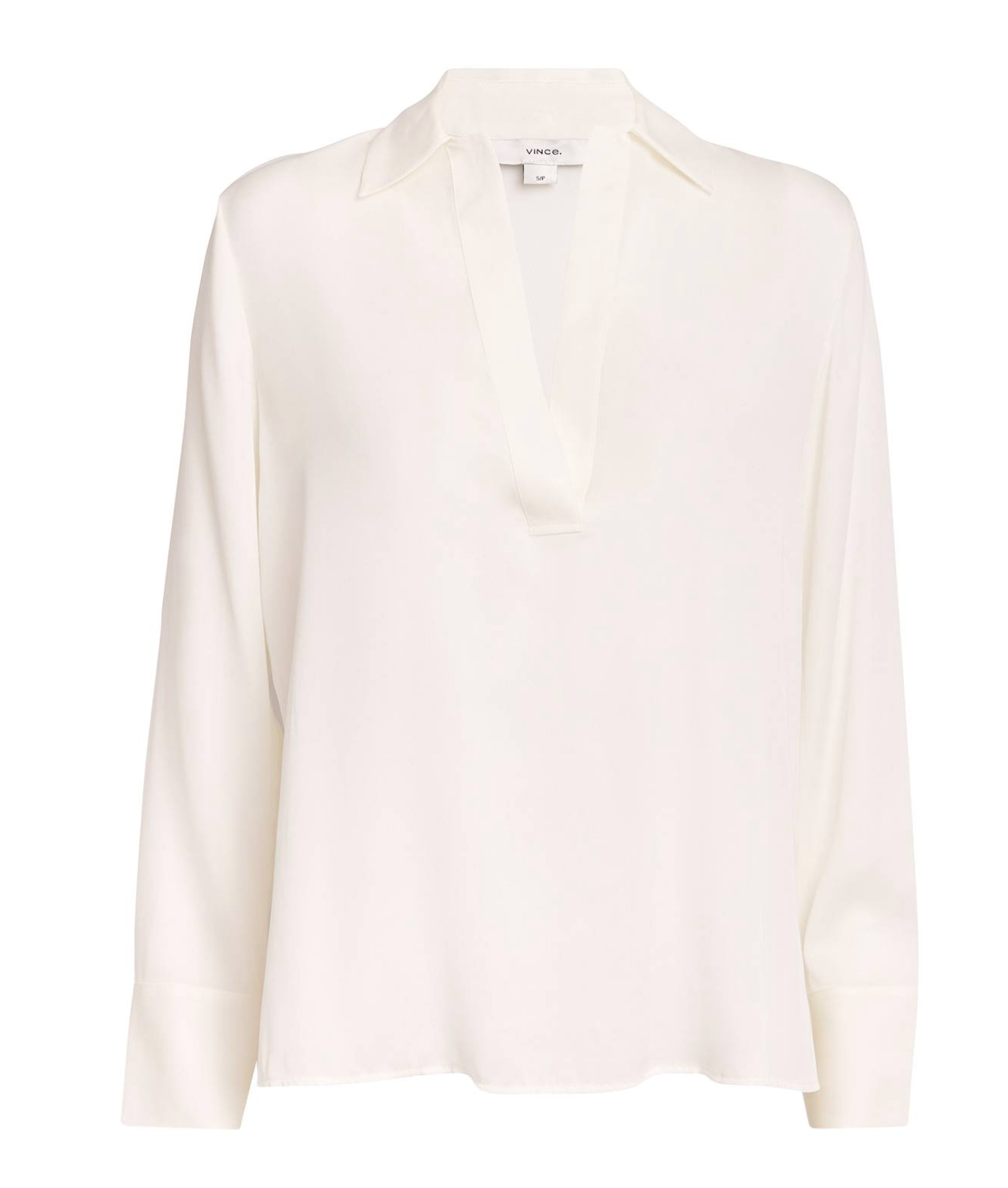 The Vince Pullover Long Sleeve Polo in off white is a staple throughout the year, cut from soft silk woven with a hint of stretch. It pairs beautifully with denim, skirts, and more.