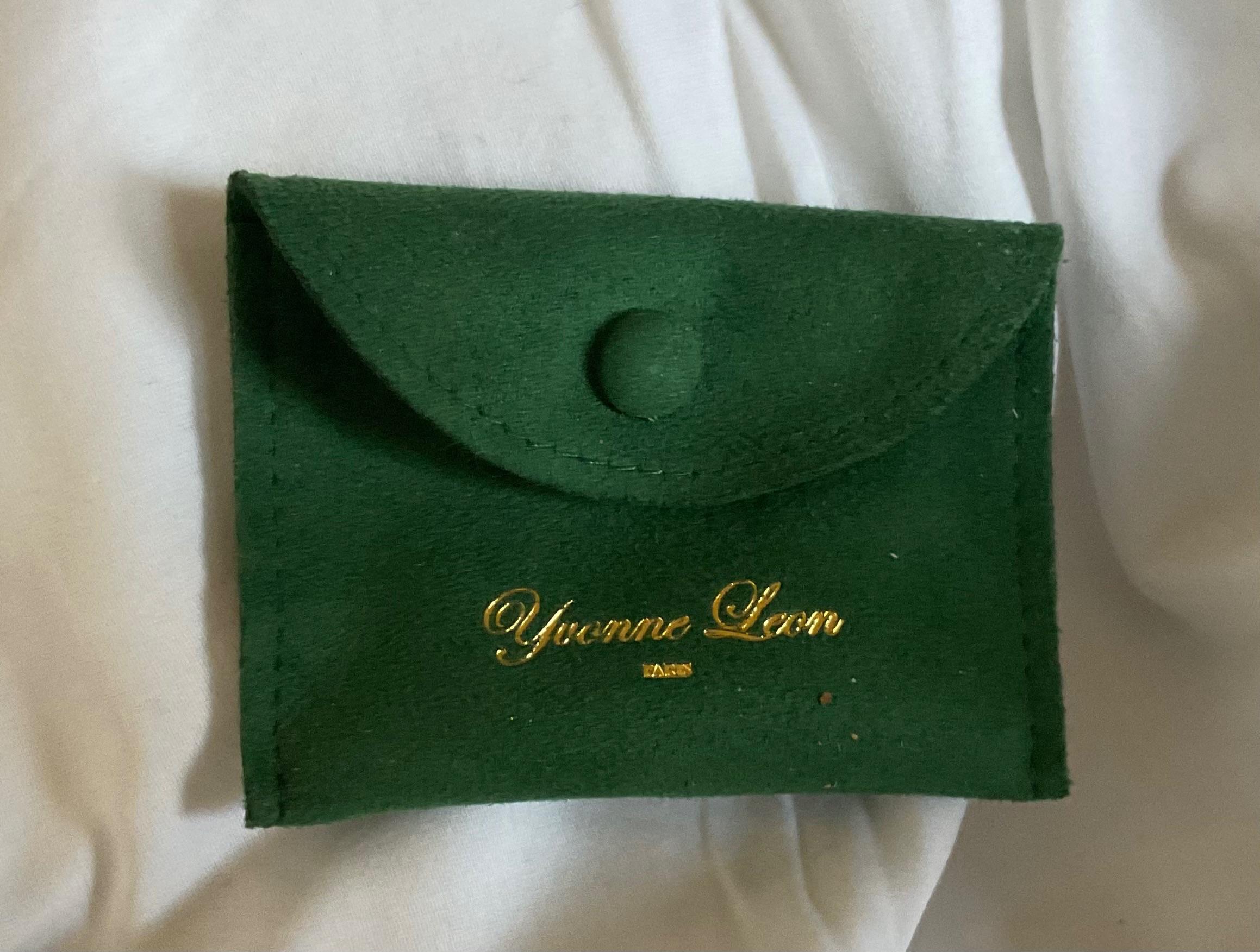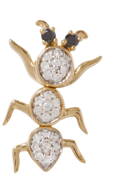 Single Yvonne Leon Diamond Ant stud. Handmade from solid 9 ct gold and illuminated with grey ( although appear white) and blackened diamonds. Purchased from Liberty of London for £1055 and worn once. Measurements 0.6 x 0.4 inches. Weight 1 g approx. Diamonds 0.07 ct, black diamonds 0.03 ct. The black colour of the round cut ant eye diamonds is the result of dyeing. Superb piece but I won’t wear it again. Receipt, box and pouch included. Earring immaculate, slight fading to box from storage.