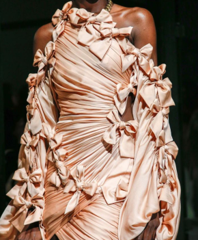 - Cold shoulder design with 3D silk bow appliqués throughout.